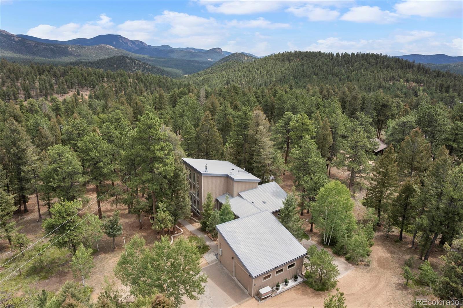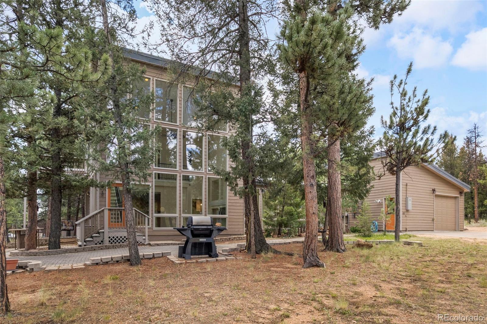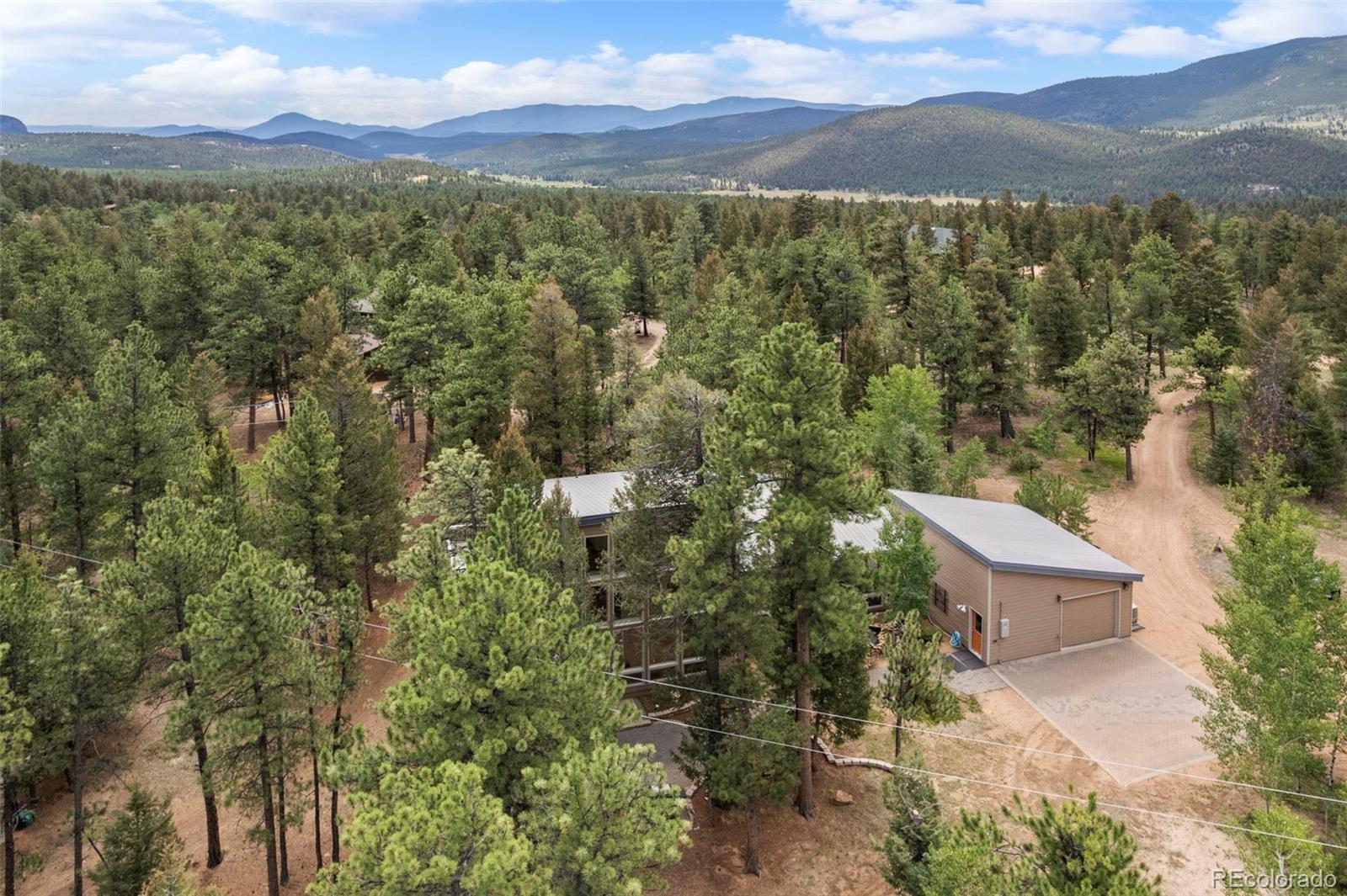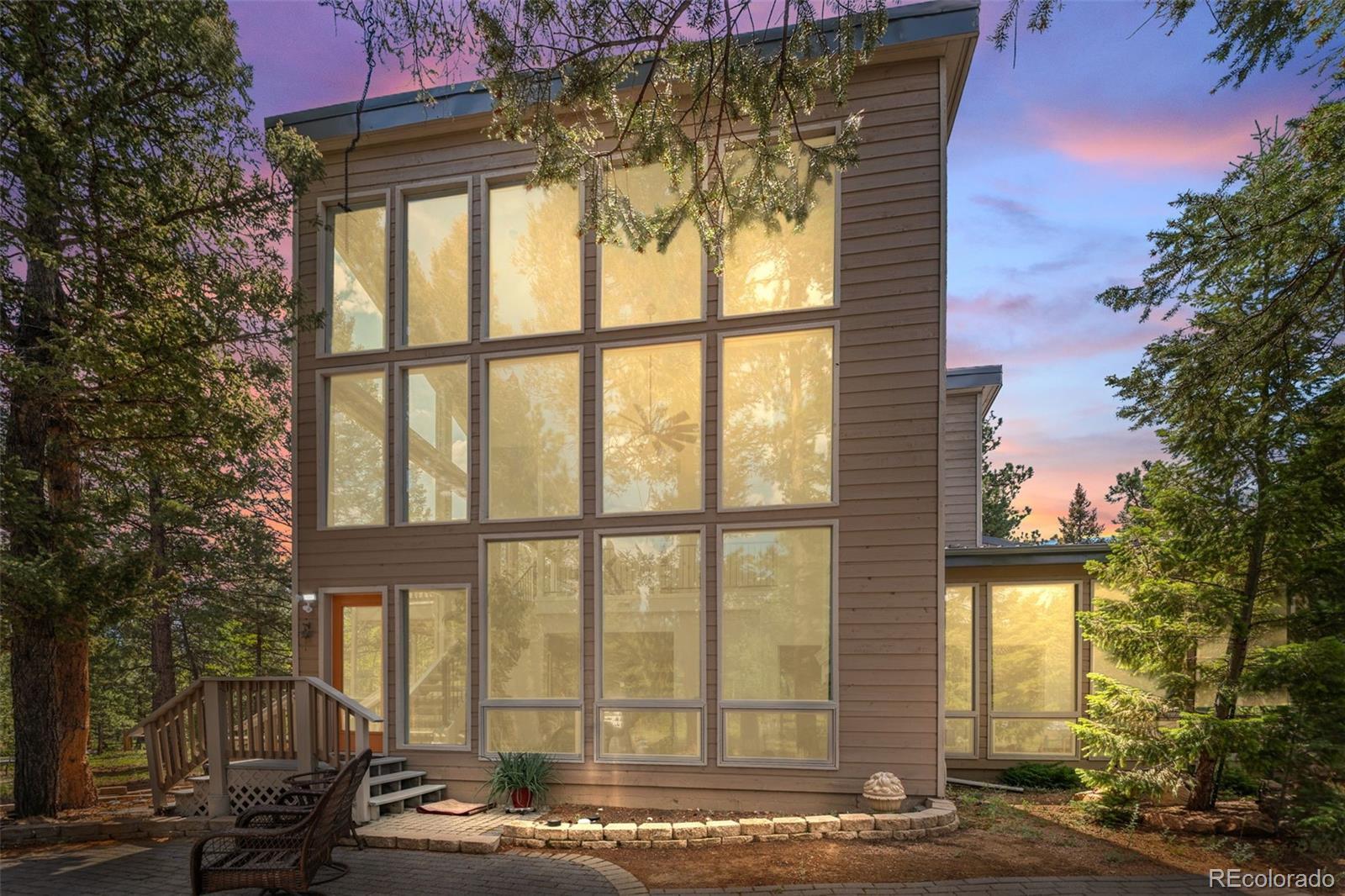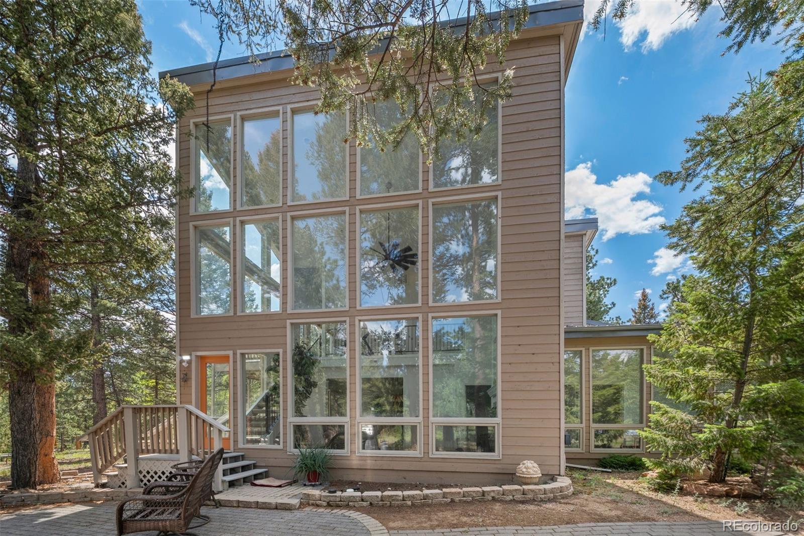Opportunities like this don’t come up often! This contemporary-style home sits on 4 secluded, private acres offering a peaceful retreat surrounded by nature. Enjoy sweeping views of natural rock formations through two-story windows that flood the open-concept interior with light. The seller has created trails throughout the property, perfect for exploring your own backyard oasis. The lot is flat with a sun-drenched driveway, beautifully accented with pavers and a serene water feature. Step outside to an expansive deck off the upper-level loft—ideal for entertaining or relaxing under the stars. Landscape lighting and a water feature enhance the outdoor ambiance, while local wildlife adds to the mountain charm. Inside, you'll find a fresh and inviting space with a main-level primary suite, new carpet, new interior paint, and a kitchen outfitted with brand new appliances. Upstairs, you'll find a private guest suite with full bath and a loft area that could easily be converted to a third bedroom. With a new furnace, whole-house Generac generator, and pellet stove, you can count on warmth, comfort, and peace of mind year-round! The two-car garage has been thoughtfully divided—one bay for parking, the other transformed into a heated custom workshop with 220 AMP Service. RV electric hookups add extra flexibility. Long-lasting and durable metal roof. Located less than 10 minutes to 285 and within an hour of world-class ski resorts. Move-in ready and full of character, this home offers the ultimate in privacy, beauty, and Colorado mountain living!