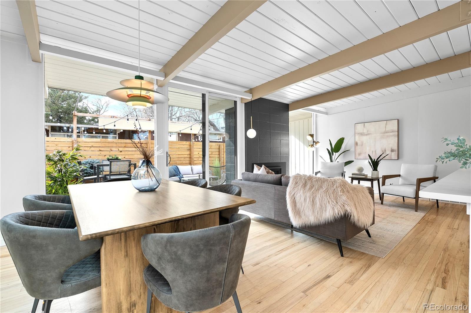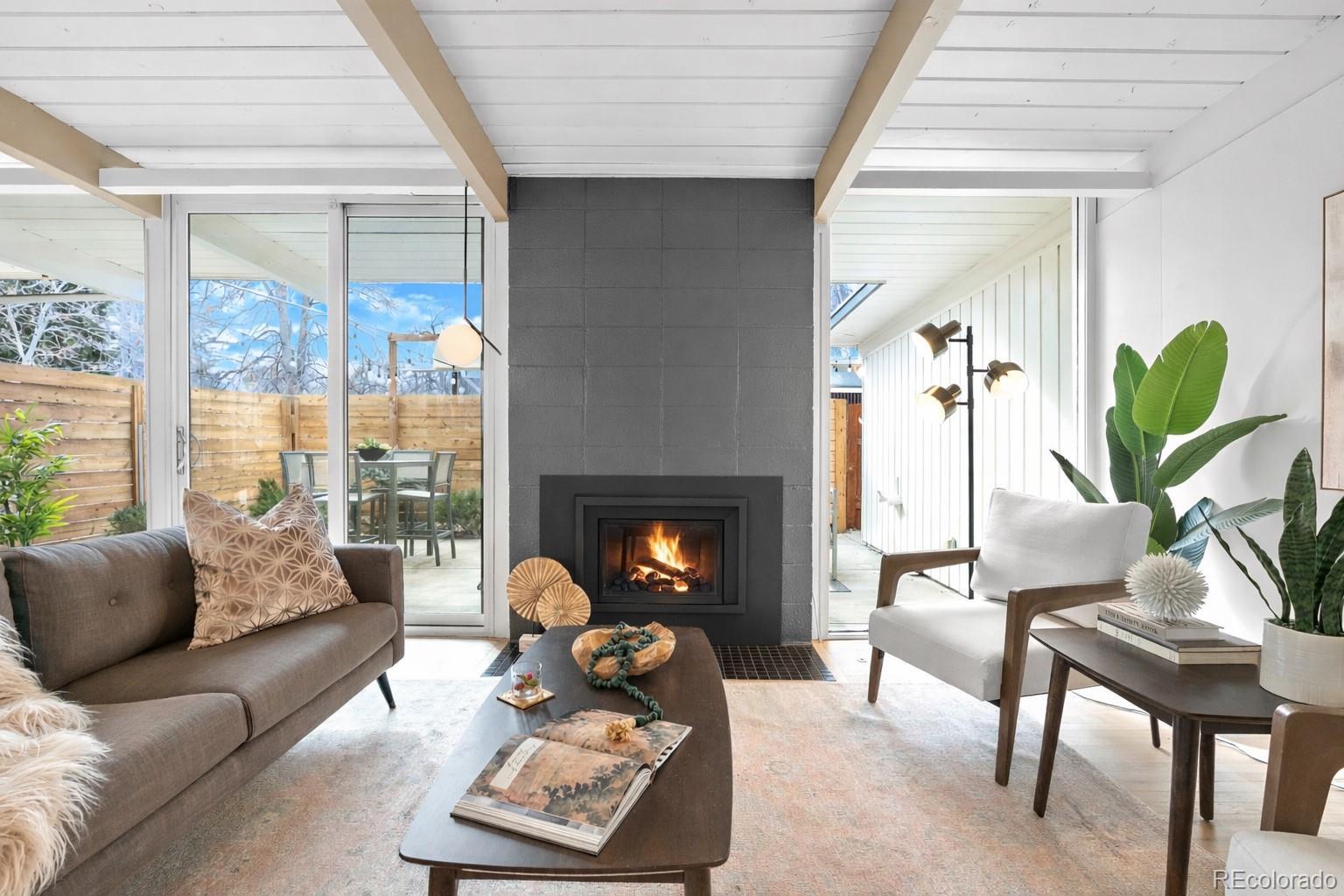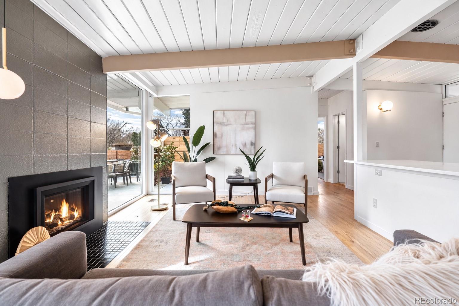 Warm, inviting, and thoughtfully updated, this mid-century modern home in Krisana Park lives effortlessly with a strong connection between indoor and outdoor spaces. Set on a quiet interior lot, the home offers an open, light-filled layout that feels both relaxed and intentional. Located within Krisana Park’s designated Conservation Overlay, the home reflects the timeless principles of mid-century design, including post-and-beam construction, wide roof overhangs, vaulted tongue-and-groove ceilings, and expansive windows that bring the outdoors in. A gas fireplace anchors the living space, creating a natural place to relax and gather. Vaulted ceilings, skylights, and walls of glass enhance the sense of openness, while the seamless flow between living, dining, and kitchen areas makes the home ideal for everything from quiet evenings to larger gatherings. Sliding glass doors open to a private courtyard, extending the living spaces outdoors. The beautifully updated chef’s kitchen features a large central island, clean-lined cabinetry, quartz countertops, and stainless steel appliances. The primary suite includes a remodeled en-suite bath, while two additional bedrooms share a thoughtfully updated full bath. The backyard offers a private retreat and is home to a cedar sauna with generous seating, a dedicated changing area, and heated floors—creating a spa-like escape at home. The home also boasts an oversized 1-car heated garage. Add'l upgrades include owned solar panels, updated electrical panel and wiring, and PEX plumbing throughout. The location is exceptional, with close proximity to Cherry Creek’s shopping, dining, and galleries, as well as trails and everyday conveniences. The home is also near the planned Four Mile Entertainment District in Glendale, an upcoming lifestyle destination poised to add new restaurants, retail, and gathering spaces. This is mid-century living done right—warm, open, and design-forward in one of Denver’s most desirable neighborhoods.