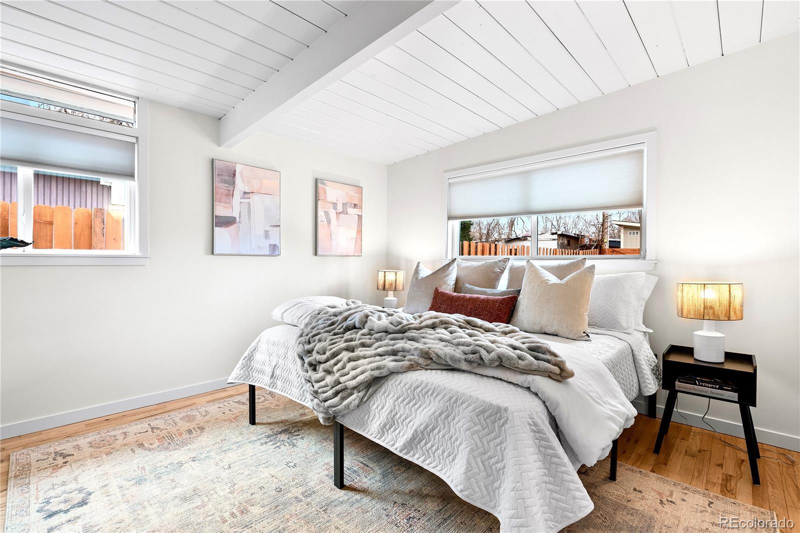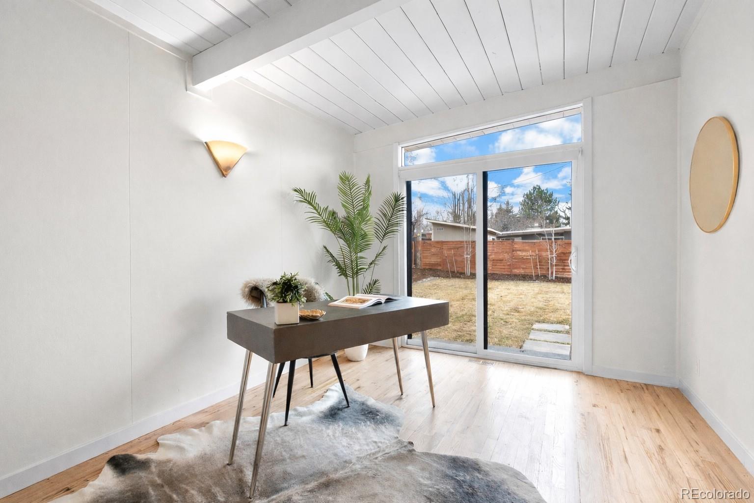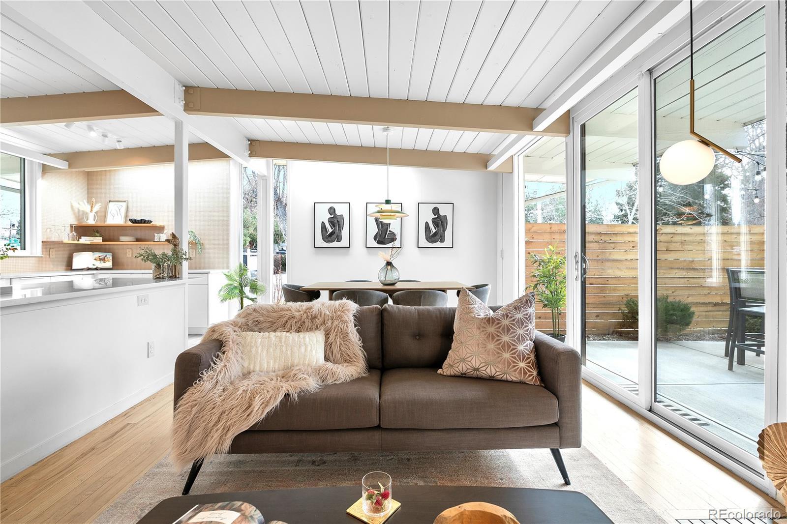 Warm, inviting, and thoughtfully updated, this mid-century modern home in Krisana Park lives effortlessly with a strong connection between indoor and outdoor spaces. Set on a quiet interior lot, the home offers an open, light-filled layout that feels both relaxed and intentional. Located within Krisana Park’s designated Conservation Overlay, the home reflects the timeless principles of mid-century design, including post-and-beam construction, wide roof overhangs, vaulted tongue-and-groove ceilings, and expansive windows that bring the outdoors in. A gas fireplace anchors the living space, creating a natural place to relax and gather. Vaulted ceilings, skylights, and walls of glass enhance the sense of openness, while the seamless flow between living, dining, and kitchen areas makes the home ideal for everything from quiet evenings to larger gatherings. Sliding glass doors open to a private courtyard, extending the living spaces outdoors. The beautifully updated chef’s kitchen features a large central island, clean-lined cabinetry, quartz countertops, and stainless steel appliances. The primary suite includes a remodeled en-suite bath, while two additional bedrooms share a thoughtfully updated full bath. The backyard offers a private retreat and is home to a cedar sauna with generous seating, a dedicated changing area, and heated floors—creating a spa-like escape at home. The home also boasts an oversized 1-car heated garage. Add'l upgrades include owned solar panels, updated electrical panel and wiring, and PEX plumbing throughout. The location is exceptional, with close proximity to Cherry Creek’s shopping, dining, and galleries, as well as trails and everyday conveniences. The home is also near the planned Four Mile Entertainment District in Glendale, an upcoming lifestyle destination poised to add new restaurants, retail, and gathering spaces. This is mid-century living done right—warm, open, and design-forward in one of Denver’s most desirable neighborhoods.
