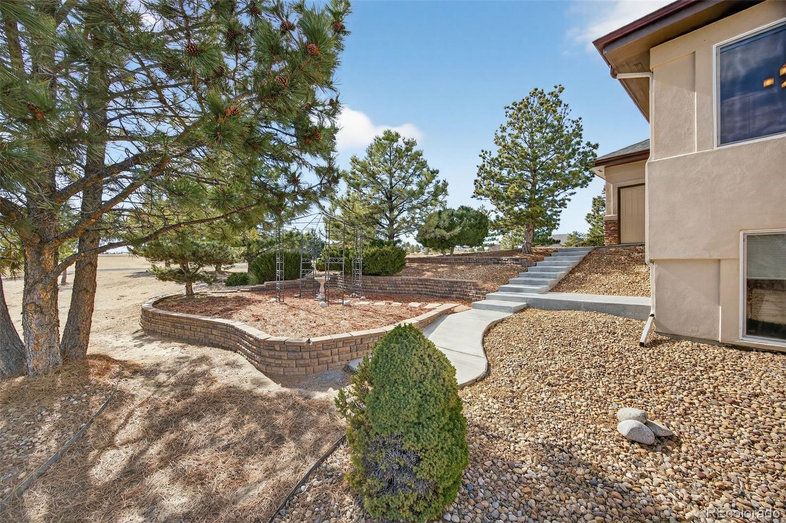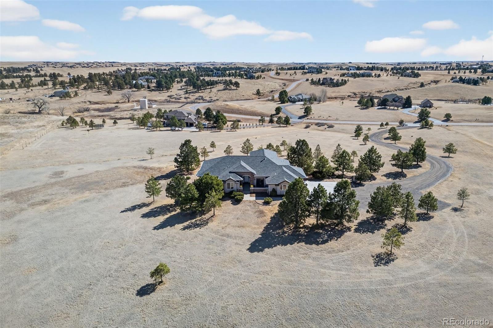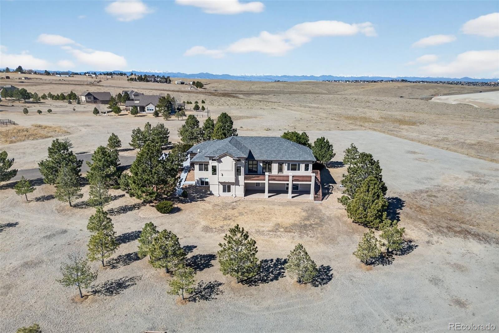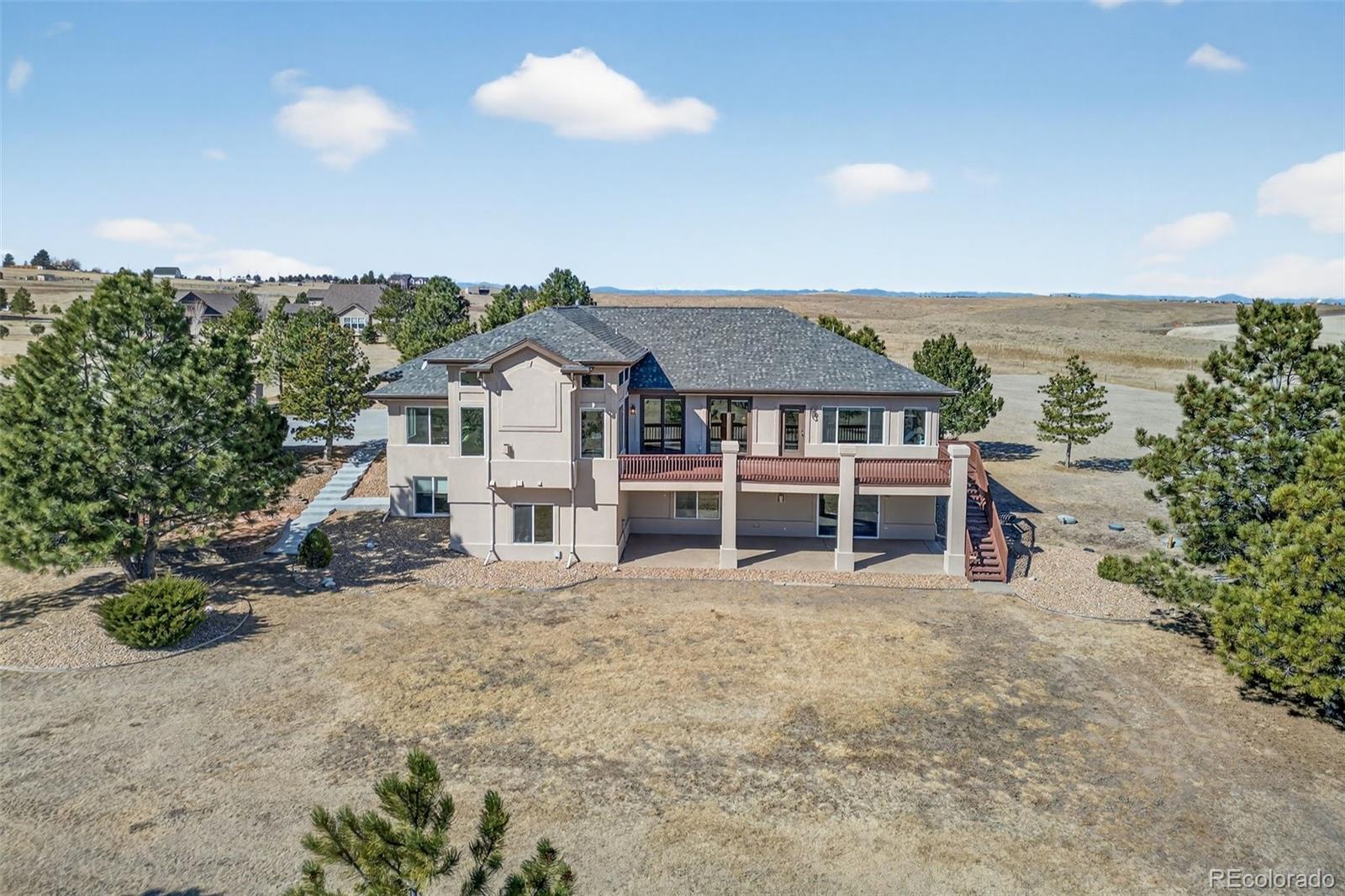 Experience peaceful Colorado living on five private acres surrounded by mature pines in Parker. This ranch-style home offers the perfect balance of privacy, nature, and space to breathe. Wildlife is a common sight here, often passing through the property as you enjoy the serenity of the trees and open skies. Start your mornings with coffee on the expansive back deck overlooking the pines, or in the evenings, unwind with your favorite beverage as you take in the sun setting behind the mountains. Step inside your beautiful home to gleaming hardwood floors, expansive windows, vaulted ceilings and an open concept from kitchen, dining and grand room. The walkout basement which is an entertainers dream, opens to the natural landscape, creating a seamless indoor-outdoor connection allowing you to fully enjoy the beauty of the surrounding property. With five acres to call your own, there is ample room for outdoor living, gardens, animals - even chickens, offering the freedom and lifestyle that acreage living provides. Nearby trail connections add even more opportunity to explore the outdoors while still being just minutes from the conveniences of Parker. Discover the rare opportunity to live among the pines with space, privacy, wildlife, and mountain views right outside your door. Welcome Home. ***UPDATES 2025: New double oven, all internet systems rewired to code and for efficiency. UPDATES 2024: New furnaces, concrete steps to side of house and expanded driveway apron. UPDATES 2023: Blinds in basement, custom pull-outs in kitchen, new kitchen sink, basement painted, custom closet (primary & secondary main level). UPDATES 2022: Hot water heater with hot water recirculating pump, blinds on main level and carpet, new lighting and fans throughout with updated electrical, new landscaping, gravel driveway.