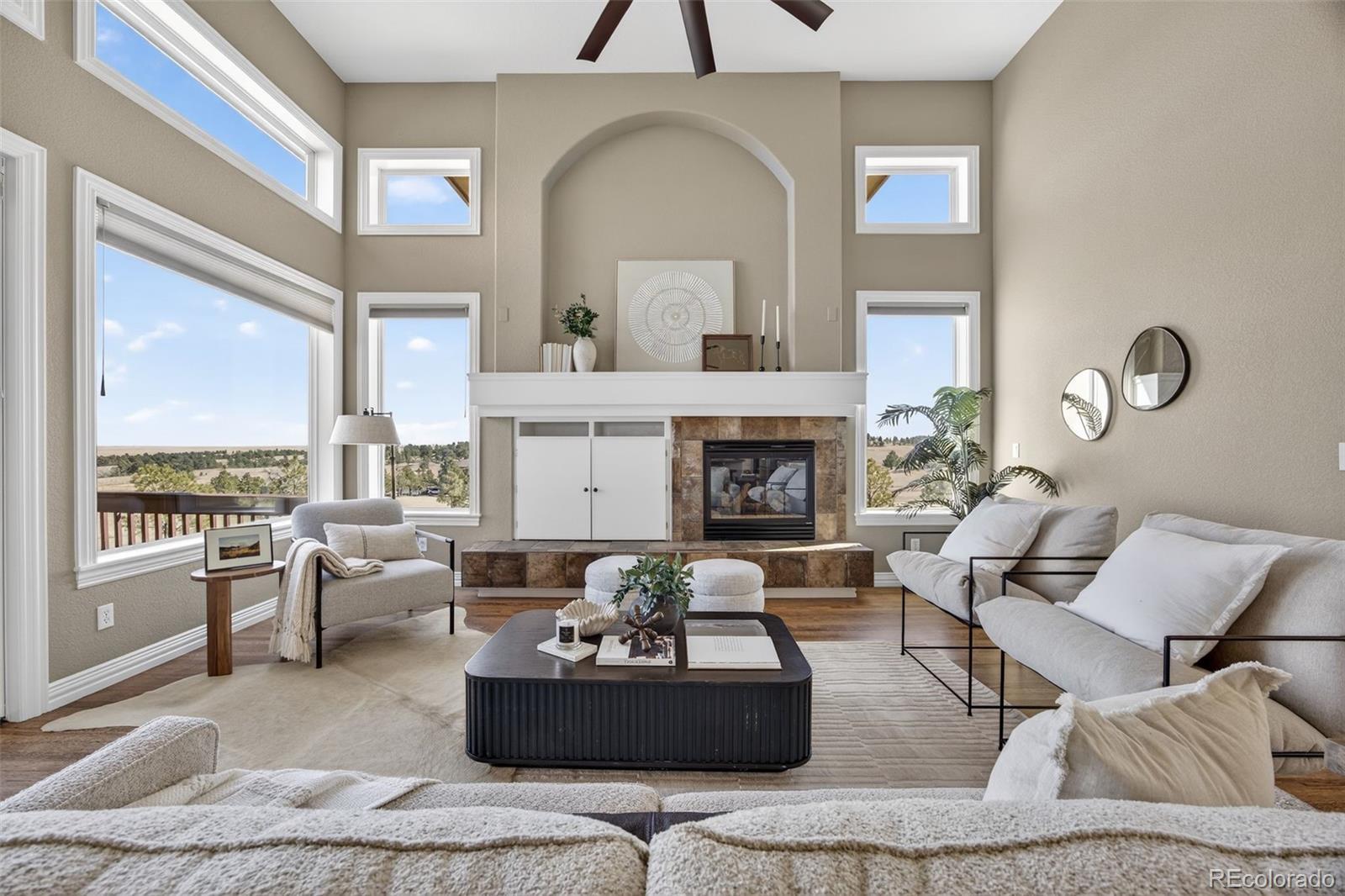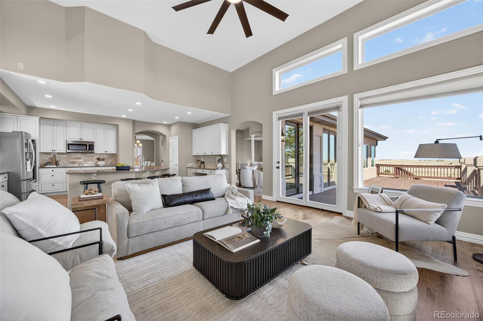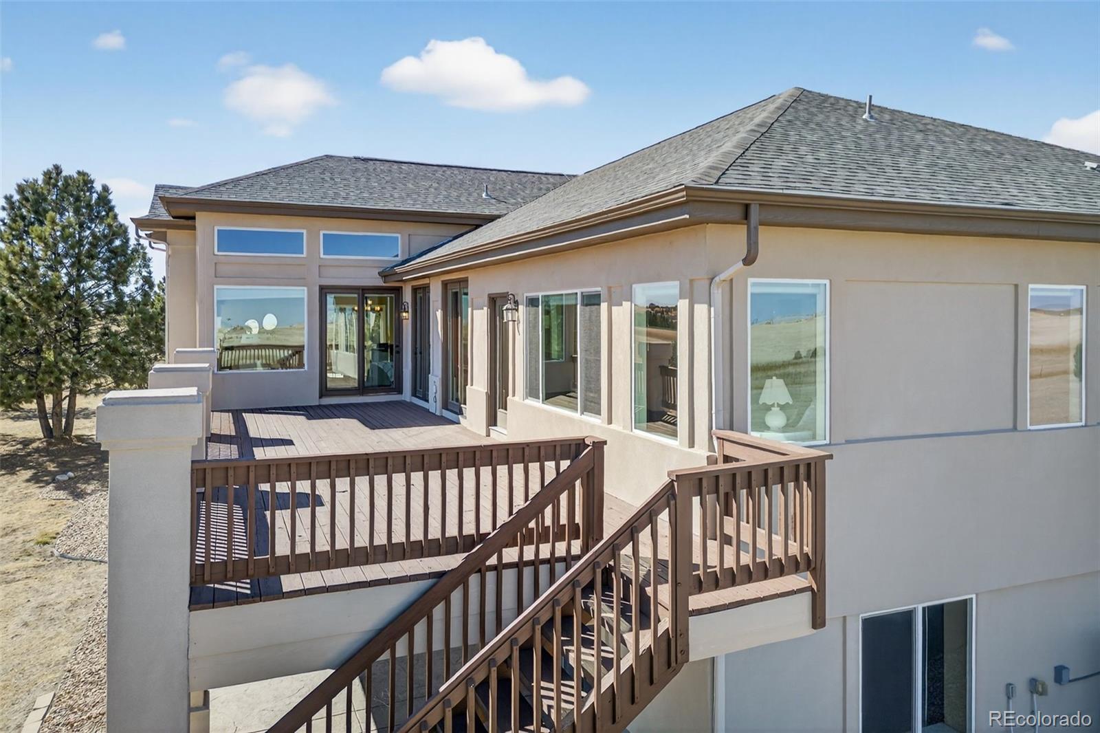 Experience peaceful Colorado living on five private acres surrounded by mature pines in Parker. This ranch-style home offers the perfect balance of privacy, nature, and space to breathe. Wildlife is a common sight here, often passing through the property as you enjoy the serenity of the trees and open skies. Start your mornings with coffee on the expansive back deck overlooking the pines, or in the evenings, unwind with your favorite beverage as you take in the sun setting behind the mountains. Step inside your beautiful home to gleaming hardwood floors, expansive windows, vaulted ceilings and an open concept from kitchen, dining and grand room. The walkout basement which is an entertainers dream, opens to the natural landscape, creating a seamless indoor-outdoor connection allowing you to fully enjoy the beauty of the surrounding property. With five acres to call your own, there is ample room for outdoor living, gardens, animals - even chickens, offering the freedom and lifestyle that acreage living provides. Nearby trail connections add even more opportunity to explore the outdoors while still being just minutes from the conveniences of Parker. Discover the rare opportunity to live among the pines with space, privacy, wildlife, and mountain views right outside your door. Welcome Home. ***UPDATES 2025: New double oven, all internet systems rewired to code and for efficiency. UPDATES 2024: New furnaces, concrete steps to side of house and expanded driveway apron. UPDATES 2023: Blinds in basement, custom pull-outs in kitchen, new kitchen sink, basement painted, custom closet (primary & secondary main level). UPDATES 2022: Hot water heater with hot water recirculating pump, blinds on main level and carpet, new lighting and fans throughout with updated electrical, new landscaping, gravel driveway.