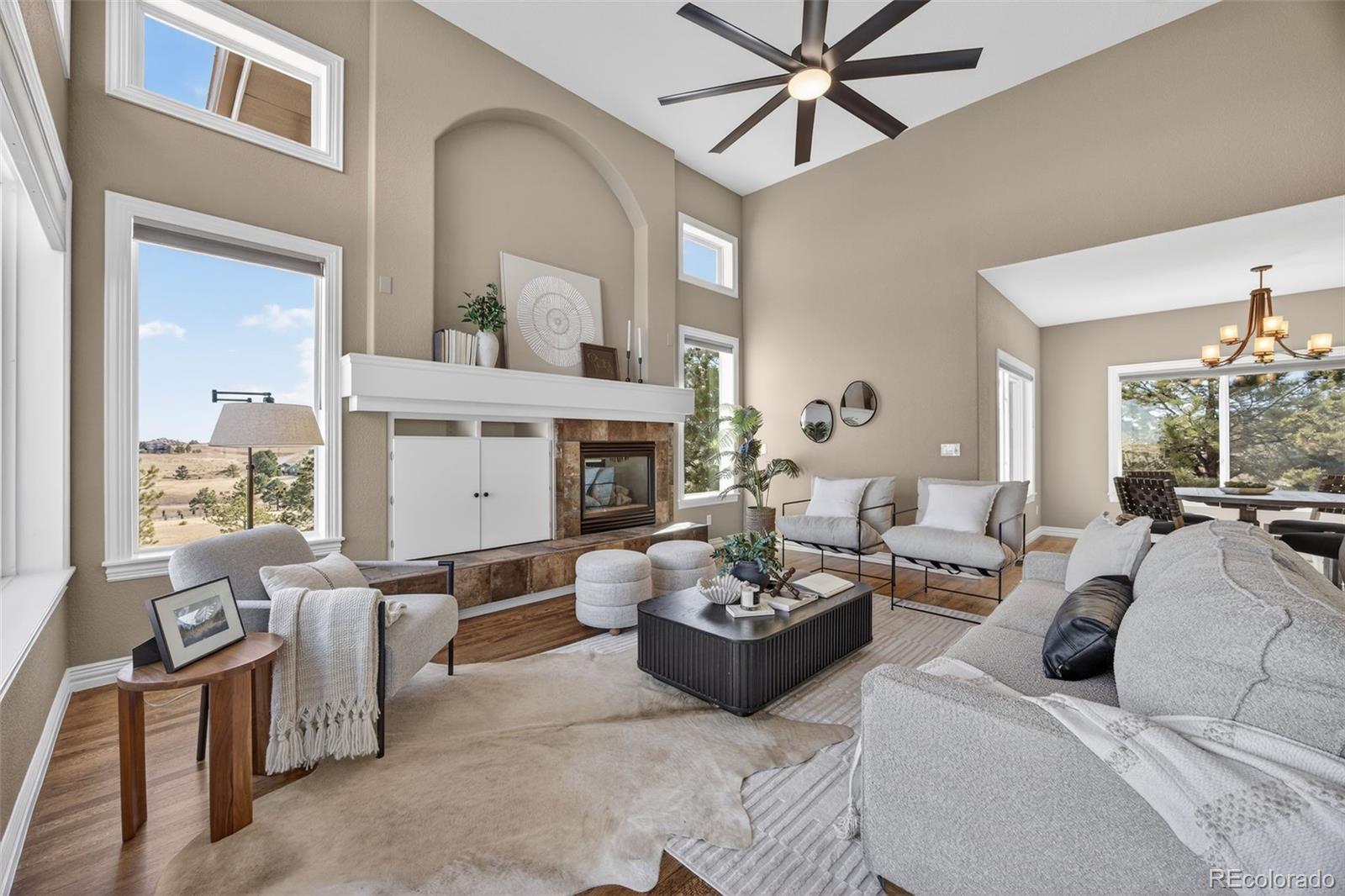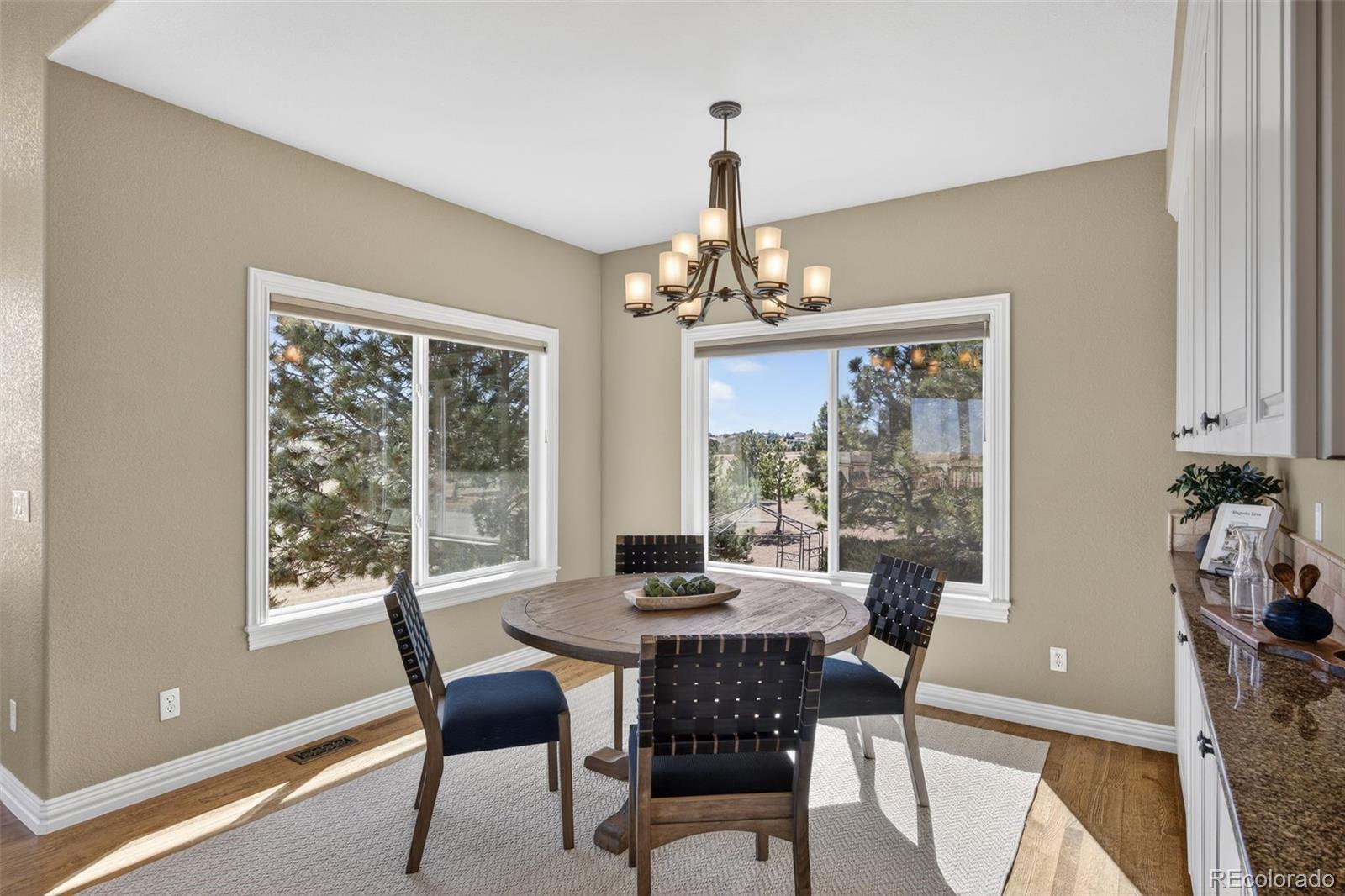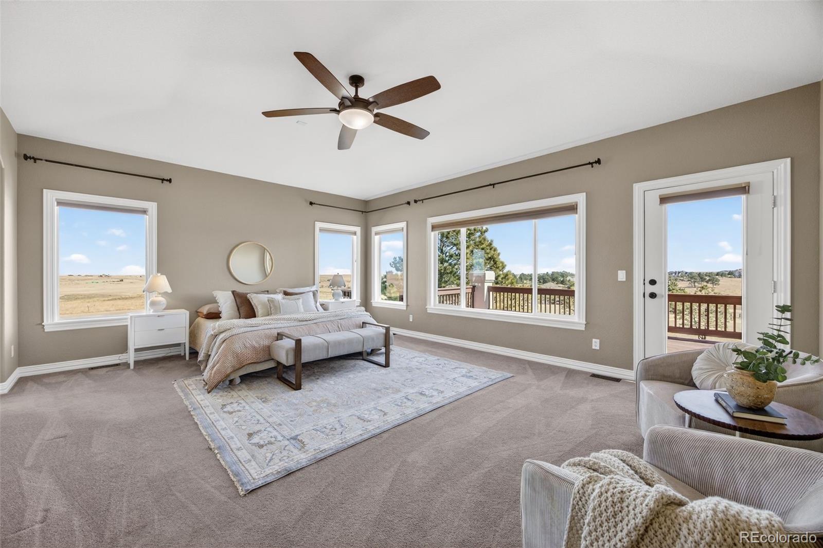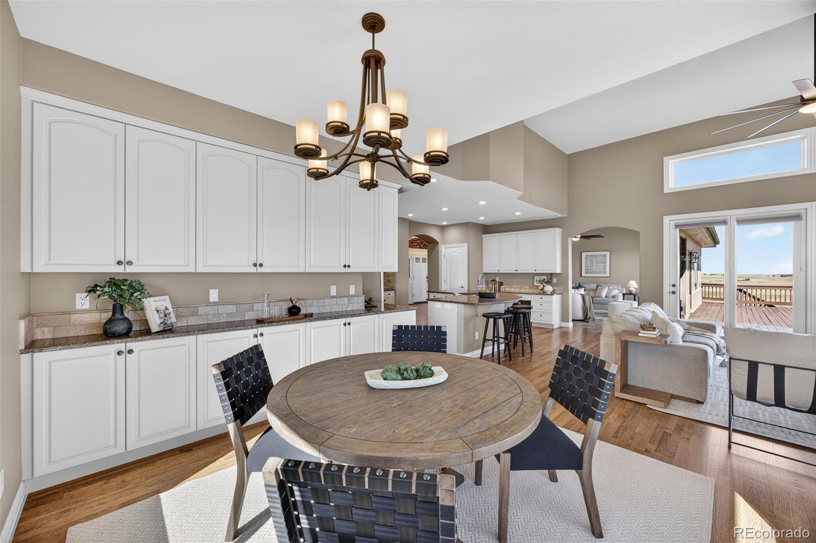 Experience peaceful Colorado living on five private acres surrounded by mature pines in Parker. This ranch-style home offers the perfect balance of privacy, nature, and space to breathe. Wildlife is a common sight here, often passing through the property as you enjoy the serenity of the trees and open skies. Start your mornings with coffee on the expansive back deck overlooking the pines, or in the evenings, unwind with your favorite beverage as you take in the sun setting behind the mountains. Step inside your beautiful home to gleaming hardwood floors, expansive windows, vaulted ceilings and an open concept from kitchen, dining and grand room. The walkout basement which is an entertainers dream, opens to the natural landscape, creating a seamless indoor-outdoor connection allowing you to fully enjoy the beauty of the surrounding property. With five acres to call your own, there is ample room for outdoor living, gardens, animals - even chickens, offering the freedom and lifestyle that acreage living provides. Nearby trail connections add even more opportunity to explore the outdoors while still being just minutes from the conveniences of Parker. Discover the rare opportunity to live among the pines with space, privacy, wildlife, and mountain views right outside your door. Welcome Home. ***UPDATES 2025: New double oven, all internet systems rewired to code and for efficiency. UPDATES 2024: New furnaces, concrete steps to side of house and expanded driveway apron. UPDATES 2023: Blinds in basement, custom pull-outs in kitchen, new kitchen sink, basement painted, custom closet (primary & secondary main level). UPDATES 2022: Hot water heater with hot water recirculating pump, blinds on main level and carpet, new lighting and fans throughout with updated electrical, new landscaping, gravel driveway.
