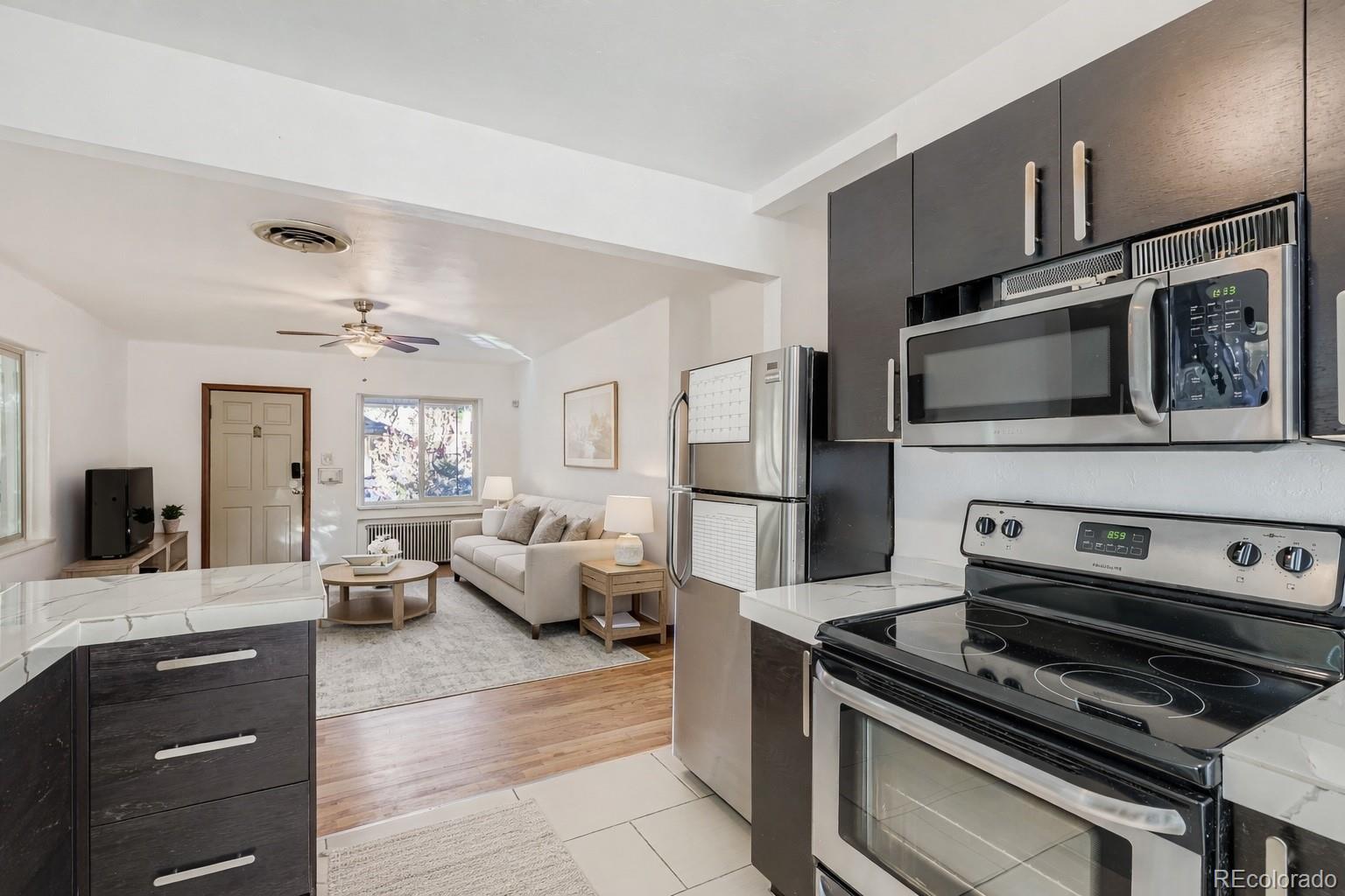 There’s something special about a home that instantly feels warm and familiar and this beautifully updated 1940 row home does exactly that. Full of character and thoughtfully refreshed for modern living, it offers the perfect blend of vintage charm and everyday comfort in one of Denver’s most loved neighborhoods. Step inside and you’re greeted by an open, light-filled layout with gleaming wood floors and a cozy living room anchored by large picture windows. The renovated kitchen is both stylish and practical, with stainless steel appliances, tile flooring, plenty of cabinet and pantry space, and a built-in breakfast nook that’s perfect for slow mornings. A breakfast bar adds extra seating and makes the space easy to live in and easy to host. The main level features two comfortable bedrooms and a fully remodeled bathroom, creating a layout that feels efficient, calm, and inviting. Downstairs, the partially finished basement adds flexibility to fit your life, whether you need a media room, home office, guest space, or an extra hangout area. You’ll also find a generous laundry area with a utility sink, built-in shelving, and tons of storage. Outside is where this home really shines. Enjoy coffee on the covered front porch, unwind in the private fenced backyard, or host friends on the covered patio, there’s room to relax, entertain, and make the space your own. A detached one-car garage plus ample street parking add everyday convenience. Tucked away on a quiet street yet close to everything, you’re just minutes from City Park, the Denver Zoo, RiNo, downtown Denver, Cherry Creek, and some of the city’s best restaurants and cafés. This move-in-ready row home offers timeless appeal, thoughtful updates, and the kind of neighborhood vibe that makes Denver living so special.