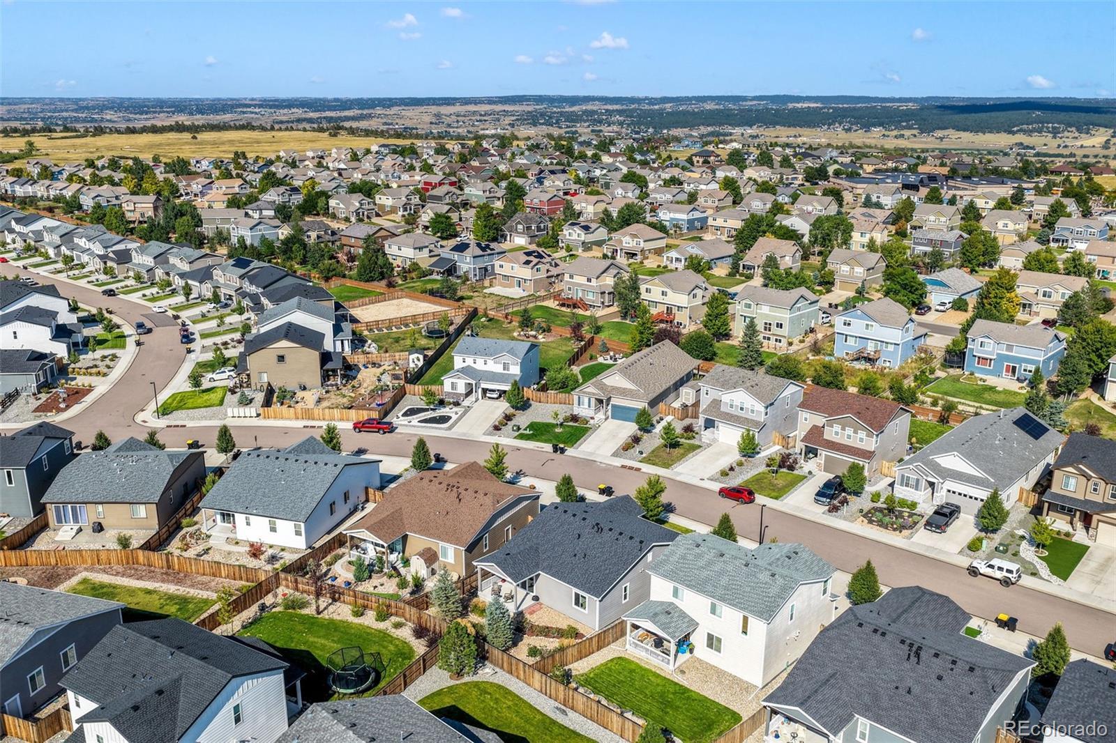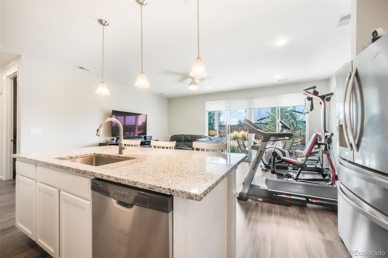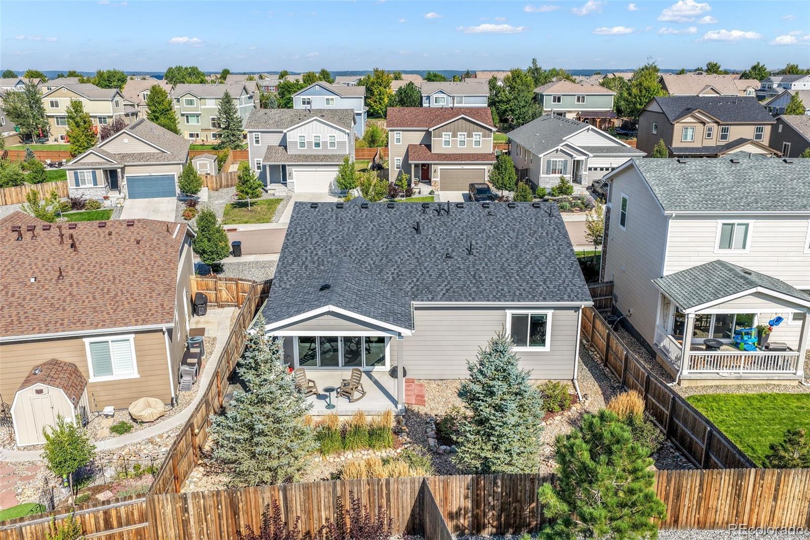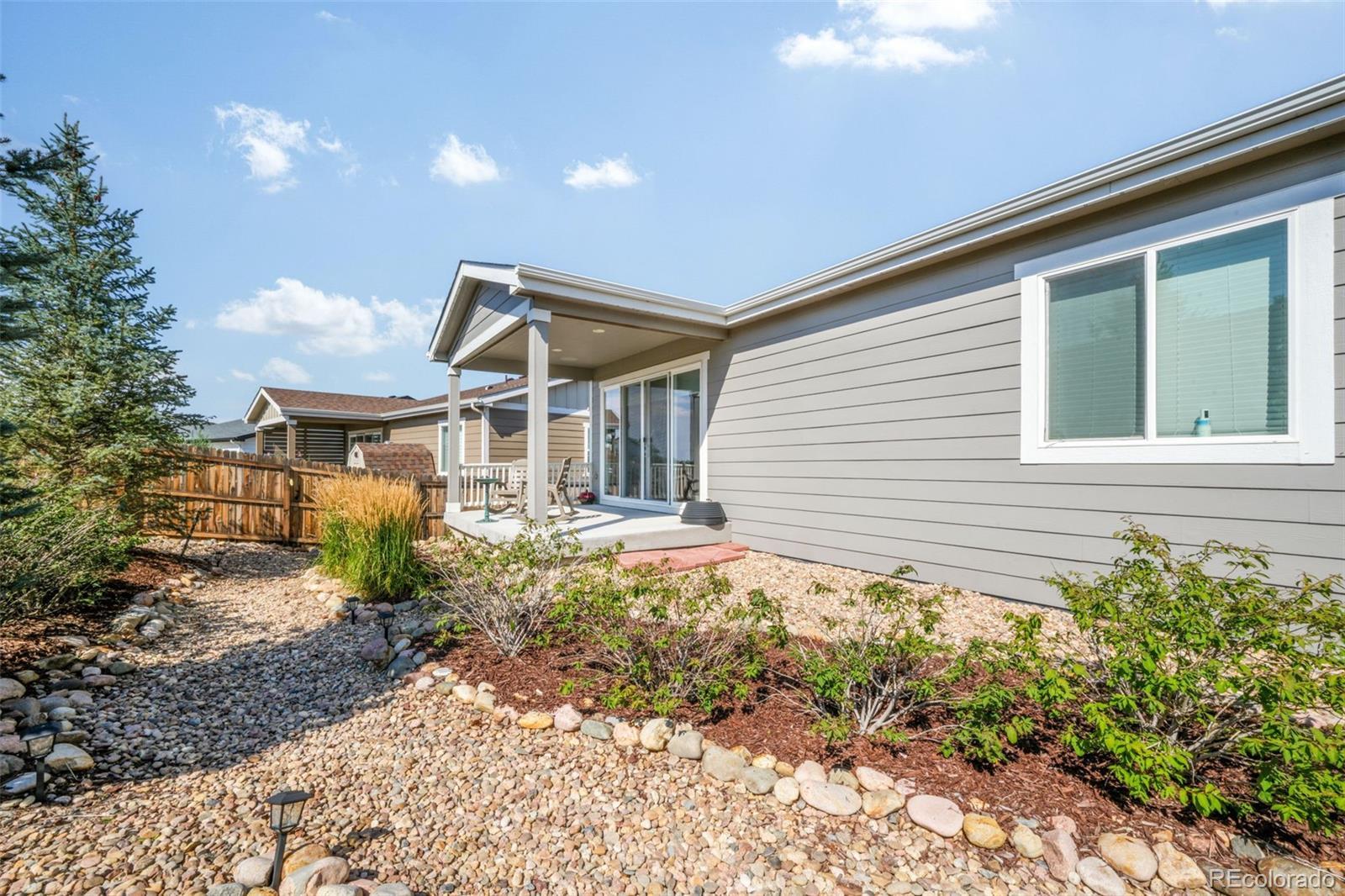 Welcome to this inviting ranch-style home in the desirable Bella Mesa community of Castle Rock. With 3 bedrooms, 2 bathrooms, and a 2-car garage, this home offers the perfect blend of comfort, convenience, and modern finishes—all on one easy-to-live-in level. The open kitchen is the heart of the home, featuring granite countertops, stainless steel appliances, an oversized sink, pantry, and plenty of cabinet space. Pendant lighting adds a stylish touch, while the kitchen flows seamlessly into the spacious family room, making it easy to gather for meals, movie nights, or celebrations. Durable LVP flooring and carpet provide the right balance for busy households. The primary suite includes a large shower, granite countertops, a walk-in closet, and pre-plumbed for a second sink installation. Large windows throughout the home fill each room with natural light. Additional features include central air conditioning, a radon system, and a new roof installed in 2023. Step outside through 8 ft double sliding glass doors to a covered patio overlooking a beautifully landscaped, fenced backyard—ideal for play, pets, and family barbecues. Close to neighborhood parks, open space, trails, schools, and recreation, this home is move in ready!