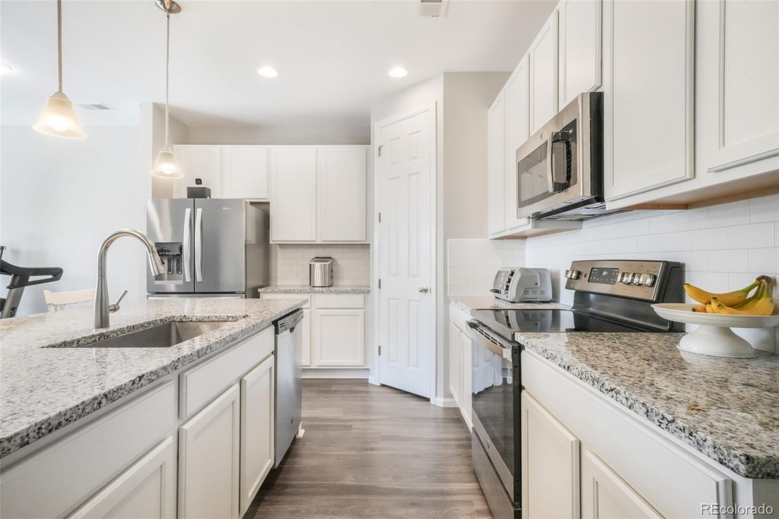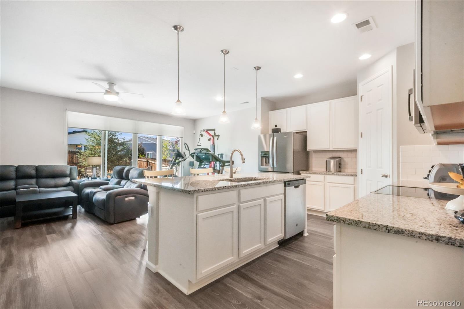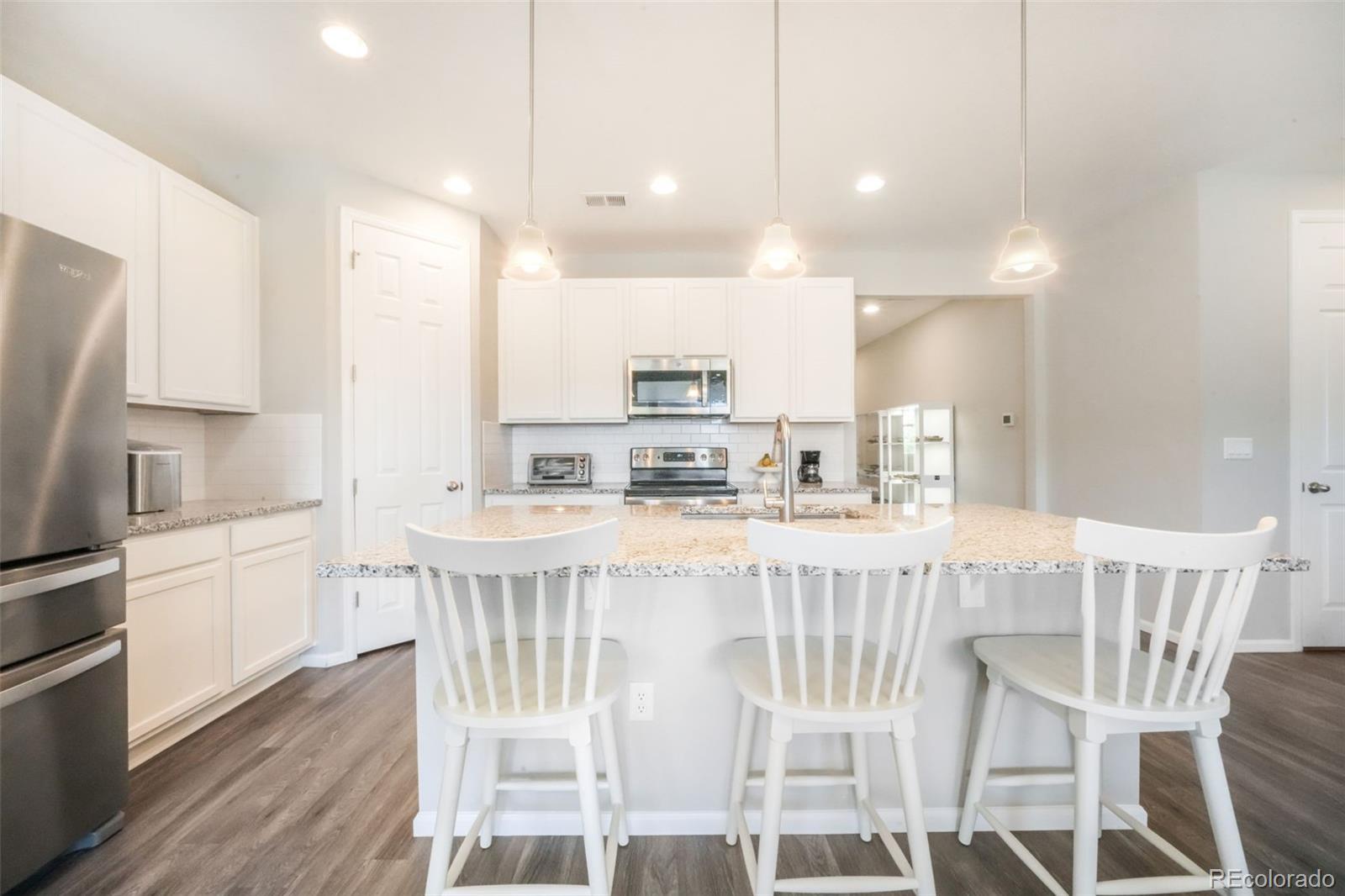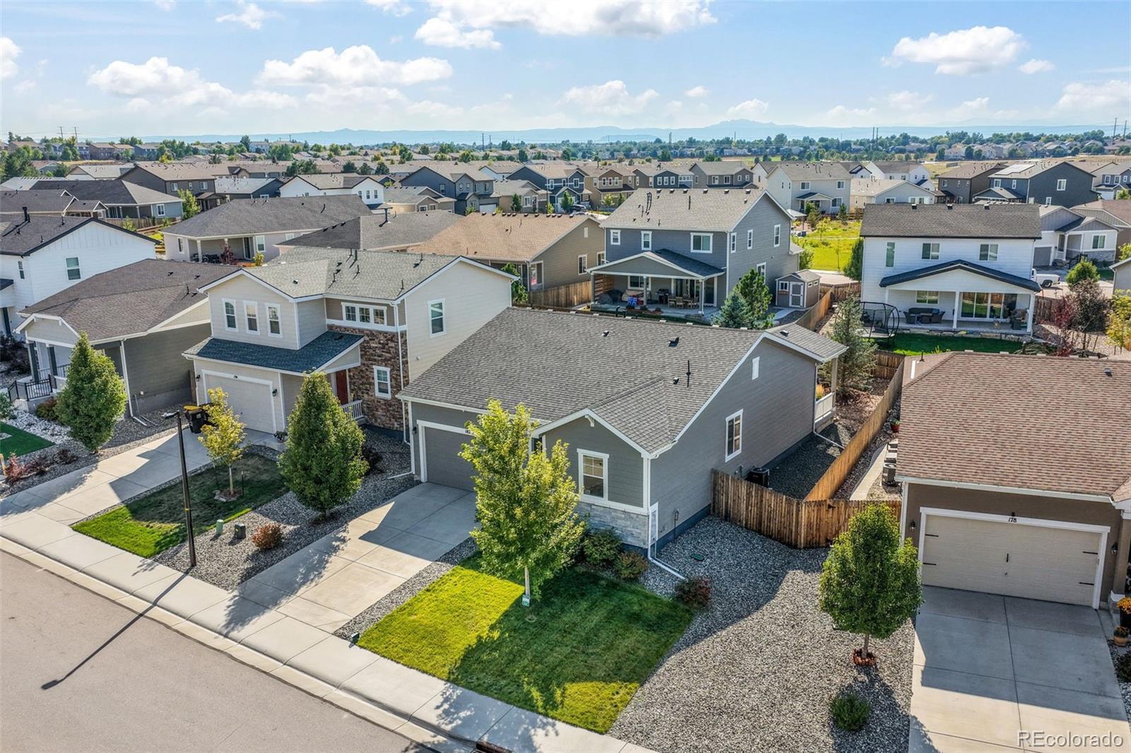 Welcome to this inviting ranch-style home in the desirable Bella Mesa community of Castle Rock. With 3 bedrooms, 2 bathrooms, and a 2-car garage, this home offers the perfect blend of comfort, convenience, and modern finishes—all on one easy-to-live-in level. The open kitchen is the heart of the home, featuring granite countertops, stainless steel appliances, an oversized sink, pantry, and plenty of cabinet space. Pendant lighting adds a stylish touch, while the kitchen flows seamlessly into the spacious family room, making it easy to gather for meals, movie nights, or celebrations. Durable LVP flooring and carpet provide the right balance for busy households. The primary suite includes a large shower, granite countertops, a walk-in closet, and pre-plumbed for a second sink installation. Large windows throughout the home fill each room with natural light. Additional features include central air conditioning, a radon system, and a new roof installed in 2023. Step outside through 8 ft double sliding glass doors to a covered patio overlooking a beautifully landscaped, fenced backyard—ideal for play, pets, and family barbecues. Close to neighborhood parks, open space, trails, schools, and recreation, this home is move in ready!