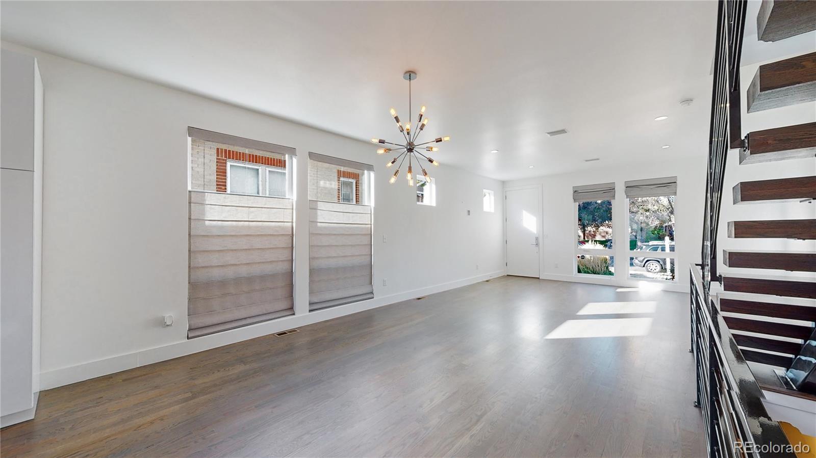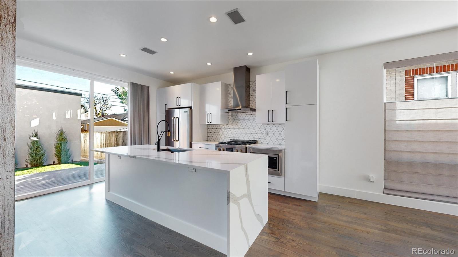 Your next home is in Sloans Lake! This newer built urban contemporary 1/2 duplex in West Colfax/South Sloan Lake offers a Caruso Kitchen remodel including new cabinets & hardware, faucet, sink, Pentel Quartz waterfall counters, island, and backsplash tile. The stunning kitchen is equipped with high-end stainless steel appliances. With four levels of living, this contemporary home exudes modern finishes throughout. The basement includes a family room with a 75 inch Samsung TV, and built-in surround sound speakers. Listen to all your favorite tunes throughout this home with built-in speakers in the basement and on the main floor. Over 2,500 Sq Ft of living space. Keep organized with all bedrooms offering closet organizers. Parking is a breeze in the oversized garage with an 8-foot door height and is finished inside, painted with garage cabinets, and storage. Your EV vehicle is welcome here, with the 220-volt outlet in the garage for charging your electric or hybrid vehicle. New maintenance-free Trex deck off the kitchen into the back yard, and low maintenance landscaping in both front and back. Make this your next home!