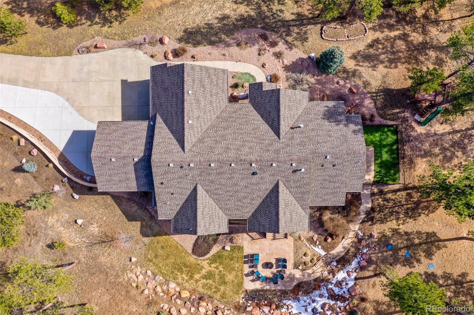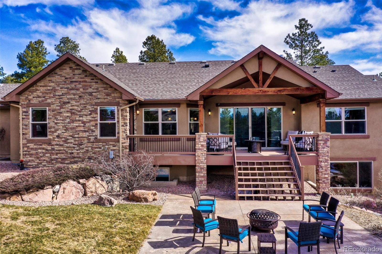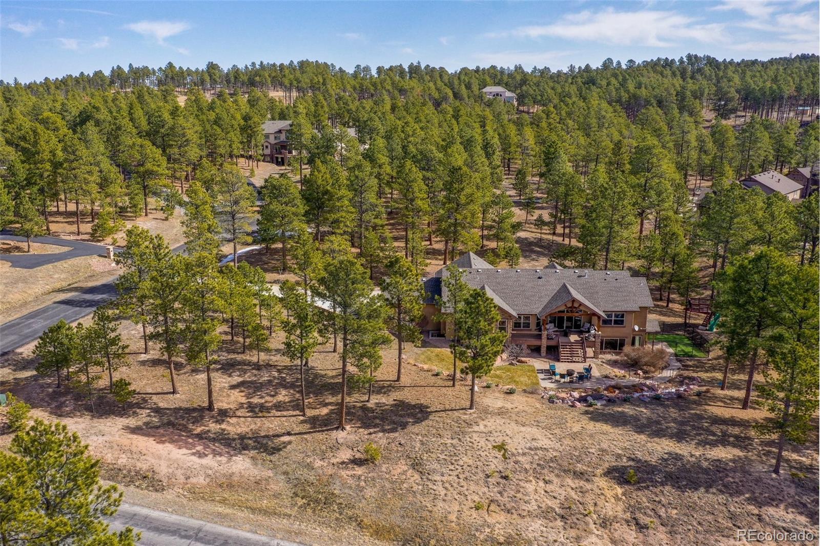 Nestled on 2.56 acres within the highly desirable Black Forest, Cathedral Pines community, this exquisite Vacation custom home is surrounded by towering Ponderosa pines. Offering an ideal fusion of luxury and adventure, providing endless opportunities for outdoor recreation, the property's attributes include a treehouse, slide, and zip line. Upon entering the home, you will be greeted by the great room with natural wood floors and a convenient, cozy fireplace. The main floor includes an open-concept kitchen, meticulously designed to harmonize aesthetics and functionality. Featuring granite countertops, an induction cooktop, and double ovens. You will discover a master suite with its spacious walk-in closet and a five-piece master bath featuring a relaxing, massaging, jetted bathtub. Two other main-level bedrooms and the two basement bedrooms all have walk-in closets. Large sliding doors offer breathtaking mountain views, creating a warm and inviting ambiance. New Carpets in all bedrooms and new flooring in the basement. Other notable features include a sound system compatible with online music services and three strategically positioned Wi-Fi hotspots on the main level. The fully finished basement offers multiple amenities. The spacious family room boasts a kitchenette, pool table, and for an immersive movie experience, there is a full theater room with reclining seats. In the spacious four-car garage, you will be greeted by newly painted epoxy floors. The exterior of the property is equally impressive, boasting a heated driveway, a stamped concrete patio, and a fenced-in dog run. Retreat to the back deck and enjoy peaceful evenings, accompanied by the soothing sounds of your own water feature, while a built-in gas line provides the opportunity for outdoor entertainment. Enjoy access to scenic hiking trails, tranquil water features, a stocked fishing pond, and an exclusive lodge. Do not miss the opportunity.