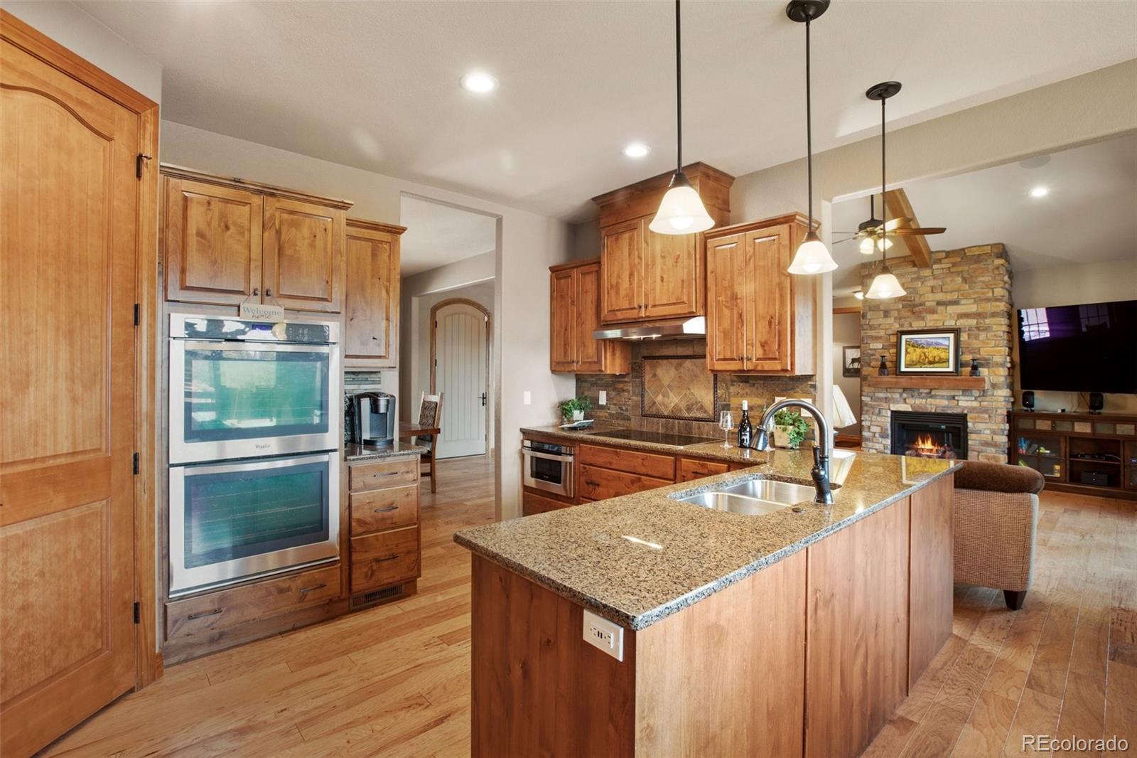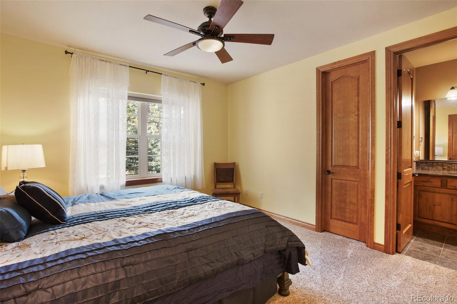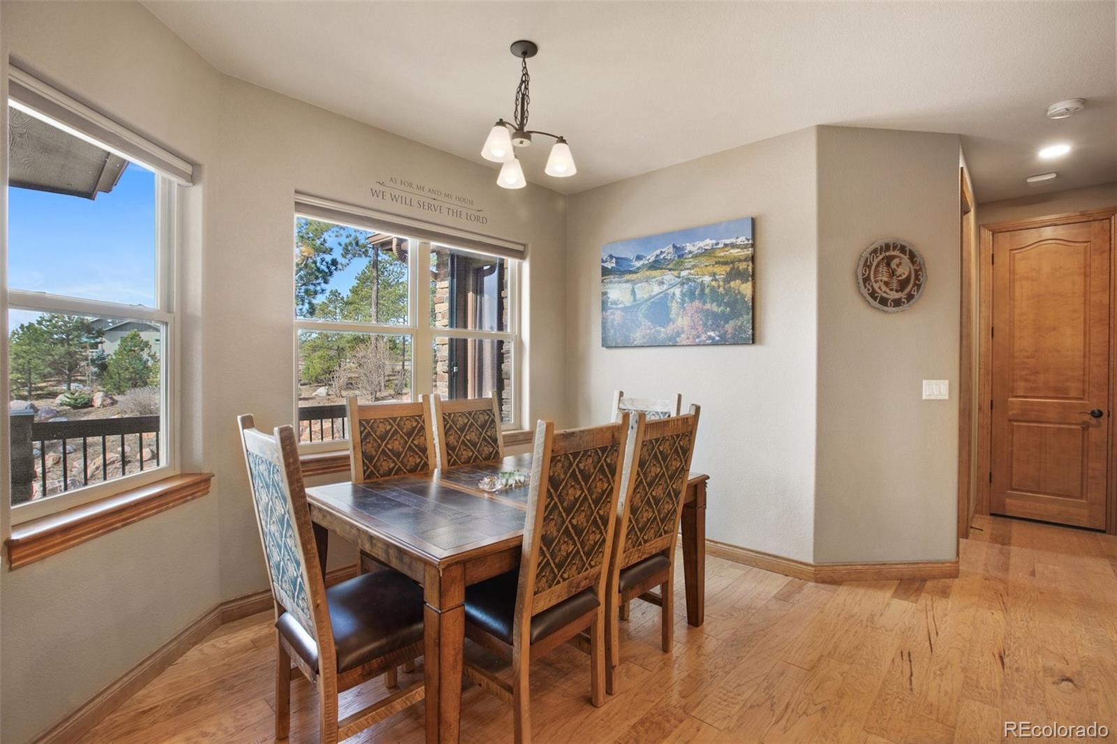 Nestled on 2.56 acres within the highly desirable Black Forest, Cathedral Pines community, this exquisite Vacation custom home is surrounded by towering Ponderosa pines. Offering an ideal fusion of luxury and adventure, providing endless opportunities for outdoor recreation, the property's attributes include a treehouse, slide, and zip line. Upon entering the home, you will be greeted by the great room with natural wood floors and a convenient, cozy fireplace. The main floor includes an open-concept kitchen, meticulously designed to harmonize aesthetics and functionality. Featuring granite countertops, an induction cooktop, and double ovens. You will discover a master suite with its spacious walk-in closet and a five-piece master bath featuring a relaxing, massaging, jetted bathtub. Two other main-level bedrooms and the two basement bedrooms all have walk-in closets. Large sliding doors offer breathtaking mountain views, creating a warm and inviting ambiance. New Carpets in all bedrooms and new flooring in the basement. Other notable features include a sound system compatible with online music services and three strategically positioned Wi-Fi hotspots on the main level. The fully finished basement offers multiple amenities. The spacious family room boasts a kitchenette, pool table, and for an immersive movie experience, there is a full theater room with reclining seats. In the spacious four-car garage, you will be greeted by newly painted epoxy floors. The exterior of the property is equally impressive, boasting a heated driveway, a stamped concrete patio, and a fenced-in dog run. Retreat to the back deck and enjoy peaceful evenings, accompanied by the soothing sounds of your own water feature, while a built-in gas line provides the opportunity for outdoor entertainment. Enjoy access to scenic hiking trails, tranquil water features, a stocked fishing pond, and an exclusive lodge. Do not miss the opportunity.