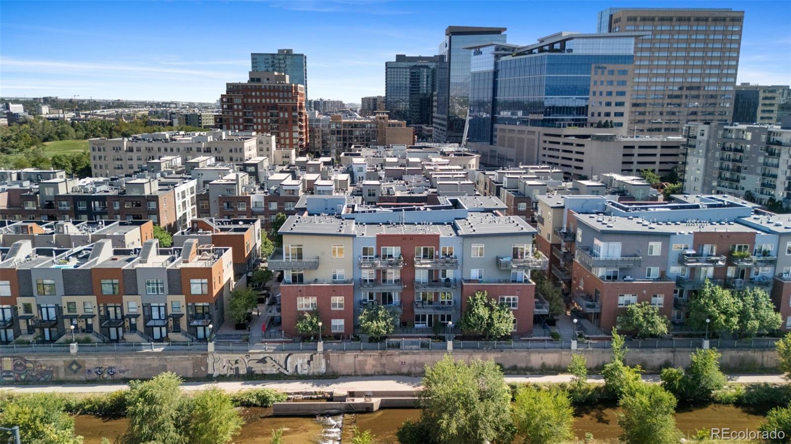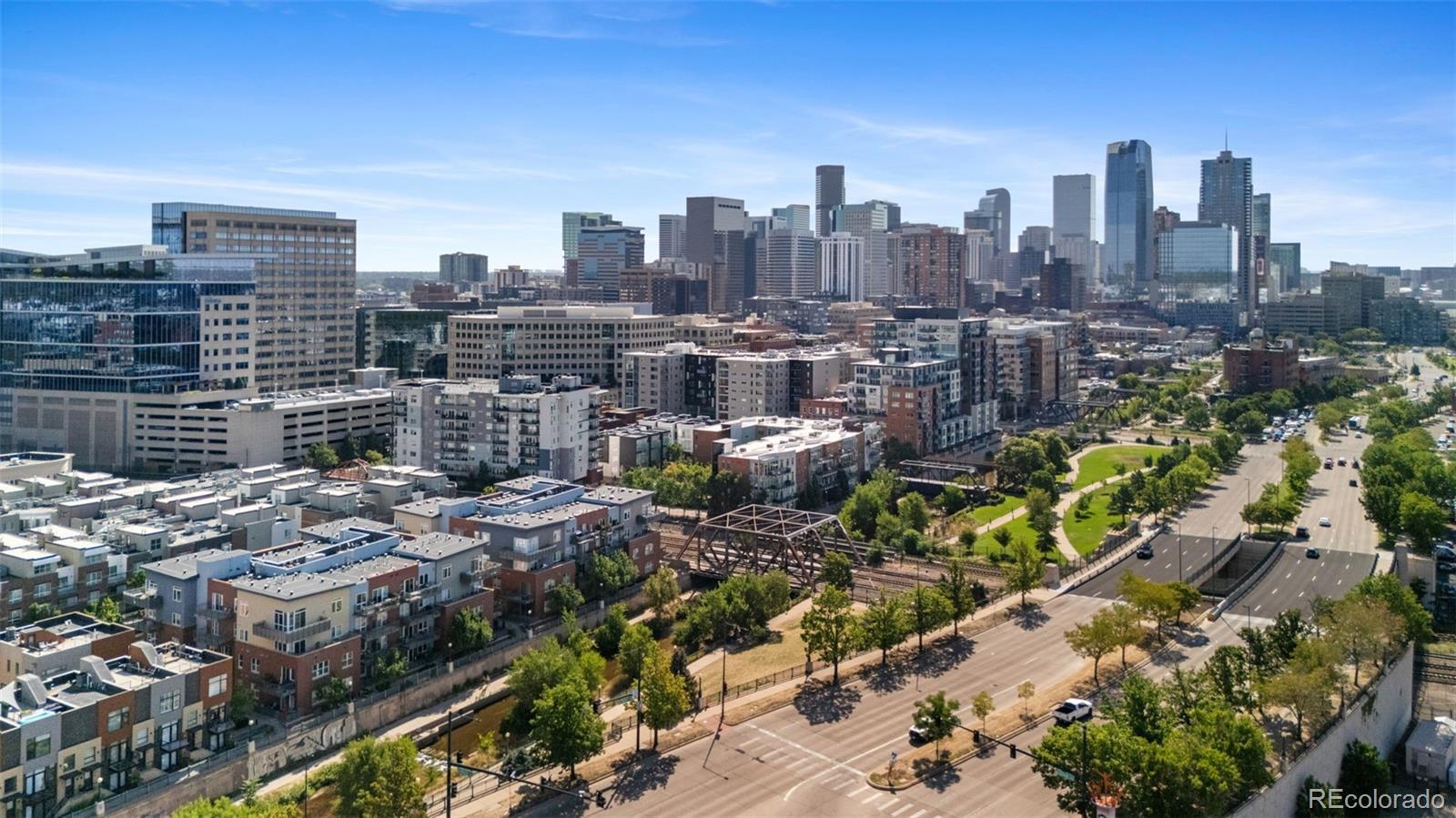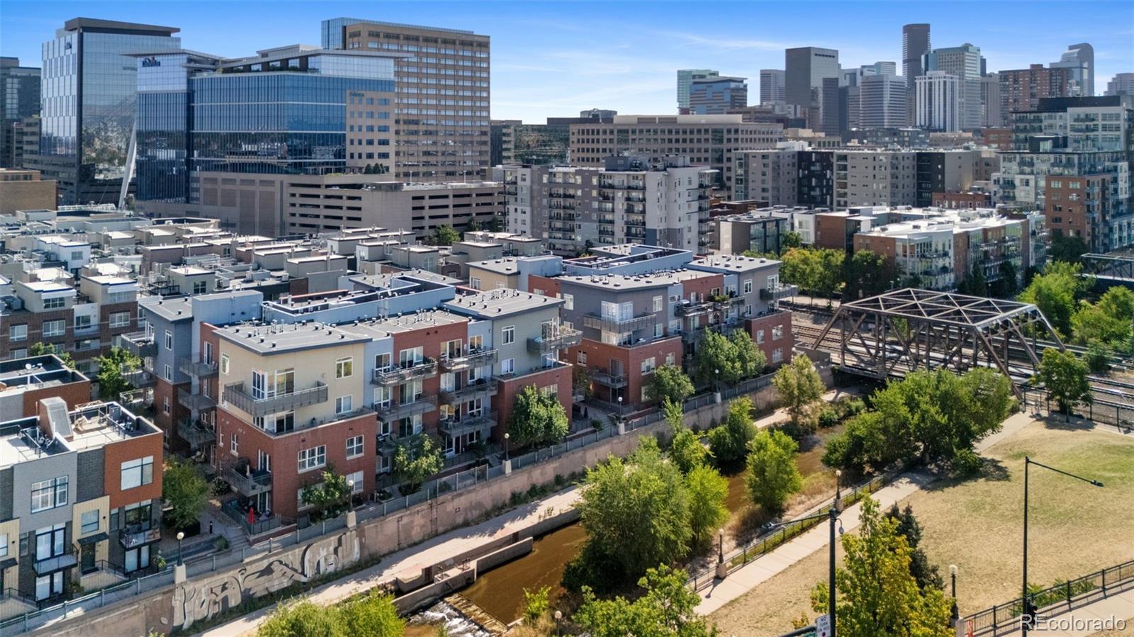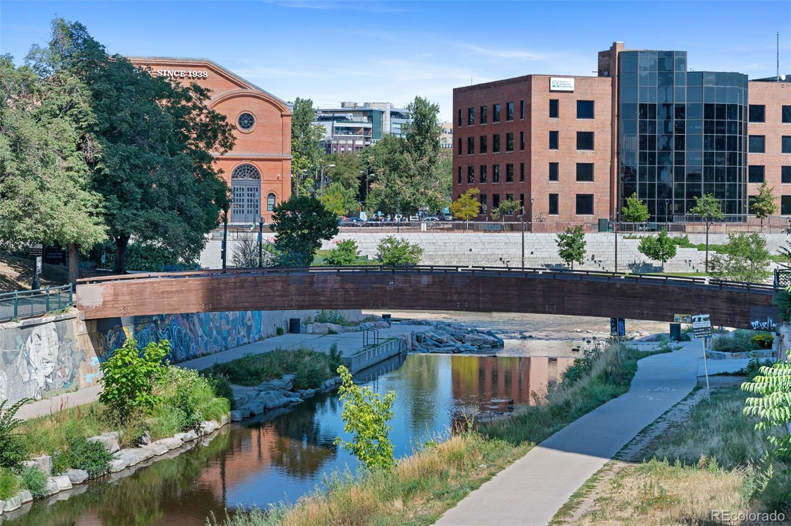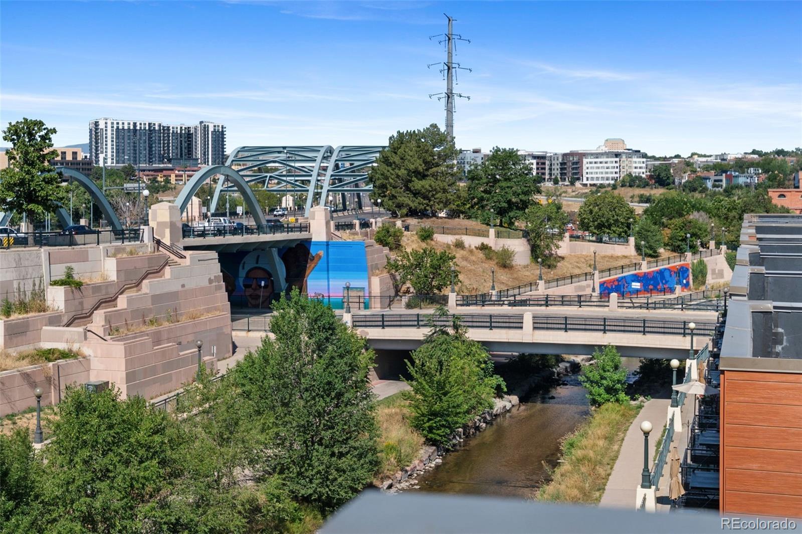 Outstanding penthouse with 2 garage parking spaces!!? This 2 Bedroom 2 Bath 4th floor Penthouse with 14ft ceilings features spectacular riverfront and mountain views! You will enjoy the wrap around terrace that overlooks Cherry Creek and its bike path on those beautiful sunny Colorado days! Oversized windows in this home make the beautiful interior shine. The newly refinished maple hardwood floors are warm and bright. Stunning kitchen complete with expansive solid surface granite countertops top of the line appliances and maple cabinetry. Custom remodeled primary bathroom with oversized tiled shower. Additional features include Hunter Douglas Window shutters, Two secured underground parking spaces (Spaces 55 and 56) which sit directly across from elevator, a very convenient 4th floor Storage unit and garbage chute. This is a One-of-a-kind property in a very desirable Downtown location. Walking distance to Riverfront Park, Elitch Gardens, Confluence Park, Cherry Creek Trail and Pedestrian Bridge to LoHi. Short walk to Union Station and fabulous Downtown restaurants. New Hot water heater, washer dryer included