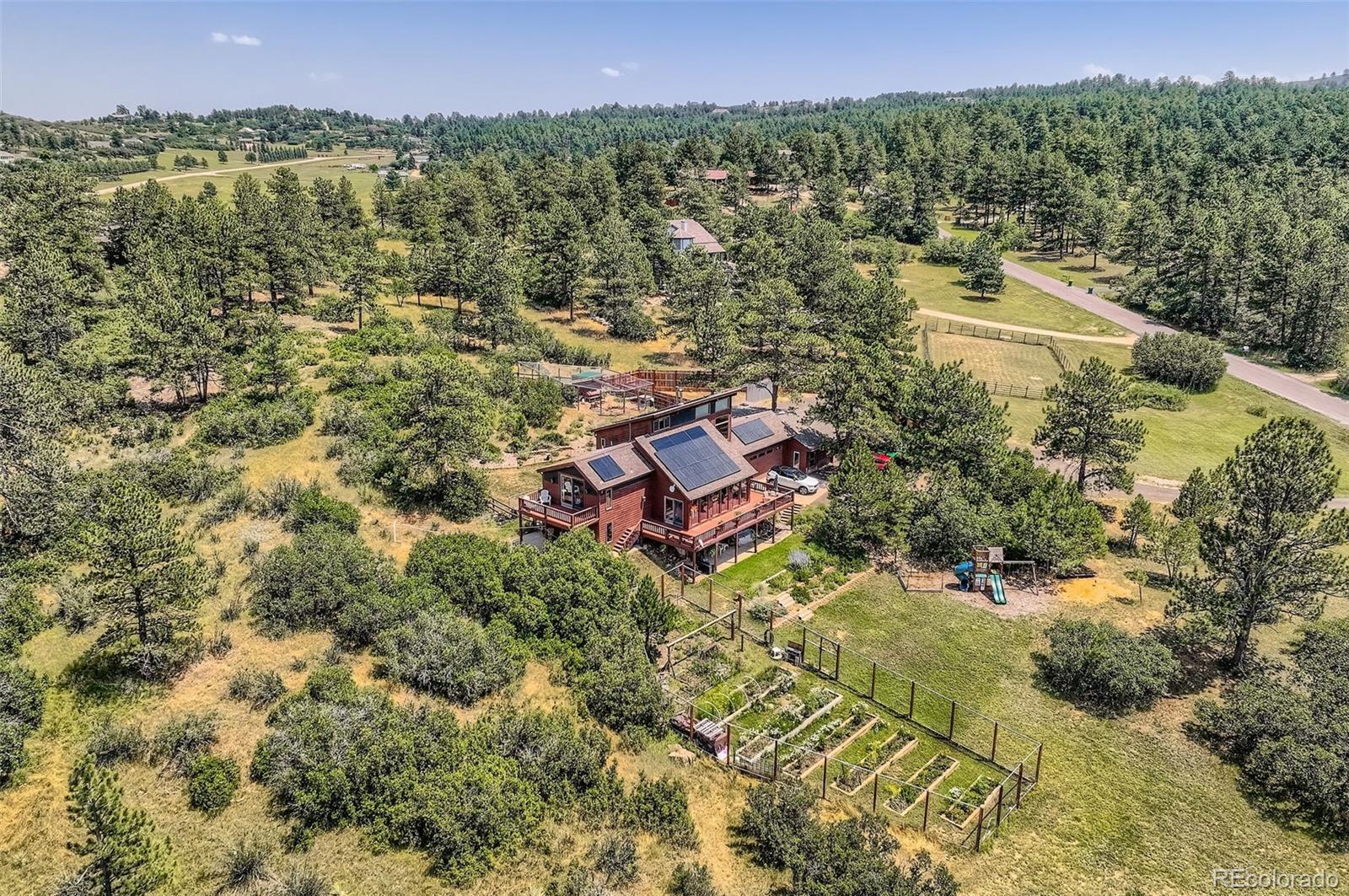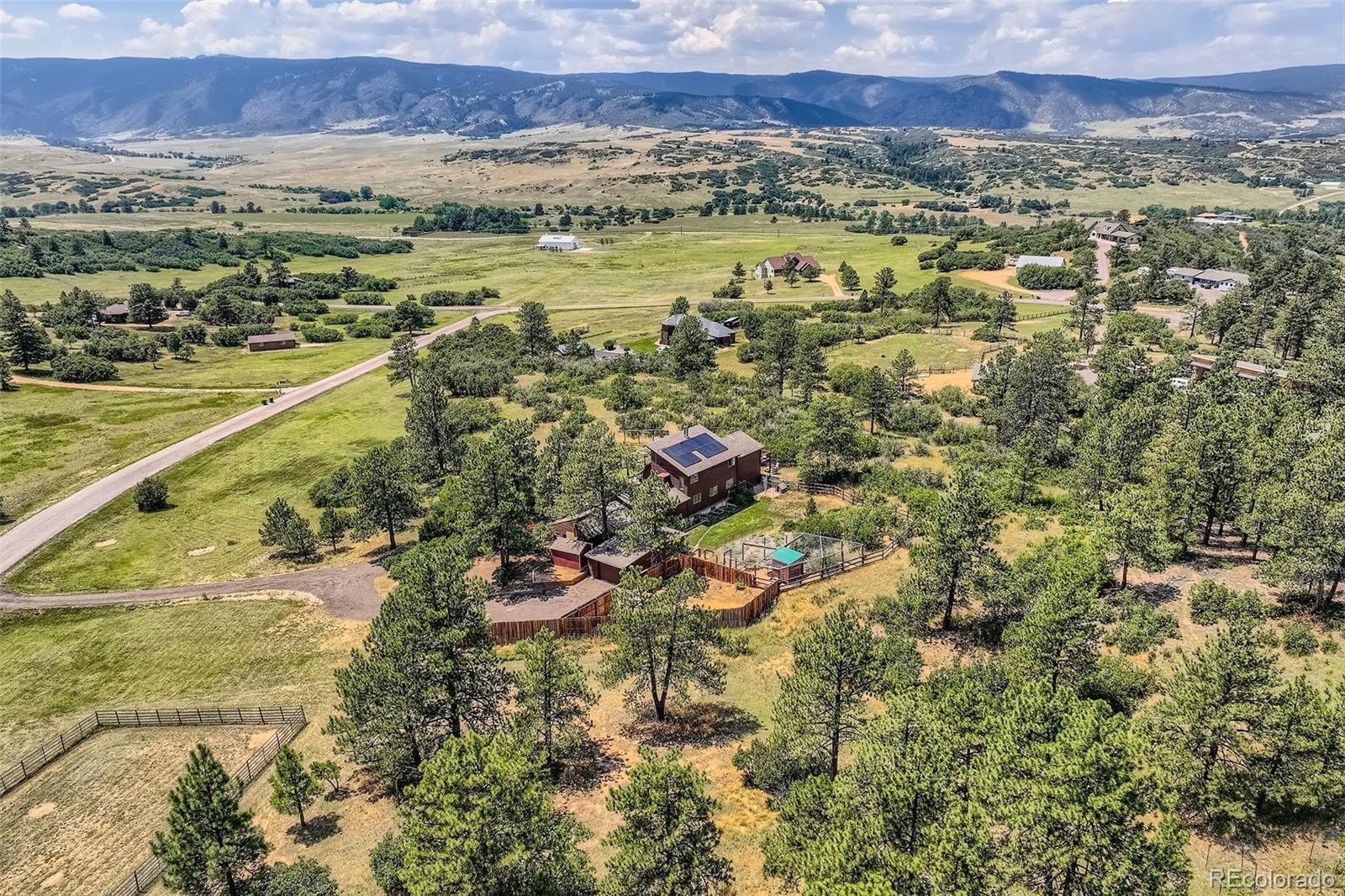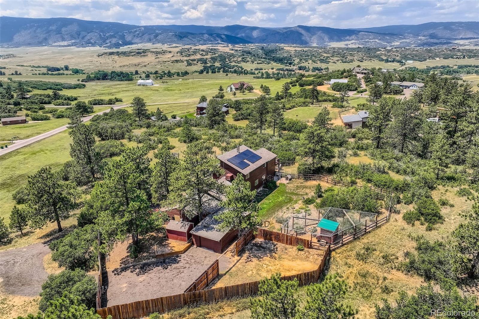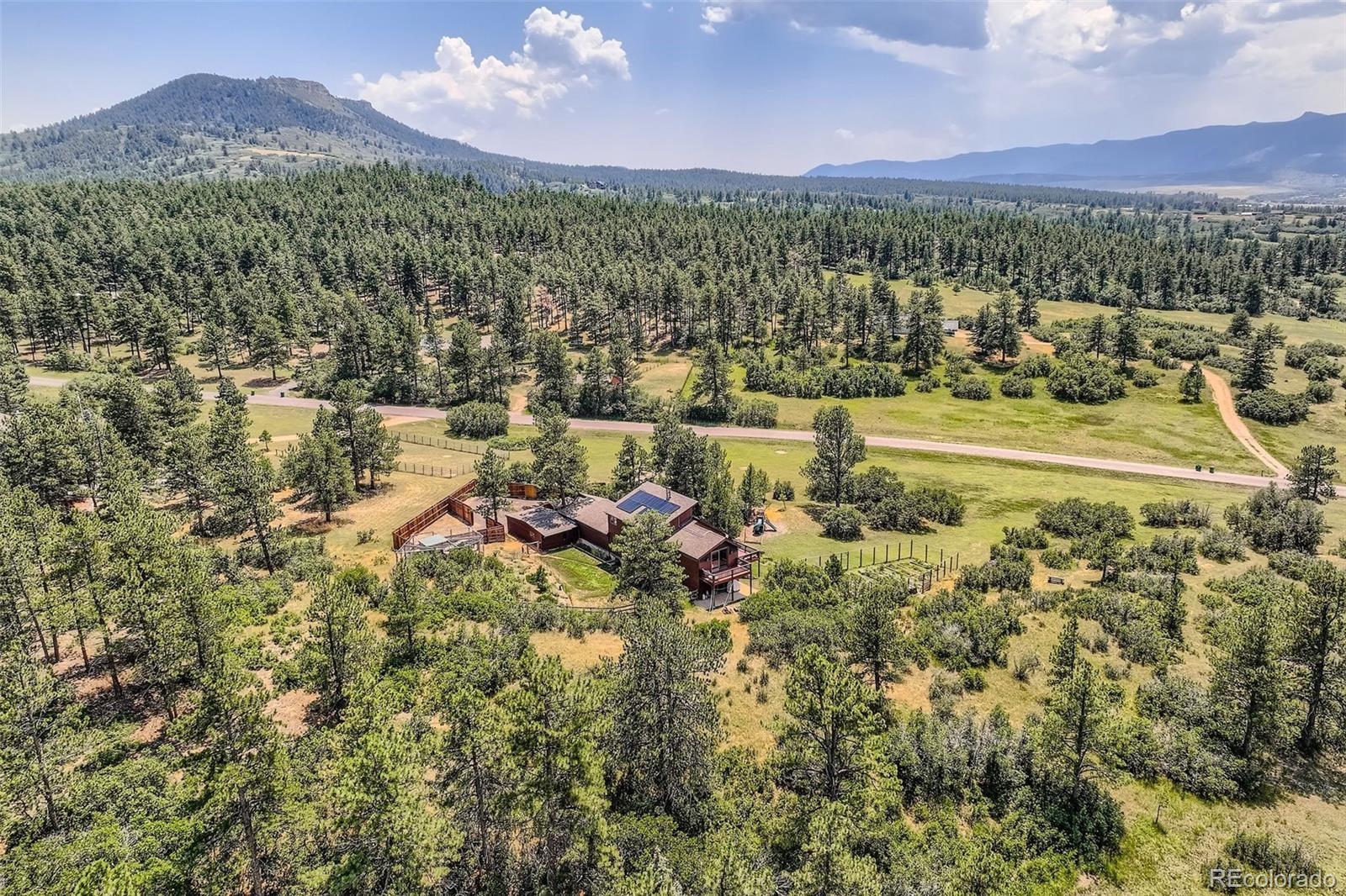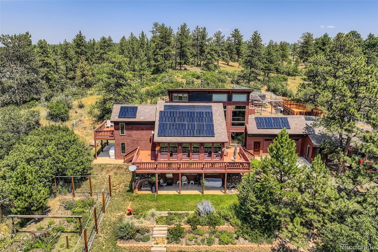 Discover the ultimate Colorado lifestyle in this stunning custom mountain home, just a short 20-minute drive from Castle Rock. Spanning 5.3 acres, this multi-level gem offers 4 bedrooms, a loft, and 4 bathrooms. Step inside to an open floor plan, where a grand great room showcases breathtaking mountain and valley views, a two-story stone fireplace, and charming tongue and groove pine accents. The updated kitchen features a large granite island, double ovens, and sleek granite countertops. The adjoining dining room makes entertaining a breeze with its convenient kitchen pass-through. Retreat to the primary suite with its private deck, ideal for morning coffee or yoga. Additional features include two more bedrooms, a versatile loft for an office or library, and a finished walk-out basement with a family room, bedroom, kitchenette, and bathroom. Enjoy outdoor living with fenced areas for pets, gardens, and a chicken coop. An attached two car garage and a 1085 square foot multi-use addition provide ample space for all your needs. Plus, benefit from a $70,000 solar system fully paid by the seller at closing. Experience peaceful mountain living at its finest.