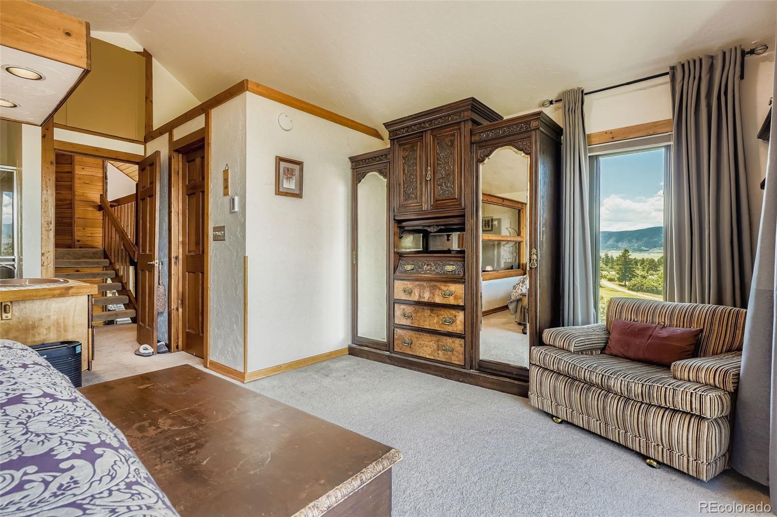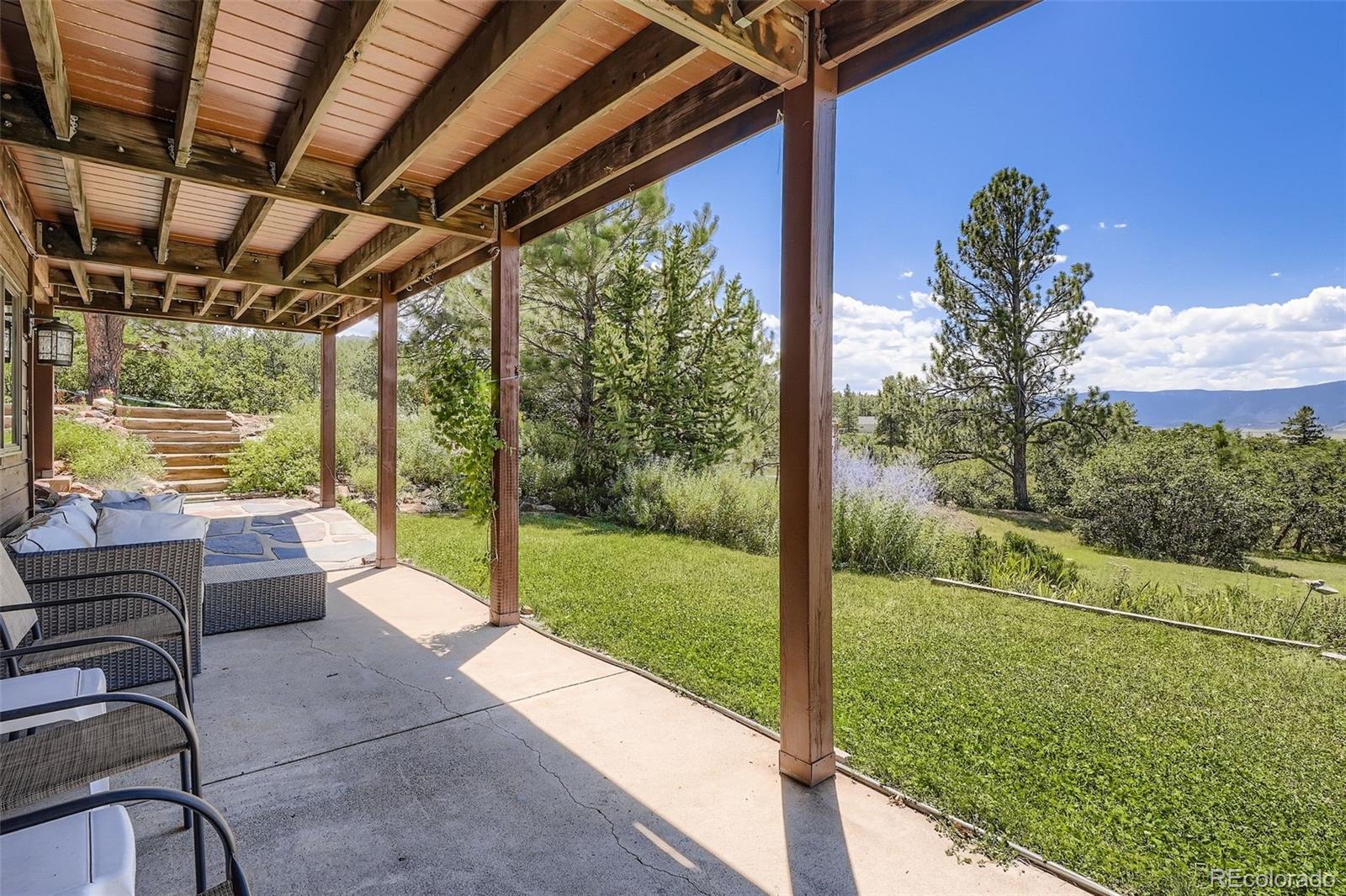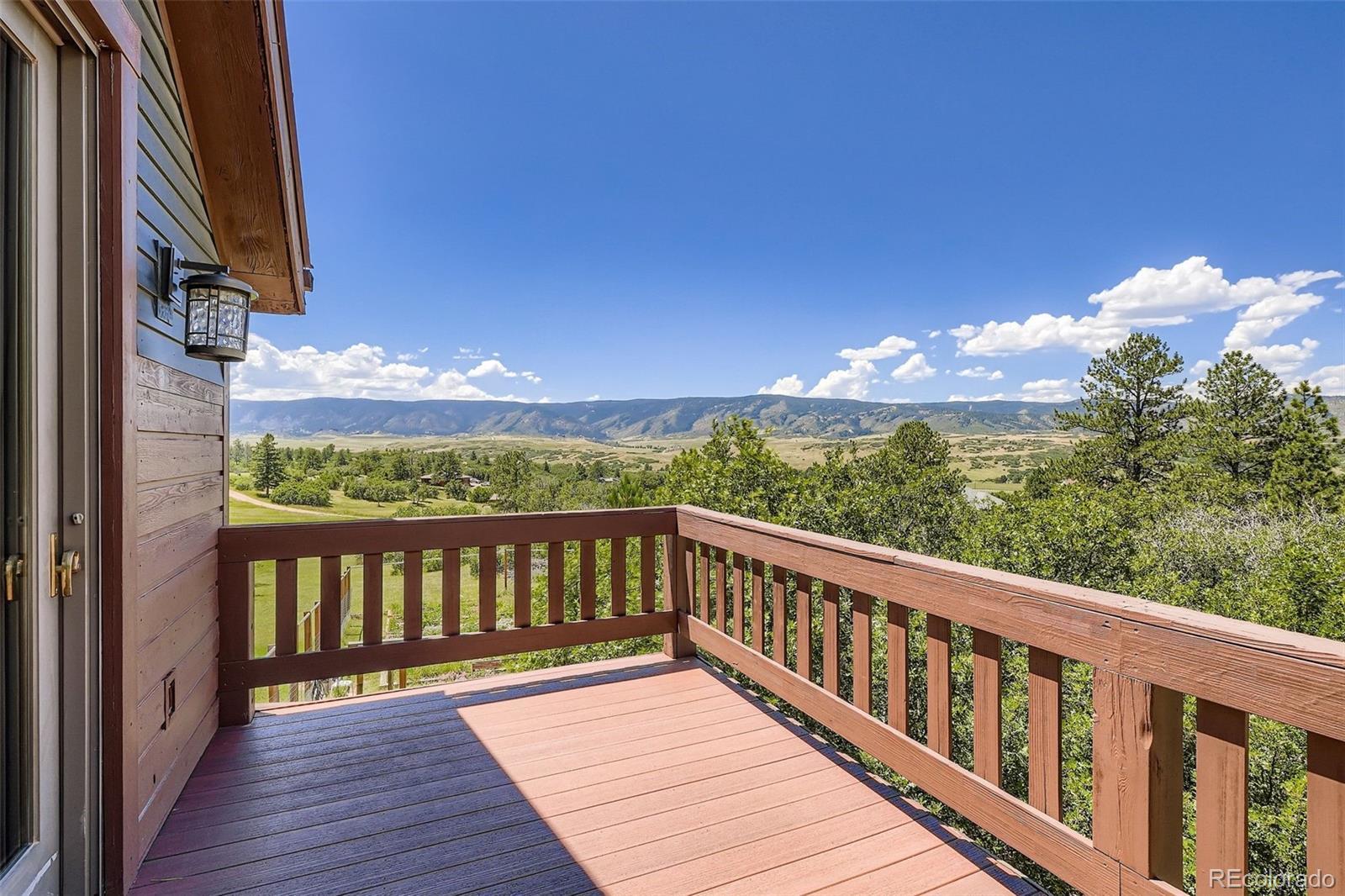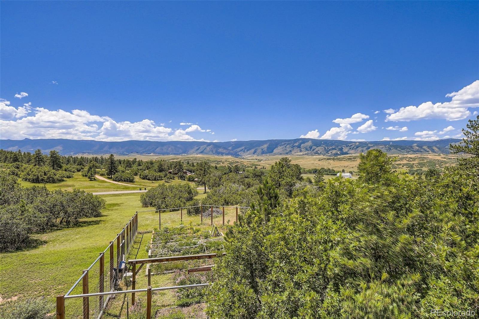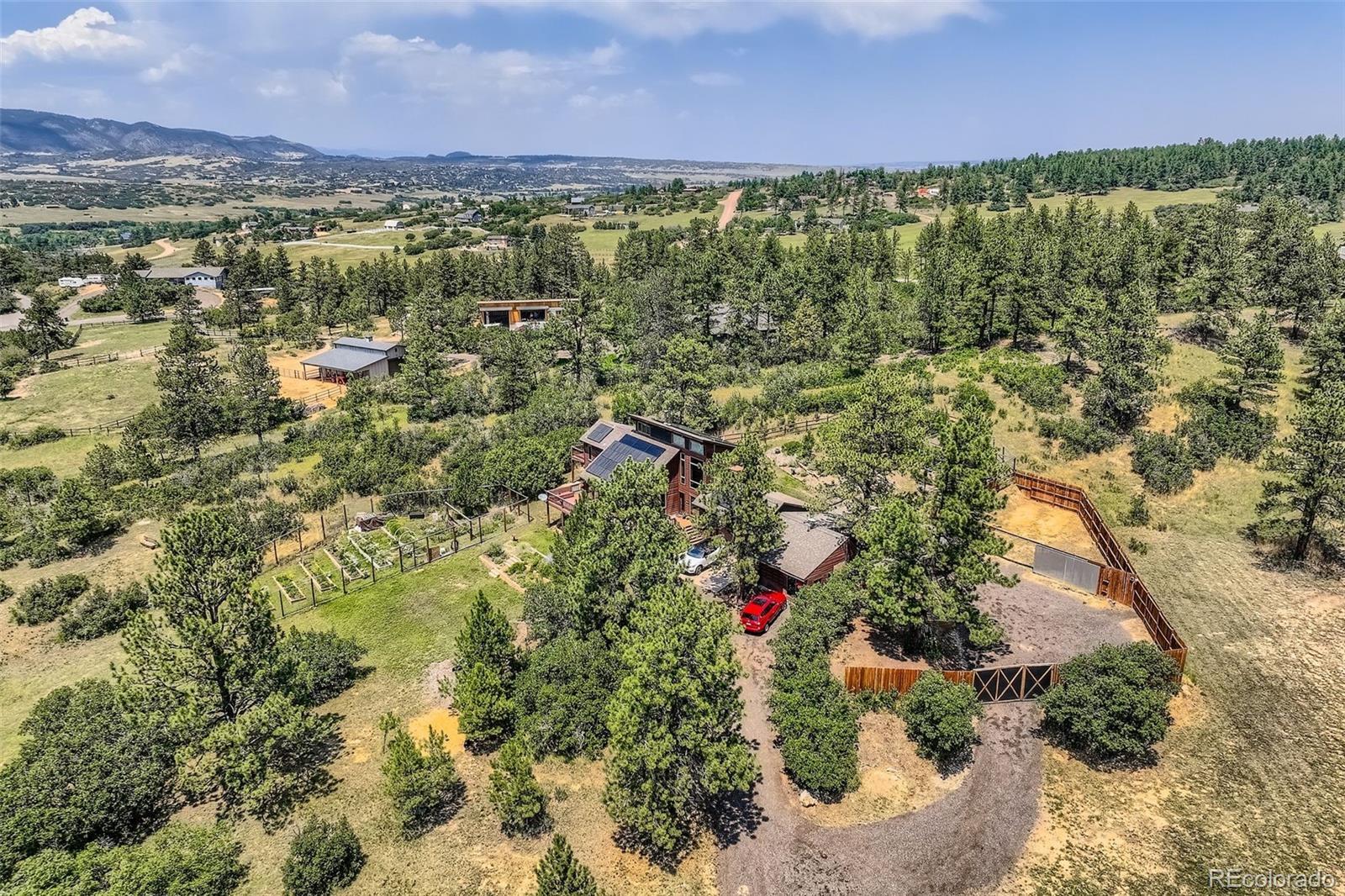 Discover the ultimate Colorado lifestyle in this stunning custom mountain home, just a short 20-minute drive from Castle Rock. Spanning 5.3 acres, this multi-level gem offers 4 bedrooms, a loft, and 4 bathrooms. Step inside to an open floor plan, where a grand great room showcases breathtaking mountain and valley views, a two-story stone fireplace, and charming tongue and groove pine accents. The updated kitchen features a large granite island, double ovens, and sleek granite countertops. The adjoining dining room makes entertaining a breeze with its convenient kitchen pass-through. Retreat to the primary suite with its private deck, ideal for morning coffee or yoga. Additional features include two more bedrooms, a versatile loft for an office or library, and a finished walk-out basement with a family room, bedroom, kitchenette, and bathroom. Enjoy outdoor living with fenced areas for pets, gardens, and a chicken coop. An attached two car garage and a 1085 square foot multi-use addition provide ample space for all your needs. Plus, benefit from a $70,000 solar system fully paid by the seller at closing. Experience peaceful mountain living at its finest.