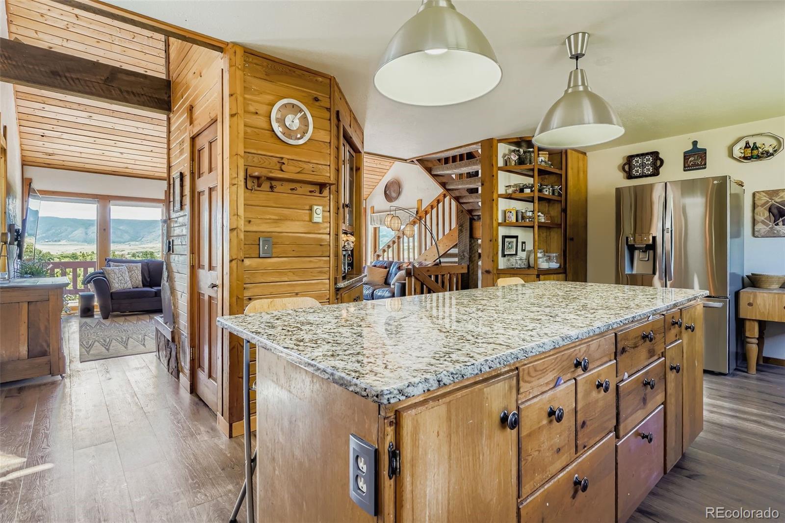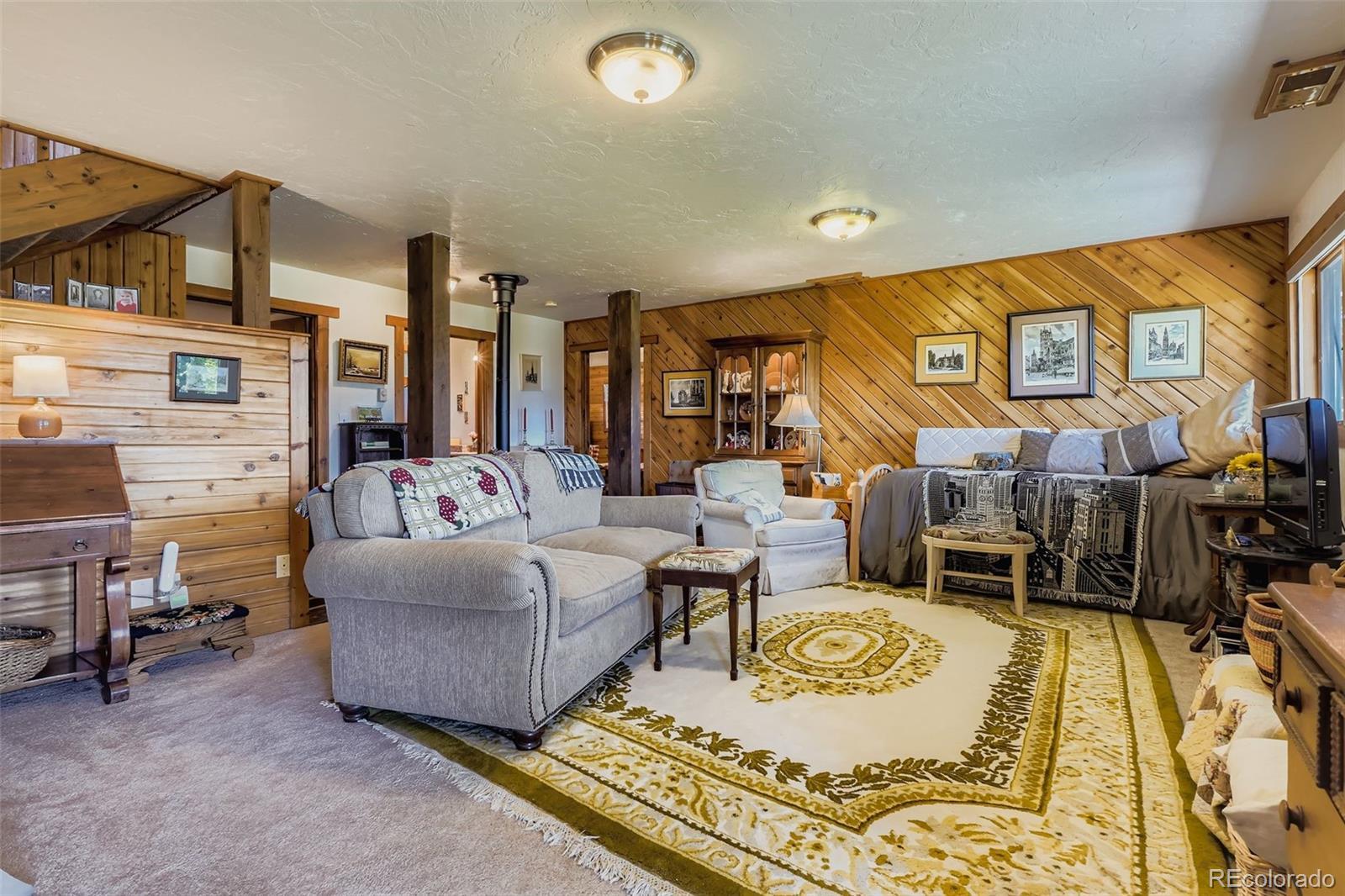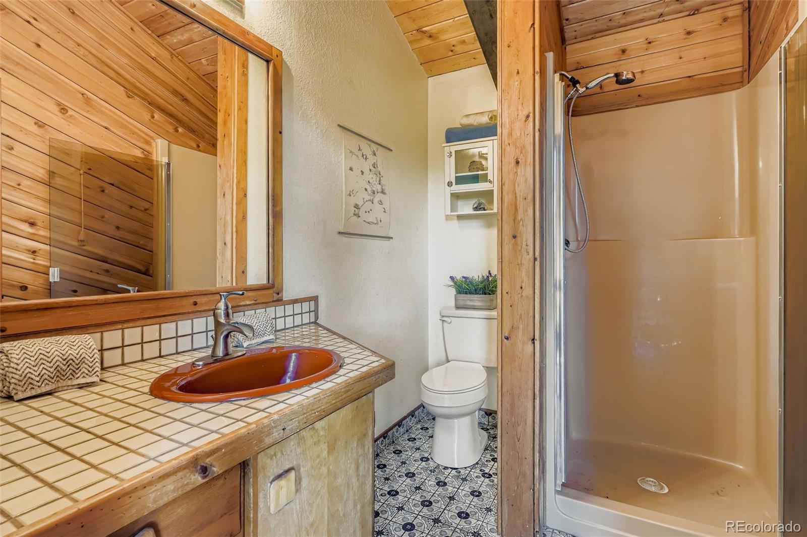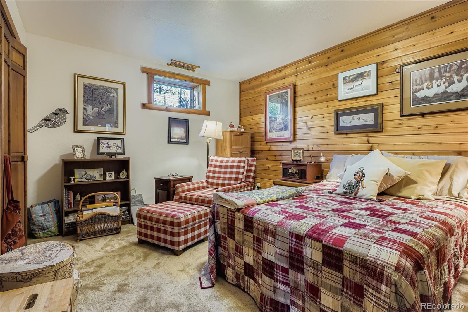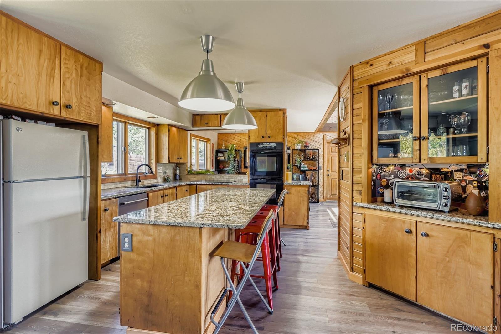 Discover the ultimate Colorado lifestyle in this stunning custom mountain home, just a short 20-minute drive from Castle Rock. Spanning 5.3 acres, this multi-level gem offers 4 bedrooms, a loft, and 4 bathrooms. Step inside to an open floor plan, where a grand great room showcases breathtaking mountain and valley views, a two-story stone fireplace, and charming tongue and groove pine accents. The updated kitchen features a large granite island, double ovens, and sleek granite countertops. The adjoining dining room makes entertaining a breeze with its convenient kitchen pass-through. Retreat to the primary suite with its private deck, ideal for morning coffee or yoga. Additional features include two more bedrooms, a versatile loft for an office or library, and a finished walk-out basement with a family room, bedroom, kitchenette, and bathroom. Enjoy outdoor living with fenced areas for pets, gardens, and a chicken coop. An attached two car garage and a 1085 square foot multi-use addition provide ample space for all your needs. Plus, benefit from a $70,000 solar system fully paid by the seller at closing. Experience peaceful mountain living at its finest.