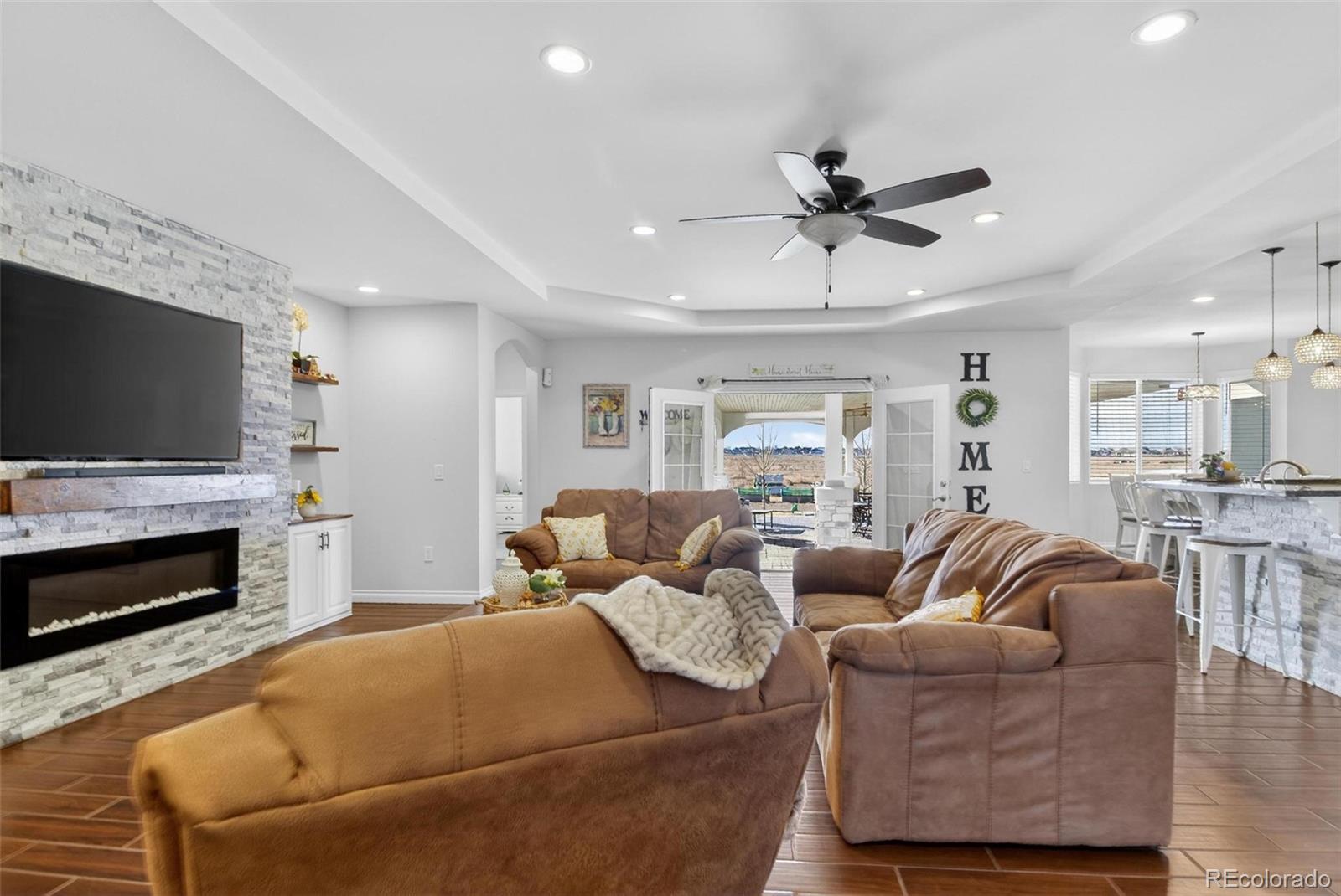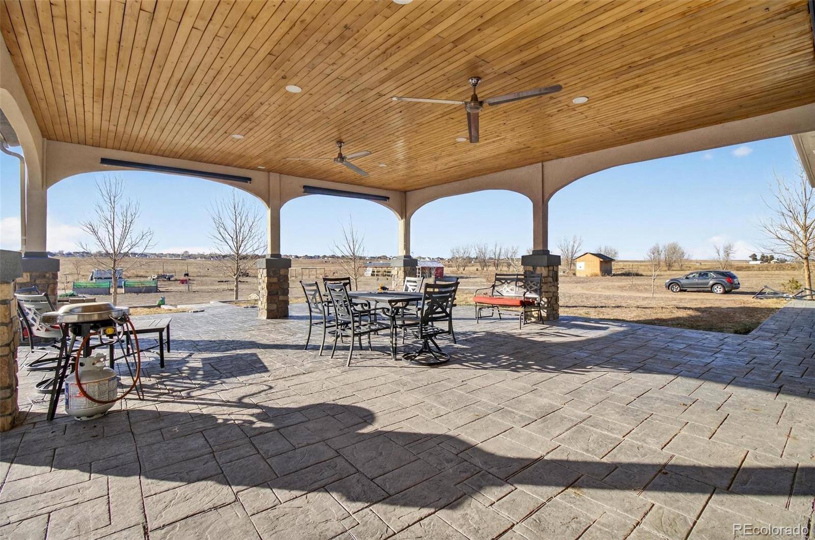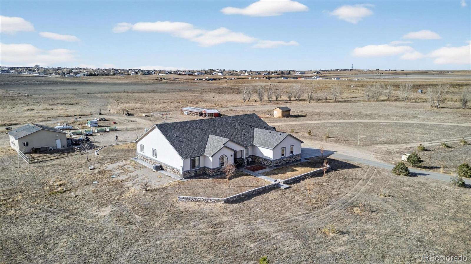 There’s a moment, (usually on I-70, coffee going cold) when you start wondering what a different life might feel like 16301 Hudson Rd is that different life. Just 30 minutes from Downtown Denver and DIA, this exceptional 35-acre fully fenced ranch offers the rare balance of rural freedom and city convenience. Built in 2019, the custom ranch home offers 3,088 sq ft of thoughtfully designed living space with 4 beds and 4 baths. The open layout centers around a dramatic floor-to-ceiling stone fireplace, flowing into the chef’s kitchen featuring granite countertops, stainless appliances and custom cabinetry, perfect for daily living and entertaining. The primary suite feels like a private retreat, complete with a spa-inspired bath, oversized jetted tub, and spacious walk-in closet. Large windows throughout the home capture natural light and sweeping views of your land. Step outside to the 1,200 sq ft covered patio with pine ceiling, integrated lighting, and ceiling fans, an outdoor living space designed for gatherings, quiet mornings, or watching the sunset over your own acreage. The land is where this property truly shines. The 35 acres are fully fenced and ready for animals, with multiple loafing sheds, established pasture, a chicken coop with enclosed run, fruit trees, and raised garden beds already producing. Horses, livestock, hobby farming, or simply enjoying the privacy, this property is ready from day one. The property includes a 34x30 shop with concrete floors, power, overhead doors, covered carport, and half bath. There is also potential for future expansion, including the possibility of an ADU or barndominium for additional living space or income opportunity (Verify with Adams County) Just minutes from I-76 and E-470, Hudson is one of the last areas in the Front Range where you can still find usable acreage, a newer custom home, and reasonable access to Denver. As Denver continues expanding east, properties like this are becoming increasingly rare!