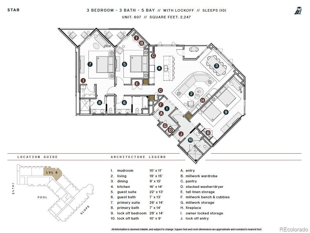 Perched in a prized corner position on the top floor, to-be-built Beckwith Residence 607 combines the rare functionality of a three-bedroom, three-bathroom layout with the elevated comfort of a lockoff suite— making it ideal for both private living and flexible hosting. Spanning 2,247 square feet, this Star floor plan offers the feel of three private suites, plus a seamless indoor-outdoor connection via multiple balconies and panoramic views. Set on the northwest-facing edge of the building, this exterior corner residence enjoys a unique outlook over the vibrant Base Area activity, Gothic Road, and Crested Butte’s beloved Columbine ski trail. The gourmet kitchen is a chef’s dream, with natural stone countertops, high-end appliances, a pantry, and generous space for culinary exploration and entertaining. A custom millwork bench and cubbies at the entry make gear organization effortless. The main living area features wide-plank wood flooring, a sleek electric fireplace, and easy access to a sunny balcony for seamless indoor-outdoor flow. The primary suite includes a walk-in closet, millwork wardrobe, a private balcony, and a spa-inspired en-suite bath with Kohler fixtures and radiant details. A secondary guest suite offers similar privacy and style, while the lockoff suite, with its own entrance, includes an en-suite bath and seating area. Additional features include a dedicated mudroom with cubbies, stacked washer/dryer, owner’s locked storage, and easy elevator access just steps from the front door. The Beckwith is the only ski-in, ski-out resort in the heart of Crested Butte's base area, with world-class amenities including a four-star, community-inspired hotel, seamless ski valet, luxurious spa, adventure concierge, and private mountain & social community, Club Beck. A multi-phased reimaging of Elevation Hotel & Spa will transform almost every space at the resort, with residences anticipated for completion in the Winter 26-27 ski season.