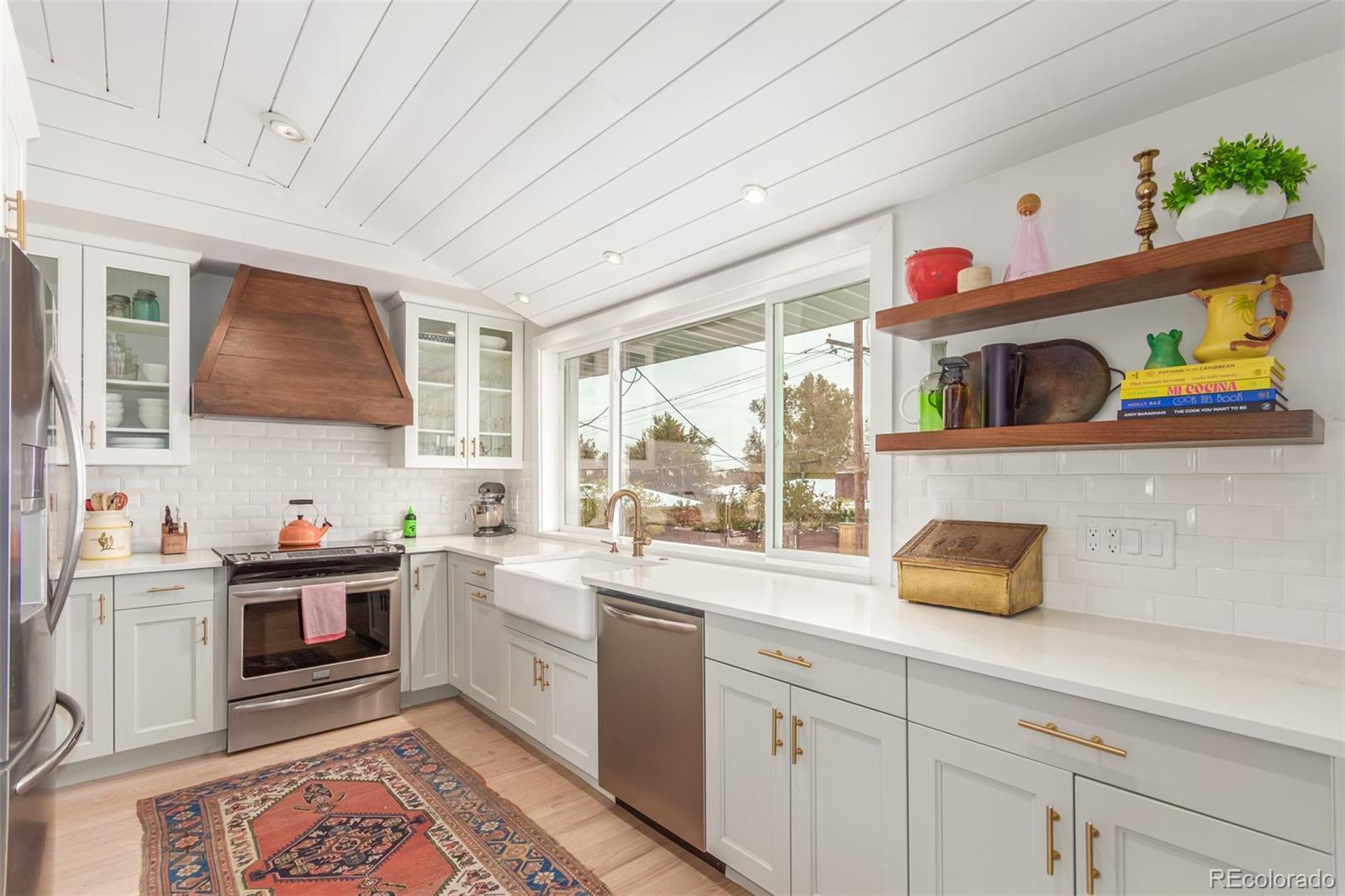 Amazing 1959 Mid-Century ranch style home in the heart of Wheat Ridge with a full finished basement! Light bright, open & airy floor plan with vaulted tongue & groove ceiling. The kitchen & main bathroom have been fully remodeled & seamlessly blend timeless character with modern updates. The kitchen features Quartz counter tops, an undermount single basin farmhouse style sink and stainless-steel appliances. There are a total of three bedrooms & two bathrooms on the main floor. Very cool retro mint tile in the primary bathroom! The basement features numerous flexible spaces for additional bedrooms, offices or entertainment spaces. Ample outdoor spaces, both covered and uncovered for year-round enjoyment. Huge, fenced yard with a gardeners dream setup! All new flooring and trim in the basement. There are owned solar panels which should cover all electricity needs on a year-round basis to help cut costs. Electric vehicle charger in the garage for fast charging at home. A second electrical panel in the garage allows any future changes. New items include: gutters, soffit, facia, basement floors, trim and doors, sewer line, furnace, AC, water heater, fencing, hardscaping, retaining wall and app controlled irrigation system. Short walk to Crown Hill Park. Easy access to Olde Town Arvada, I-70, downtown Golden, Colorado Mills Mall, downtown Denver. Grocery stores and shopping Wadsworth include the new indoor pickle ball court! Short walk to Crown Hill Park. Only 3 miles to the following Light Rail Stations - Olde Town Arvada Station and Lamar Station. Nothing to do but move in enjoy all of the comfort and convenience of this amazing home! Get into this area now and enjoy the equity bump from the new mixed-use neighborhood going in right across the street! The City’s “Lutheran Legacy Campus” plan calls for housing of varied types, small-scale retail and civic space along 38th, plus significant parks and trails, with historic elements like the Blue House and chapel retained.