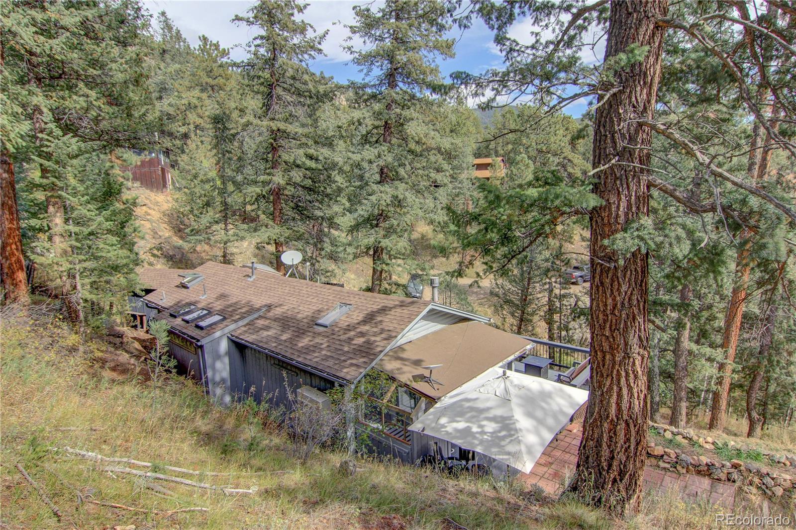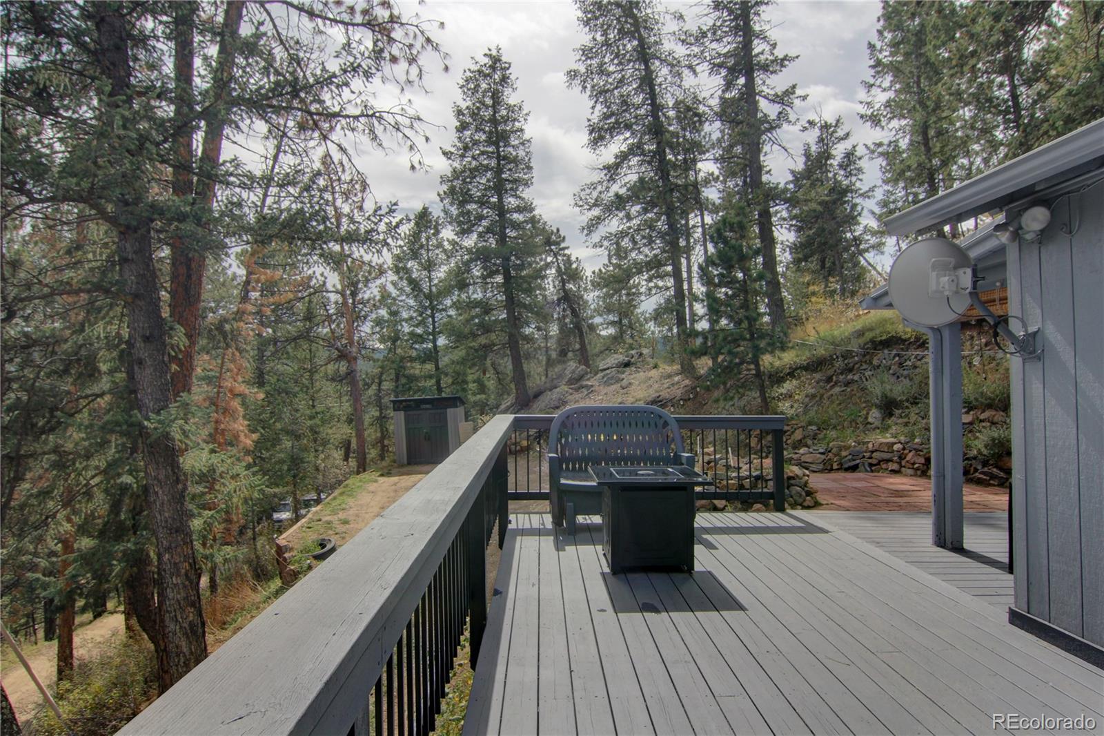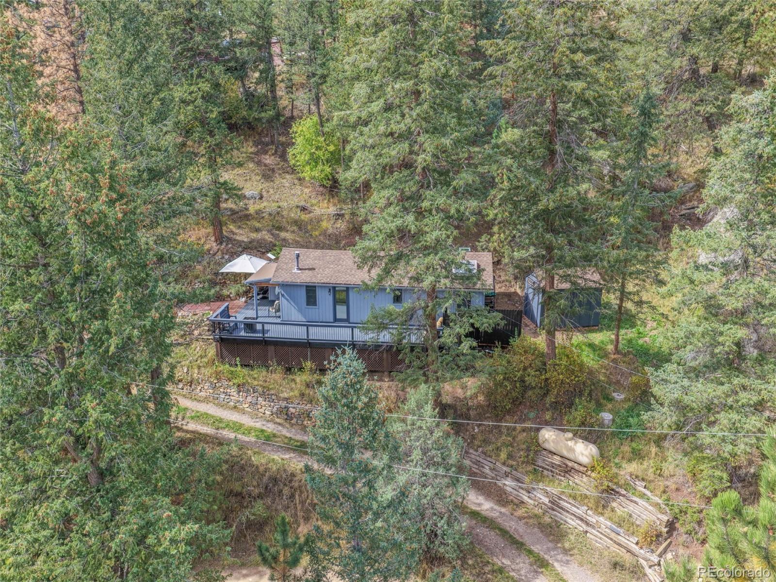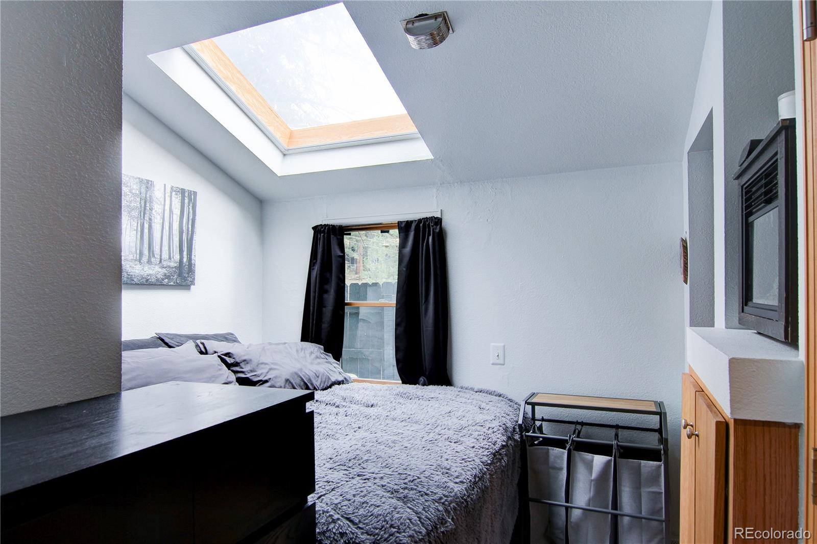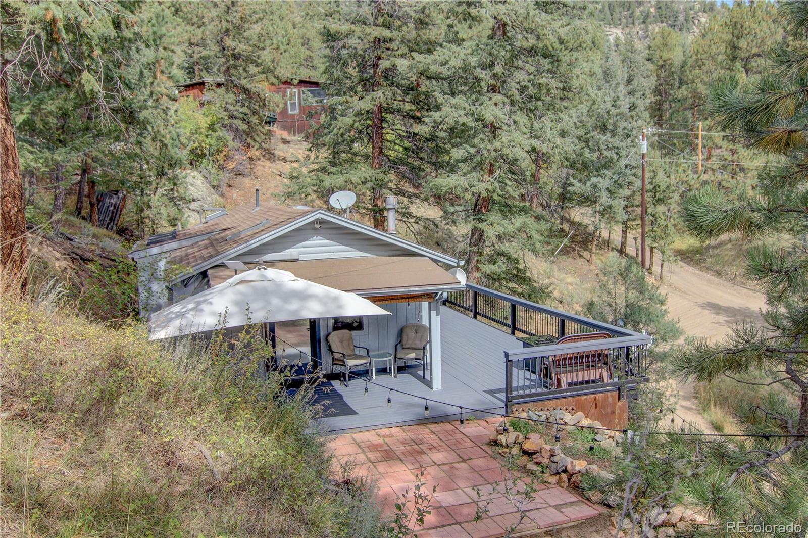 Prime location! Under 500K! Unlock your idyllic lifestyle at this cozy mountain home located just off Upper Bear Creek Rd, a coveted location. This cozy mountain home has a welcoming covered front porch with large wrap around deck which sets the stage for Colorado sunrises, morning coffee or entertaining friends. As you enter the home notice the abundance of natural light provided by a glass block wall and 6 skylights throughout. Living area is open providing a versatile 2 tier floor plan. Gleaming hardwoods throughout add to the warmth and charm of this cozy space. Living room has a propane fireplace for ambience on those snowy nights plus built in bookshelves for all your treasures, mirrored closet doors lead to oversized closet. Double entry doors allow for access to your newly finished deck. 2nd tier is complete with glass block wall and 3 skylights that let in an abundance of natural light. New barn door leads to the ensuite Master bedroom and bath. Bathroom has plenty of counter space, an extra large mirror, vanity built into counter top as well as a skylight to let in fresh air, plus full size stackable washer and dryer hookups. The bedroom has a huge Skylight for star gazing, built in niche and cabinet, closet and carpet. 1 huge shed and 2nd shed complete this property. Paddle board or ice skate in the morning, bike or hike in the afternoon, and fish in the evening. New mini split HVAC (heat pump/ AC) system, new refinished deck, new exterior and interior paint. Down the street from the fire department and the renown Tall Grass Spa, 5 miles to Bear lake, downtown evergreen and golf coarse. 4.9 miles to Mt. Evans State Wildlife Area. 15 minutes to top of Squaw Pass, 20 minutes to Echo Mountain Ski Resort, 25 minutes to Echo Lake. NO HOA. Potential investment opportunity. HURRY!