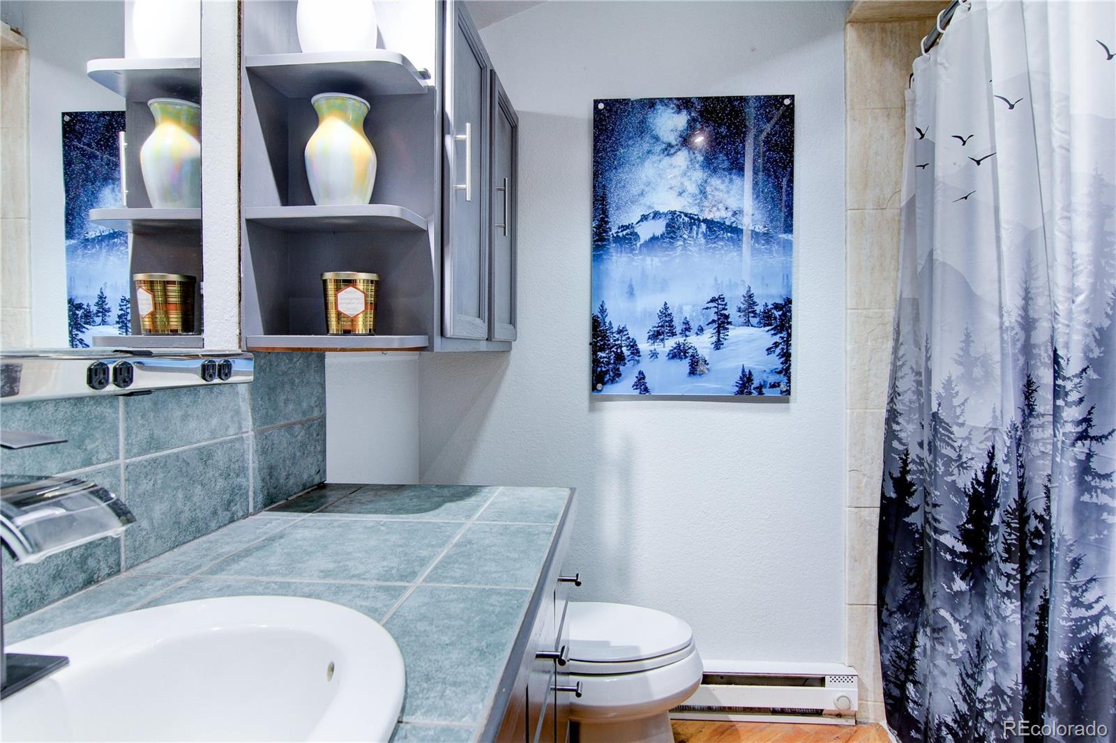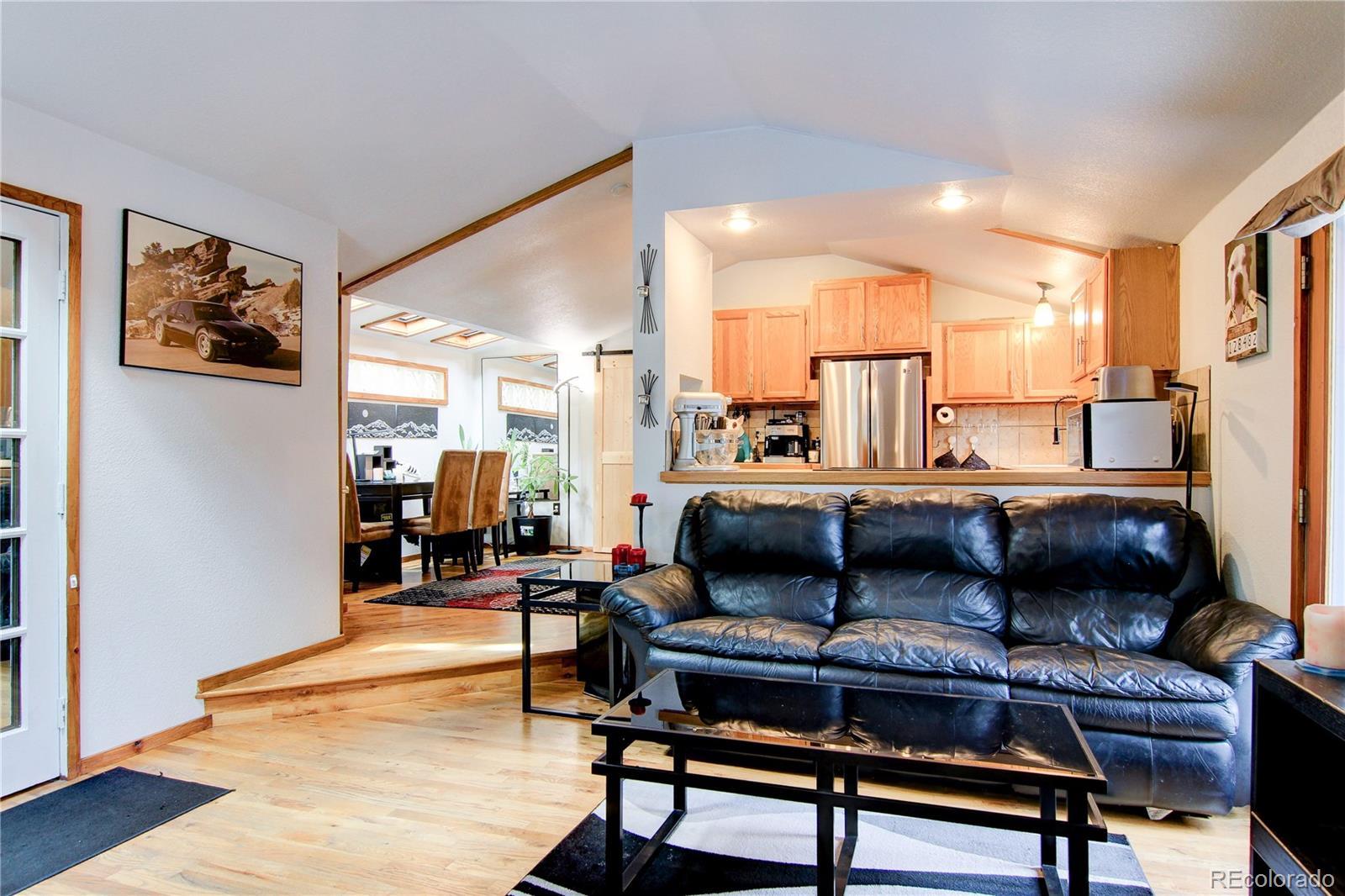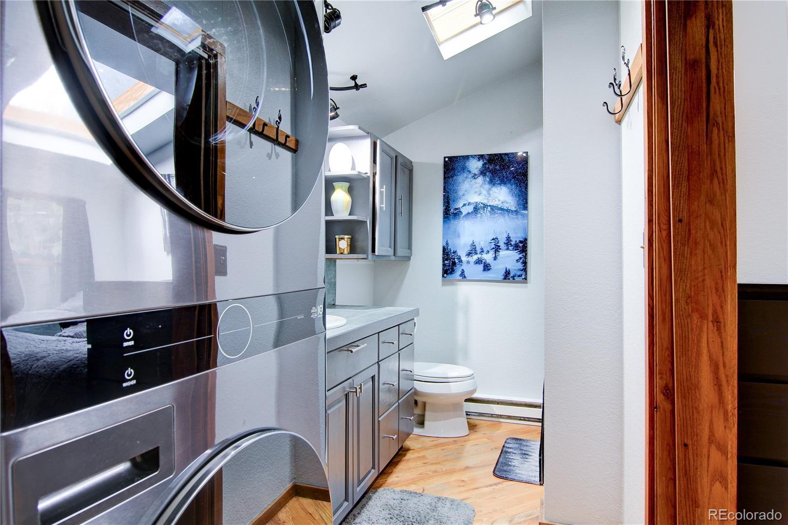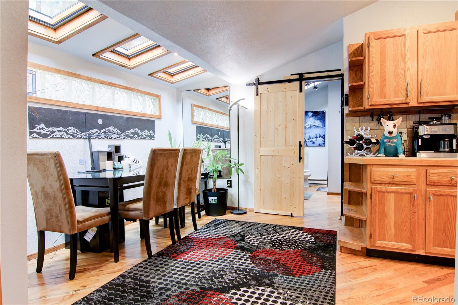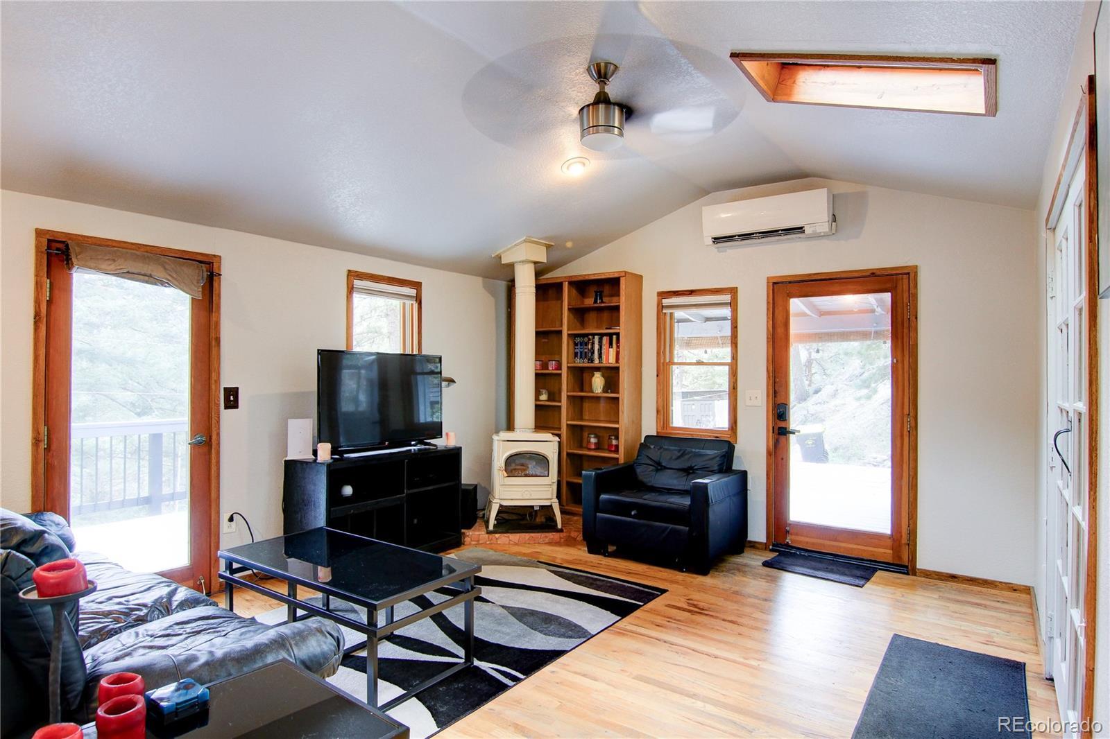Prime location! Under 500K! Unlock your idyllic lifestyle at this cozy mountain home located just off Upper Bear Creek Rd, a coveted location. This cozy mountain home has a welcoming covered front porch with large wrap around deck which sets the stage for Colorado sunrises, morning coffee or entertaining friends. As you enter the home notice the abundance of natural light provided by a glass block wall and 6 skylights throughout. Living area is open providing a versatile 2 tier floor plan. Gleaming hardwoods throughout add to the warmth and charm of this cozy space. Living room has a propane fireplace for ambience on those snowy nights plus built in bookshelves for all your treasures, mirrored closet doors lead to oversized closet. Double entry doors allow for access to your newly finished deck. 2nd tier is complete with glass block wall and 3 skylights that let in an abundance of natural light. New barn door leads to the ensuite Master bedroom and bath. Bathroom has plenty of counter space, an extra large mirror, vanity built into counter top as well as a skylight to let in fresh air, plus full size stackable washer and dryer hookups. The bedroom has a huge Skylight for star gazing, built in niche and cabinet, closet and carpet. 1 huge shed and 2nd shed complete this property. Paddle board or ice skate in the morning, bike or hike in the afternoon, and fish in the evening. New mini split HVAC (heat pump/ AC) system, new refinished deck, new exterior and interior paint. Down the street from the fire department and the renown Tall Grass Spa, 5 miles to Bear lake, downtown evergreen and golf coarse. 4.9 miles to Mt. Evans State Wildlife Area. 15 minutes to top of Squaw Pass, 20 minutes to Echo Mountain Ski Resort, 25 minutes to Echo Lake. NO HOA. Potential investment opportunity. HURRY!