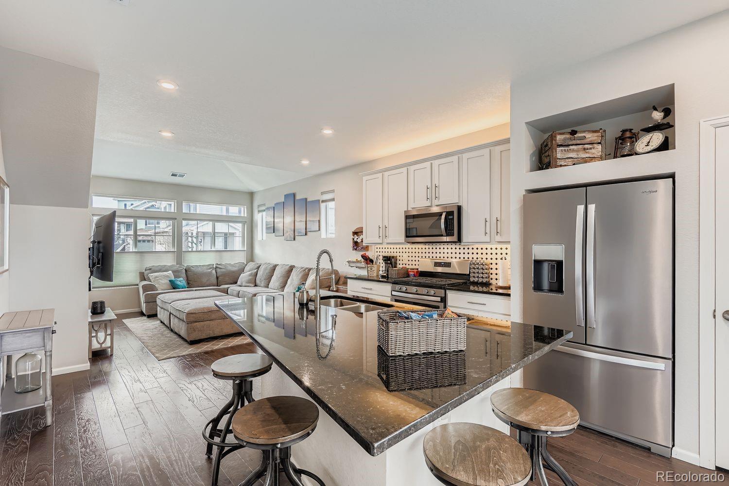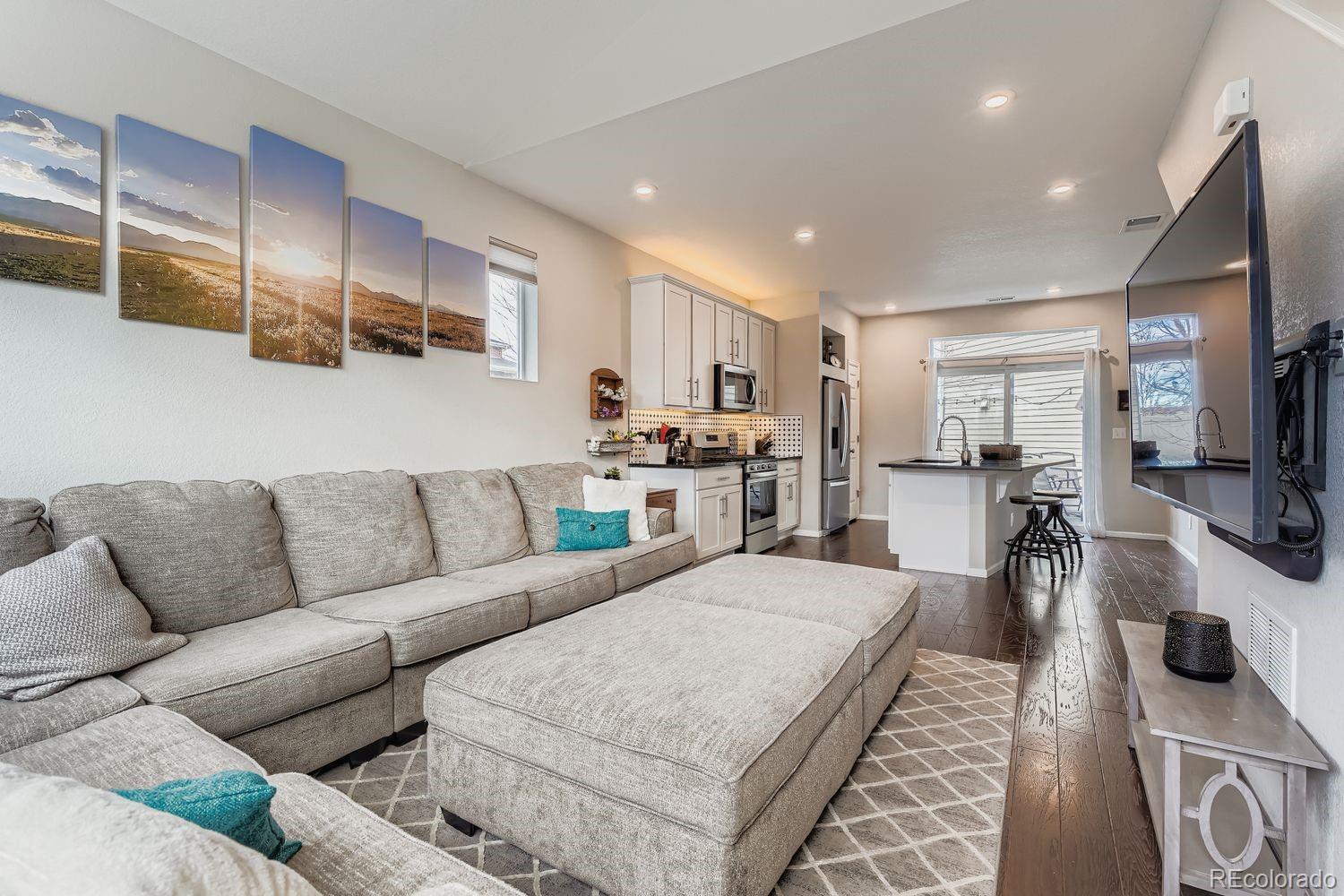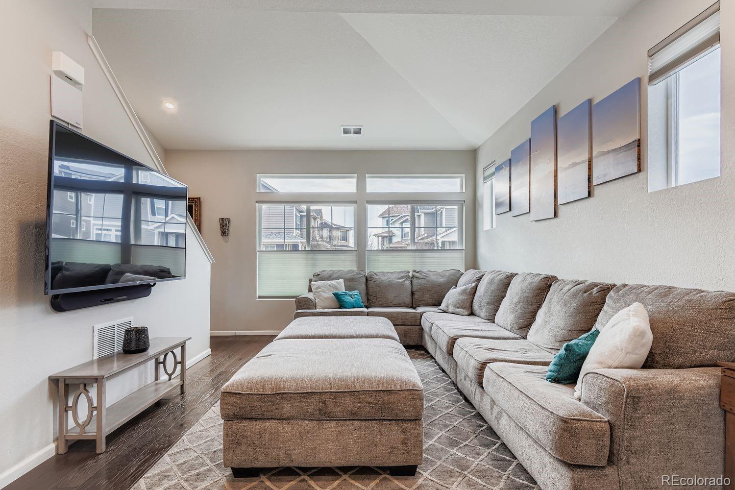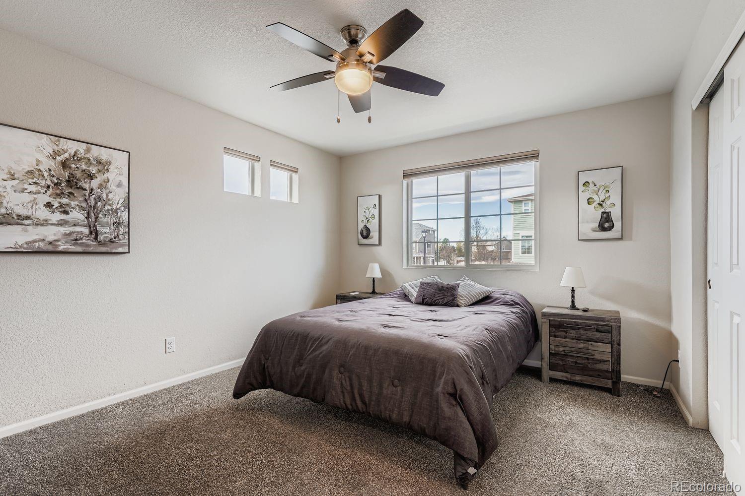 Welcome home to this beautiful, turnkey 2 bedroom, 2.5-bathroom home in Thornton. Located at the entrance to a quiet cul-de-sac in the Villages at Riverdale, this home has been meticulously maintained and is ready for you to make it your own. Featuring granite countertops, newer Range/Oven, Refrigerator, Dishwasher with an island sink with seating, you'll be right at home. The HOA takes care of maintenance of areas outside the enclosed back yard, where you'll find a spacious deck with plenty of room for entertaining or relaxing. The back yard is complete with a synthetic lawn, meaning no mowing! With up/down adjustable blinds you'll be able to let in as much or as little light as you'd like in the living room and in the upstairs bedrooms... Both of which have their own private bathroom! The 2-car attached garage is roomy and boasts plenty of storage overhead as well. Close to parks, walking trails, shopping, and with easy access to 470, I-25, I-76 and Hwy 85, you're close to everything, but away from it all. The home has 3 flat screen televisions (1 in the living room, and each bedroom) which will stay with the home, and all furnishings are negotiable as well.