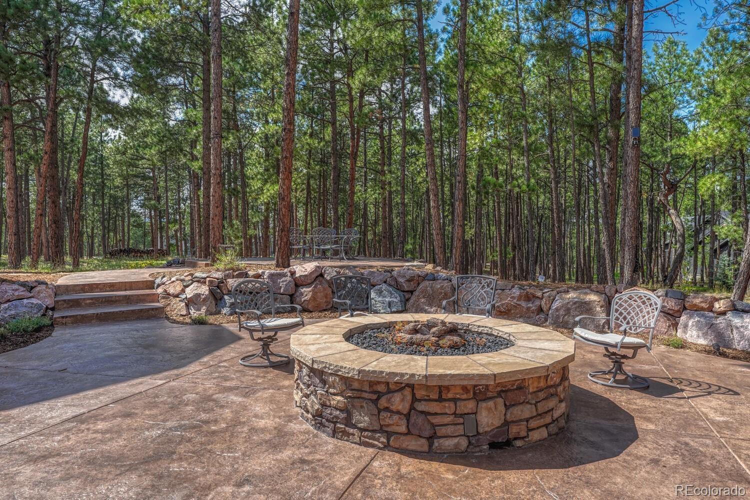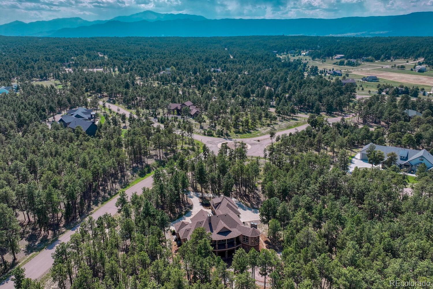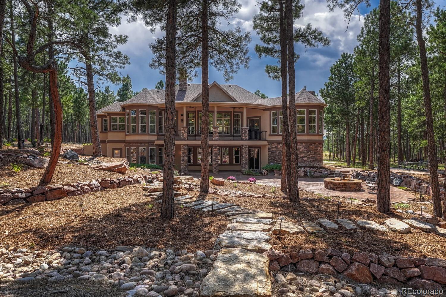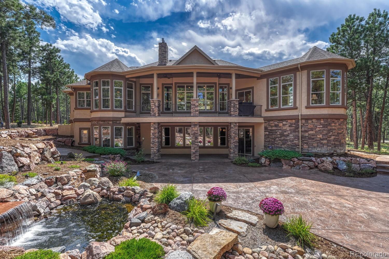 1360 Trumpeters Court offers an exceptional Colorado living experience! 5 bedrooms,6 bathrooms and 5 car garage located in the highly sought after Hilltop Pines neighborhood & Lewis Palmer School District 38! This open floor plan features a large primary suite with french doors, amazing windows, vaulted ceilings, luxurious 5-piece bathroom & soaking tub, a glass-enclosed shower and two generous walk-in closets. All 4 bedrooms feature walk-in closets and private full baths with jet tubs. The spacious dining room has cathedral ceiling and lots of sunlight. Gourmet kitchen is a chef’s dream equipped with top-of the line appliances, new Subzero refrigerator, double oven and gas cooktop, newer Wolf microwave. Granite countertops and newly refinished wood floors throughout. The sunroom is warm & cozy & provides amazing views of the beautiful backyard. Walk-in pantry, mud room w/ laundry, utility sink & storage. The living room features a beautiful stone fireplace, soaring ceilings, a wall of windows letting plenty of natural light & views of the soaring Ponderosa Pines. The walk-out lower level features a spacious family room with a floor to ceiling stone fireplace, full size wet bar & a hidden walk in safe room, media & game room! Seamless indoor/outdoor access flows to the covered patio. Situated on 2.59 acre treed lot, this home offers privacy, natural beauty & a serene environment. The outdoor living at its finest with an amazing stone fire place and a multi -level outdoor water feature like no other! Fully landscaped, large stamped cement patio & fire pit for entertaining. Extra features & upgrades: Central Vacuum System, Smart home controls throughout, new class 4 roof, new HVAC, new Wolf appliances, new water heater, whole house water filter, whole house humidifier, PetSafe wireless dog fence, exterior fully repainted, rubber floor in workout room & equipment stays! Easy access to I-25, COS & Denver. Don't miss this opportunity to own this one-of-a-kind property!