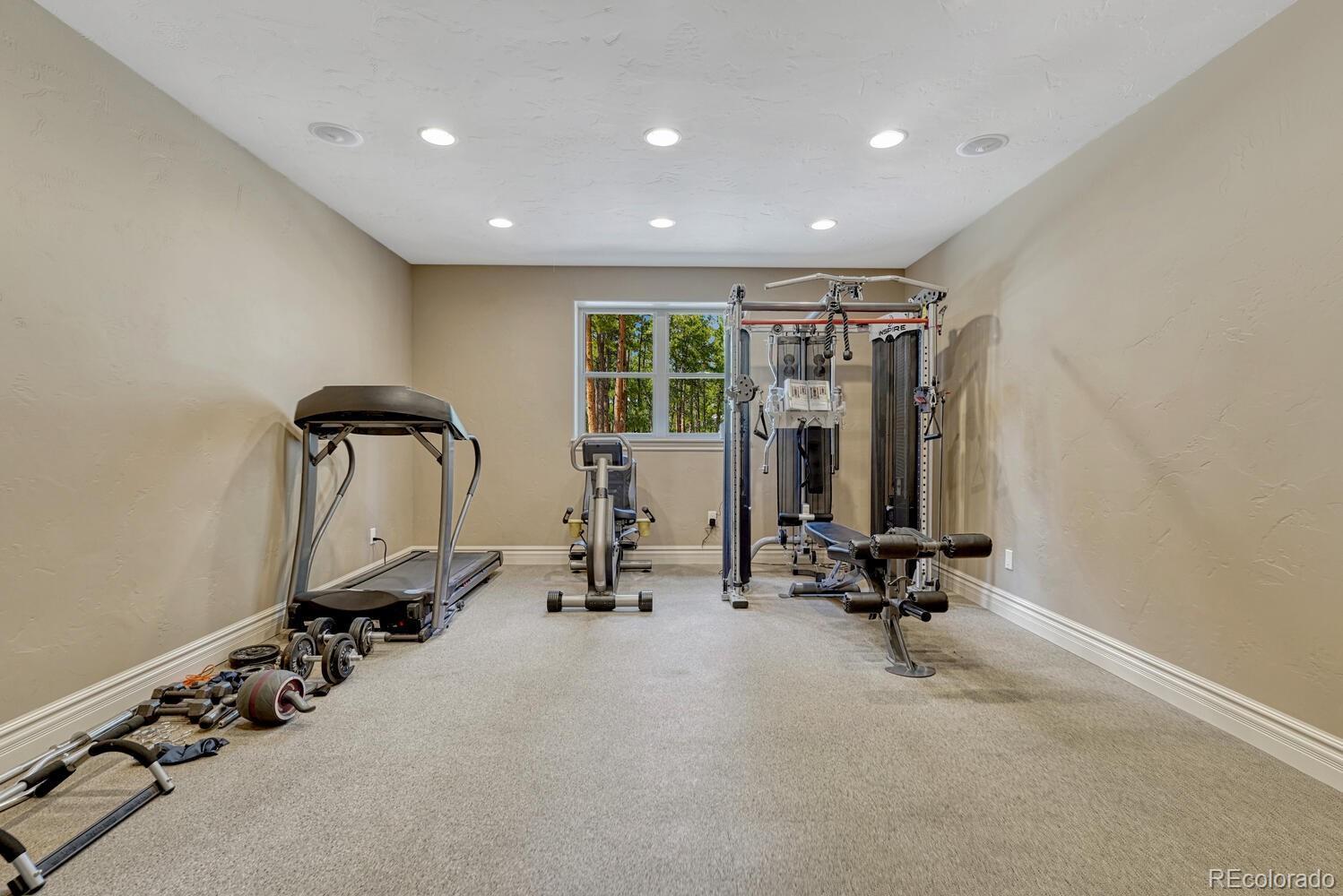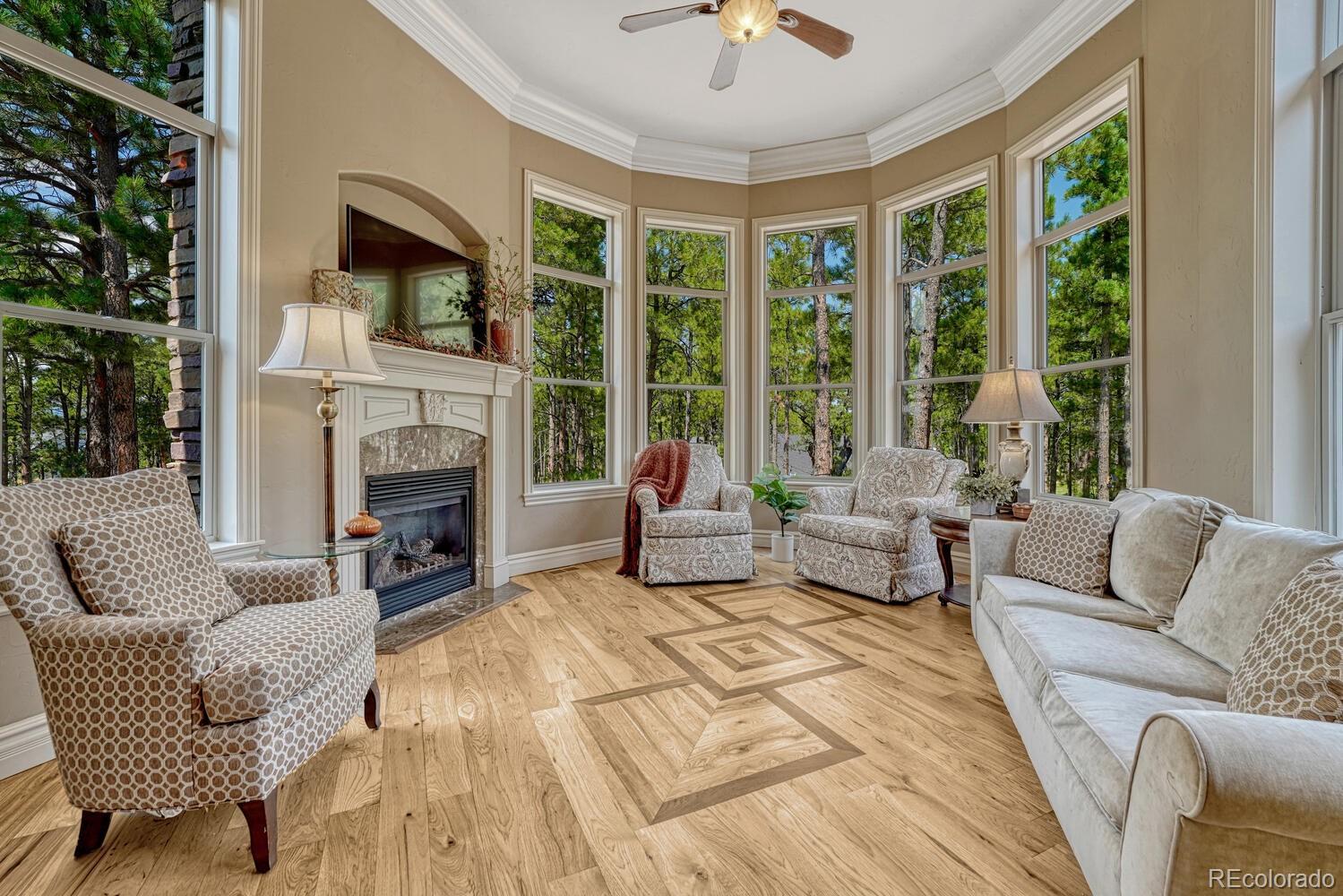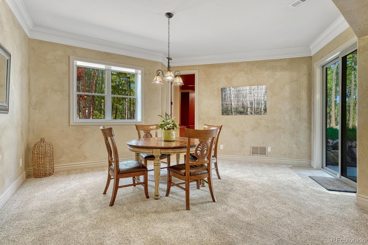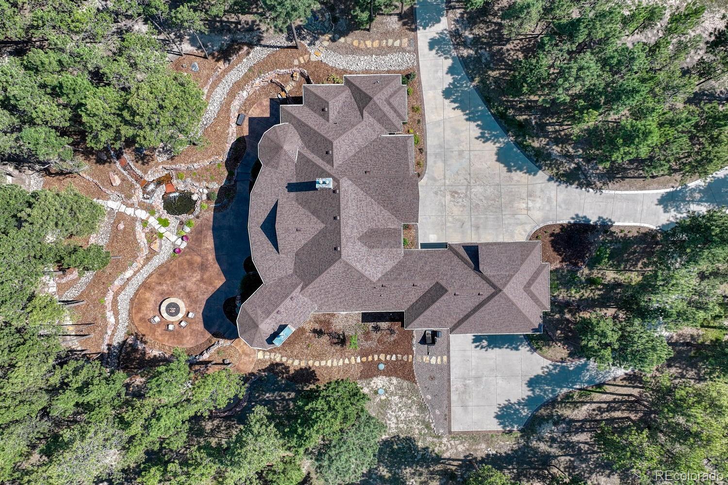 1360 Trumpeters Court offers an exceptional Colorado living experience! 5 bedrooms,6 bathrooms and 5 car garage located in the highly sought after Hilltop Pines neighborhood & Lewis Palmer School District 38! This open floor plan features a large primary suite with french doors, amazing windows, vaulted ceilings, luxurious 5-piece bathroom & soaking tub, a glass-enclosed shower and two generous walk-in closets. All 4 bedrooms feature walk-in closets and private full baths with jet tubs. The spacious dining room has cathedral ceiling and lots of sunlight. Gourmet kitchen is a chef’s dream equipped with top-of the line appliances, new Subzero refrigerator, double oven and gas cooktop, newer Wolf microwave. Granite countertops and newly refinished wood floors throughout. The sunroom is warm & cozy & provides amazing views of the beautiful backyard. Walk-in pantry, mud room w/ laundry, utility sink & storage. The living room features a beautiful stone fireplace, soaring ceilings, a wall of windows letting plenty of natural light & views of the soaring Ponderosa Pines. The walk-out lower level features a spacious family room with a floor to ceiling stone fireplace, full size wet bar & a hidden walk in safe room, media & game room! Seamless indoor/outdoor access flows to the covered patio. Situated on 2.59 acre treed lot, this home offers privacy, natural beauty & a serene environment. The outdoor living at its finest with an amazing stone fire place and a multi -level outdoor water feature like no other! Fully landscaped, large stamped cement patio & fire pit for entertaining. Extra features & upgrades: Central Vacuum System, Smart home controls throughout, new class 4 roof, new HVAC, new Wolf appliances, new water heater, whole house water filter, whole house humidifier, PetSafe wireless dog fence, exterior fully repainted, rubber floor in workout room & equipment stays! Easy access to I-25, COS & Denver. Don't miss this opportunity to own this one-of-a-kind property!