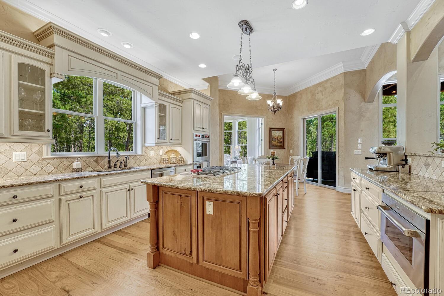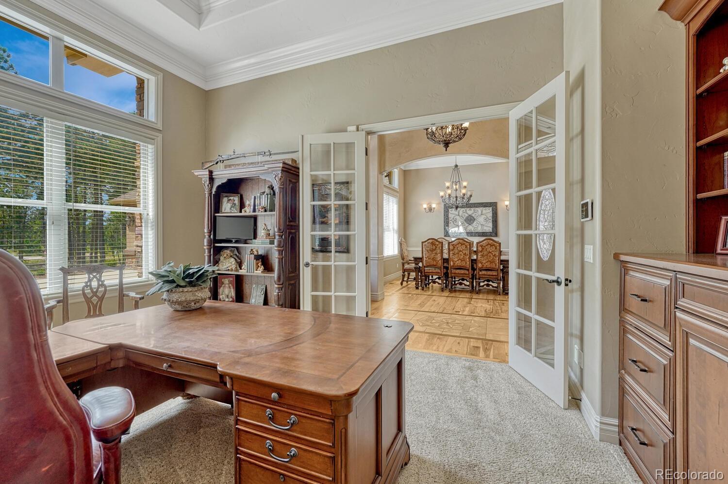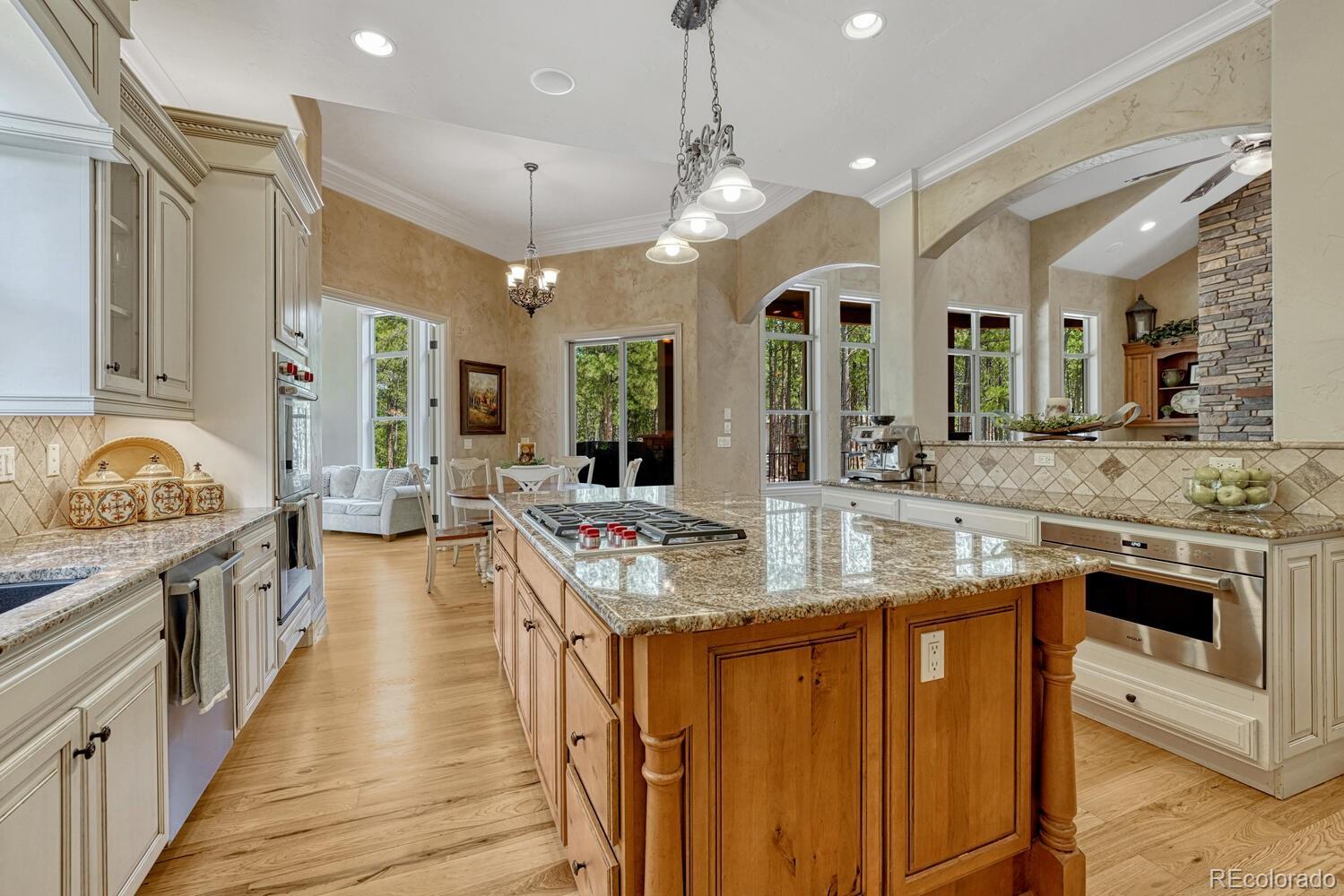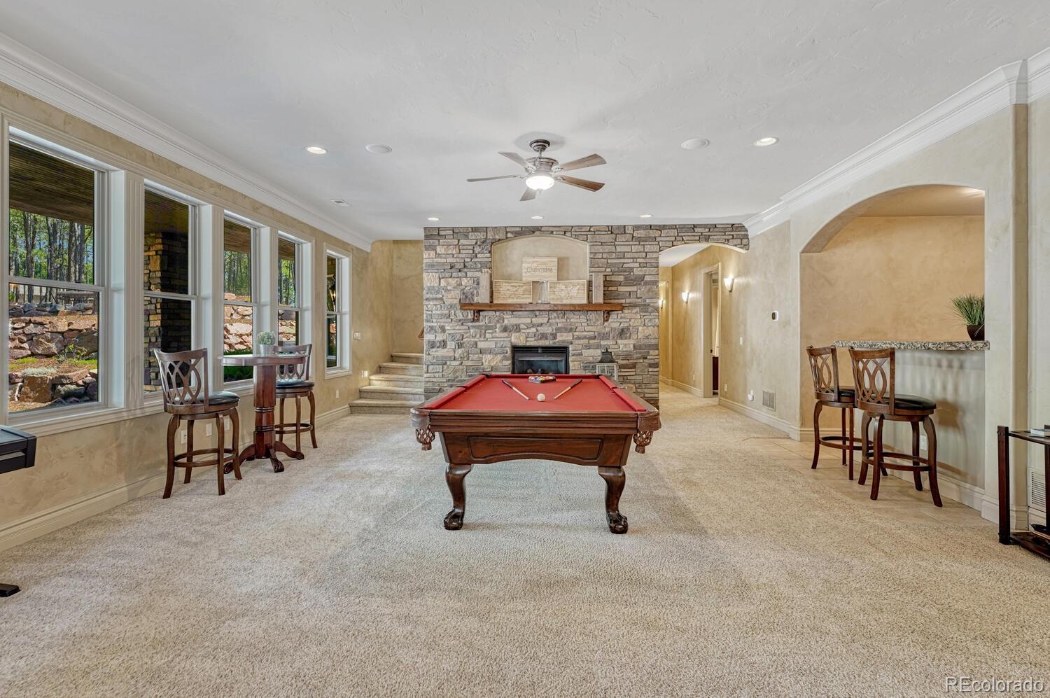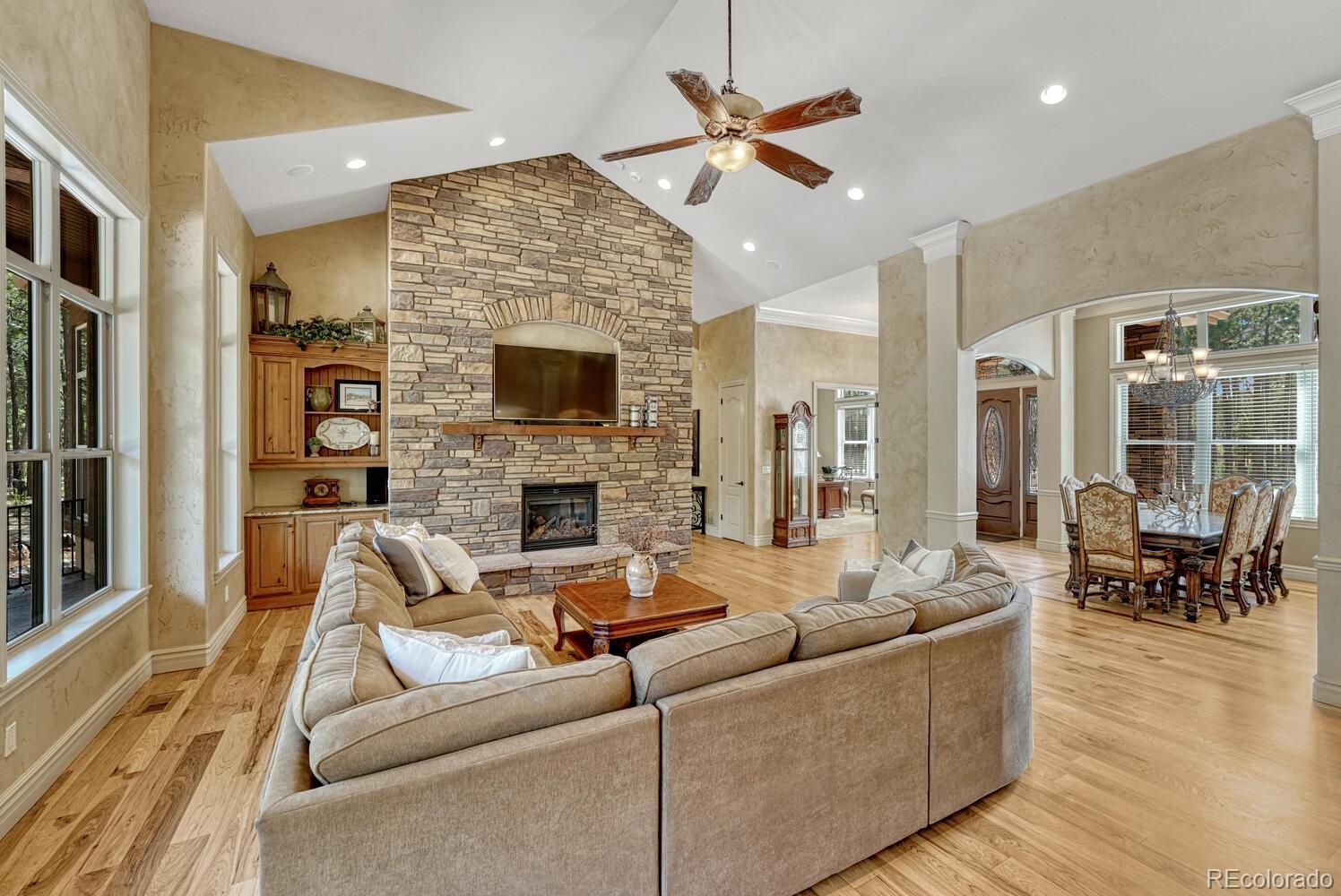 1360 Trumpeters Court offers an exceptional Colorado living experience! 5 bedrooms,6 bathrooms and 5 car garage located in the highly sought after Hilltop Pines neighborhood & Lewis Palmer School District 38! This open floor plan features a large primary suite with french doors, amazing windows, vaulted ceilings, luxurious 5-piece bathroom & soaking tub, a glass-enclosed shower and two generous walk-in closets. All 4 bedrooms feature walk-in closets and private full baths with jet tubs. The spacious dining room has cathedral ceiling and lots of sunlight. Gourmet kitchen is a chef’s dream equipped with top-of the line appliances, new Subzero refrigerator, double oven and gas cooktop, newer Wolf microwave. Granite countertops and newly refinished wood floors throughout. The sunroom is warm & cozy & provides amazing views of the beautiful backyard. Walk-in pantry, mud room w/ laundry, utility sink & storage. The living room features a beautiful stone fireplace, soaring ceilings, a wall of windows letting plenty of natural light & views of the soaring Ponderosa Pines. The walk-out lower level features a spacious family room with a floor to ceiling stone fireplace, full size wet bar & a hidden walk in safe room, media & game room! Seamless indoor/outdoor access flows to the covered patio. Situated on 2.59 acre treed lot, this home offers privacy, natural beauty & a serene environment. The outdoor living at its finest with an amazing stone fire place and a multi -level outdoor water feature like no other! Fully landscaped, large stamped cement patio & fire pit for entertaining. Extra features & upgrades: Central Vacuum System, Smart home controls throughout, new class 4 roof, new HVAC, new Wolf appliances, new water heater, whole house water filter, whole house humidifier, PetSafe wireless dog fence, exterior fully repainted, rubber floor in workout room & equipment stays! Easy access to I-25, COS & Denver. Don't miss this opportunity to own this one-of-a-kind property!
