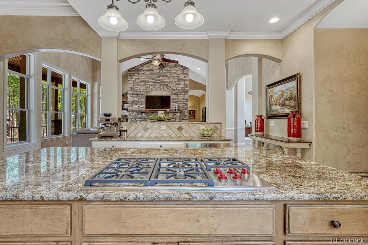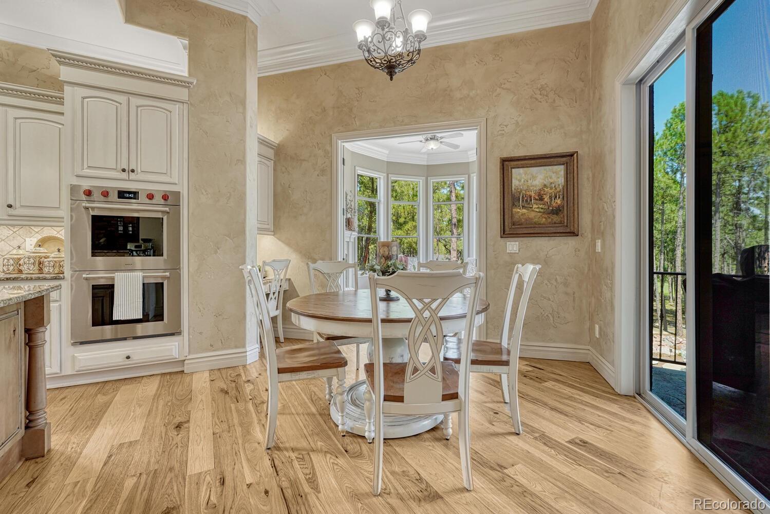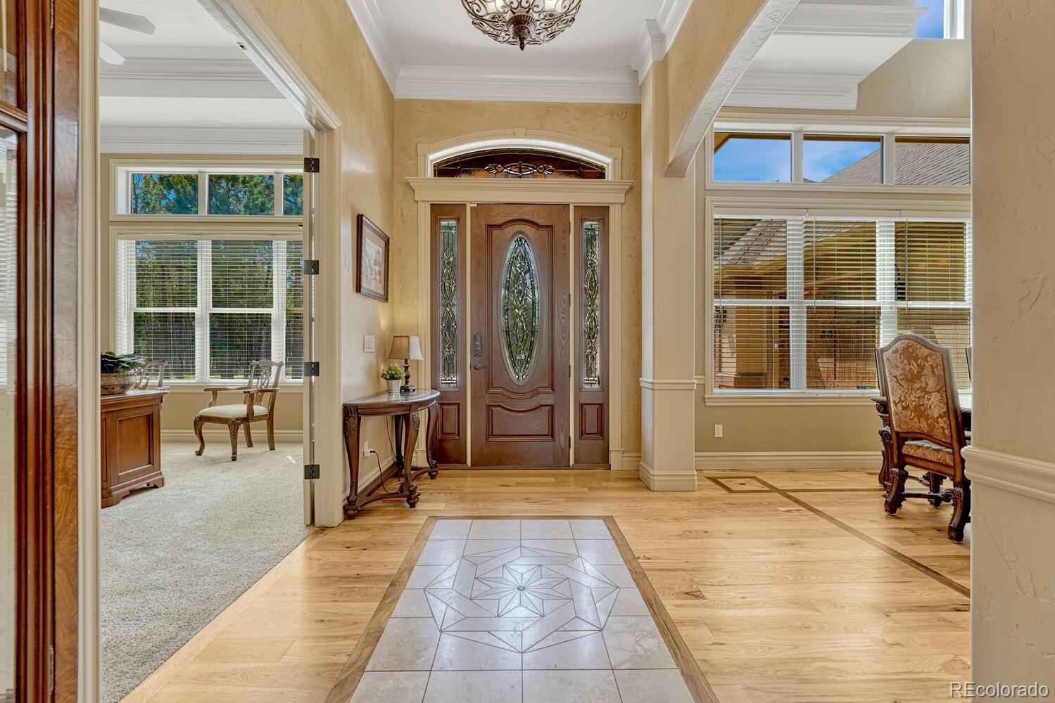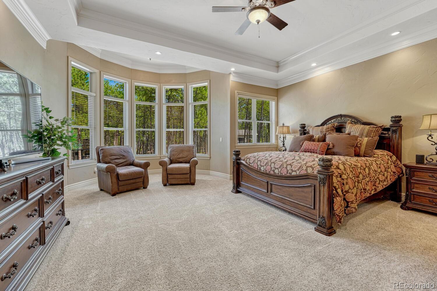 1360 Trumpeters Court offers an exceptional Colorado living experience! 5 bedrooms,6 bathrooms and 5 car garage located in the highly sought after Hilltop Pines neighborhood & Lewis Palmer School District 38! This open floor plan features a large primary suite with french doors, amazing windows, vaulted ceilings, luxurious 5-piece bathroom & soaking tub, a glass-enclosed shower and two generous walk-in closets. All 4 bedrooms feature walk-in closets and private full baths with jet tubs. The spacious dining room has cathedral ceiling and lots of sunlight. Gourmet kitchen is a chef’s dream equipped with top-of the line appliances, new Subzero refrigerator, double oven and gas cooktop, newer Wolf microwave. Granite countertops and newly refinished wood floors throughout. The sunroom is warm & cozy & provides amazing views of the beautiful backyard. Walk-in pantry, mud room w/ laundry, utility sink & storage. The living room features a beautiful stone fireplace, soaring ceilings, a wall of windows letting plenty of natural light & views of the soaring Ponderosa Pines. The walk-out lower level features a spacious family room with a floor to ceiling stone fireplace, full size wet bar & a hidden walk in safe room, media & game room! Seamless indoor/outdoor access flows to the covered patio. Situated on 2.59 acre treed lot, this home offers privacy, natural beauty & a serene environment. The outdoor living at its finest with an amazing stone fire place and a multi -level outdoor water feature like no other! Fully landscaped, large stamped cement patio & fire pit for entertaining. Extra features & upgrades: Central Vacuum System, Smart home controls throughout, new class 4 roof, new HVAC, new Wolf appliances, new water heater, whole house water filter, whole house humidifier, PetSafe wireless dog fence, exterior fully repainted, rubber floor in workout room & equipment stays! Easy access to I-25, COS & Denver. Don't miss this opportunity to own this one-of-a-kind property!