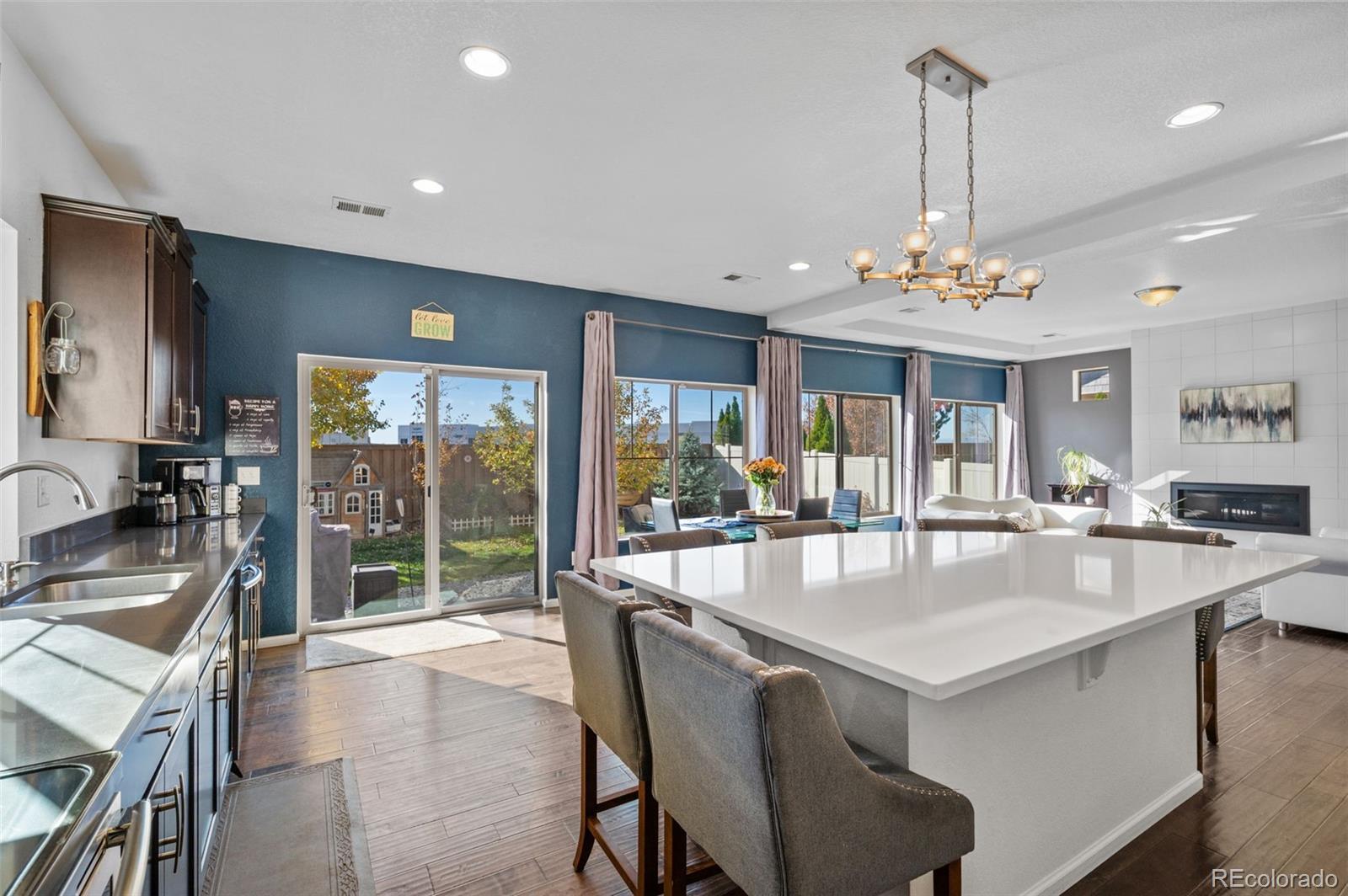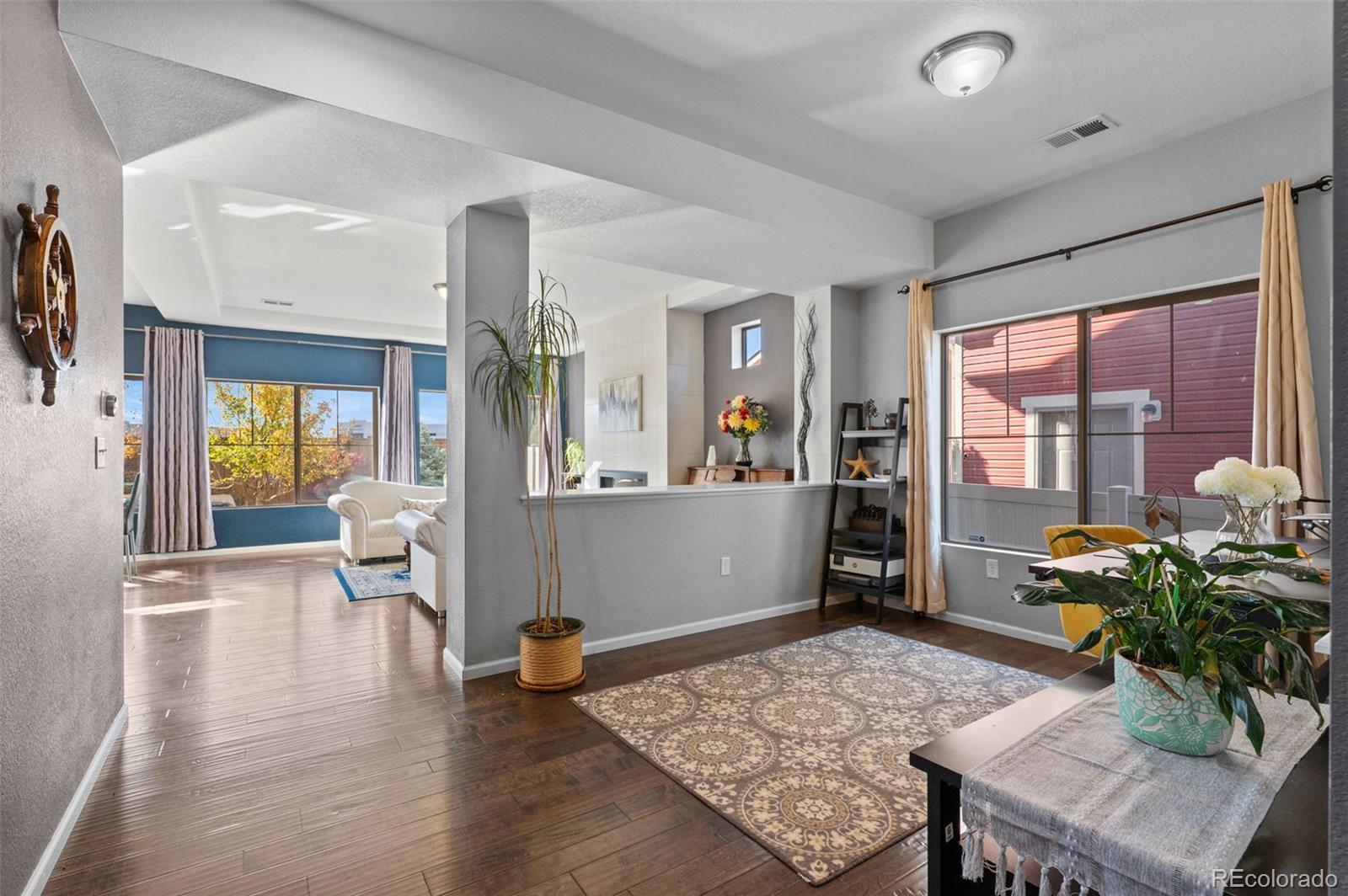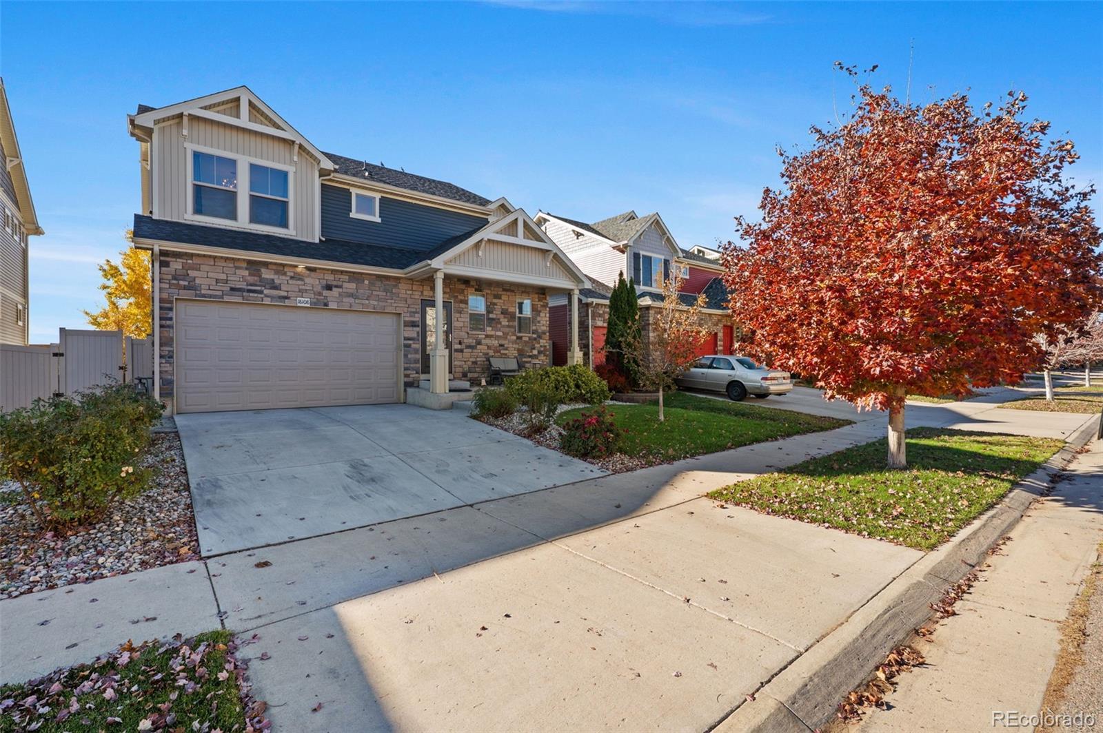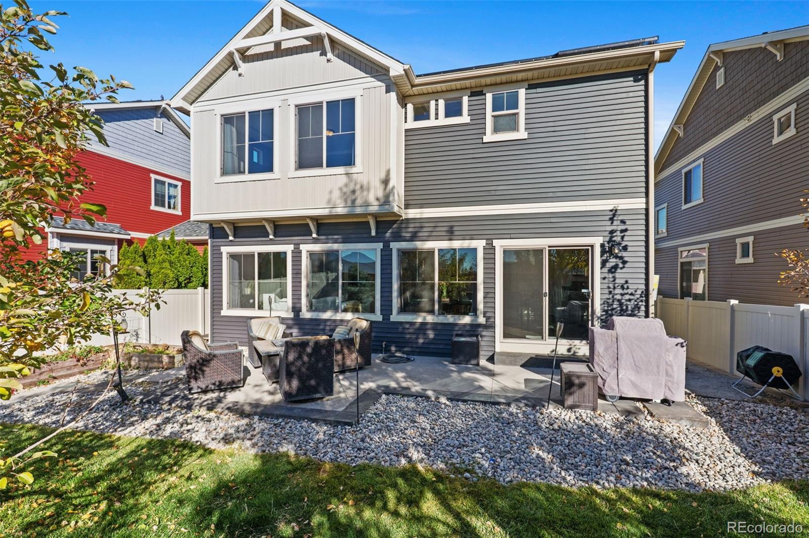 Welcome home, where style meets comfort! Natural light abounds this true, open concept floor plan with gleaming wood floors and floor-to-ceiling windows. Prepare to be wowed by the gourmet kitchen, featuring many upgrades including granite countertops, newer stainless steel appliances, and a gigantic center island that seats six—ideal for entertaining! You'll also love the oversized pantry, providing ample storage for all your culinary needs. The inviting living room, anchored by the contemporary gas fireplace, sets the perfect tone for gatherings. Step outside to the serene patio and fully fenced backyard, an entertainer's paradise! With raised planters, a lush grassy lawn, and the added bonus of *no homes directly behind you*, this outdoor space is perfect for summer barbecues and peaceful evenings. Need versatility? The formal dining or flex room can easily adapt to your hosting needs or serve as a productive home office. A convenient powder room rounds out the main level. Make your way upstairs to discover the generous ensuite primary retreat, complete with a massive walk-in closet and a spa-inspired 4-piece bath featuring a walk-in shower, double sinks, and a raised vanity. Two additional bedrooms, a full bath, and a bright loft area provide plenty of space for relaxation, creativity, or play. Plus, the upper-level laundry room with built-ins adds a dash of everyday convenience. The finished basement is a true extension of your living space, boasting a spacious rec room and plenty of storage options. Don't miss the custom stone cellar—perfect for showcasing your wine collection! Many newer systems include the roof, siding, gutters, and appliances. Located just minutes from DIA, Green Valley Ranch Golf Club, GV Recreation Center, parks, disc golf, and major highways, this home is convenient to where you want to be. Here is your opportunity to combine comfort, elegance, and functionality for the ultimate modern living experience.