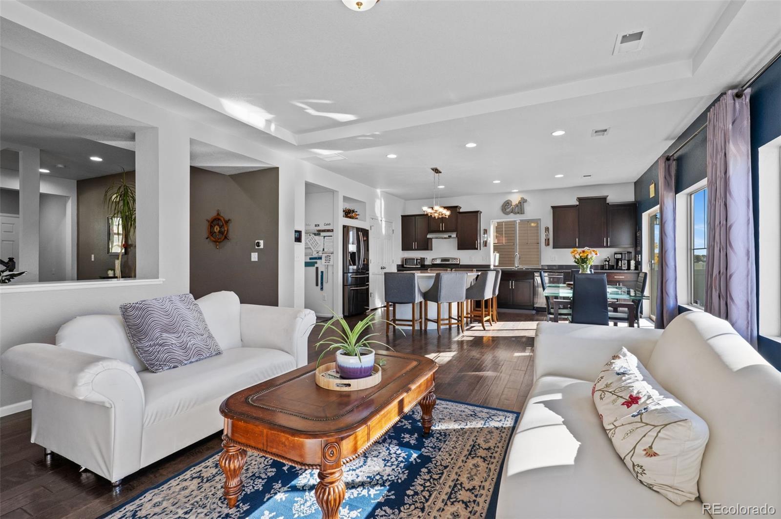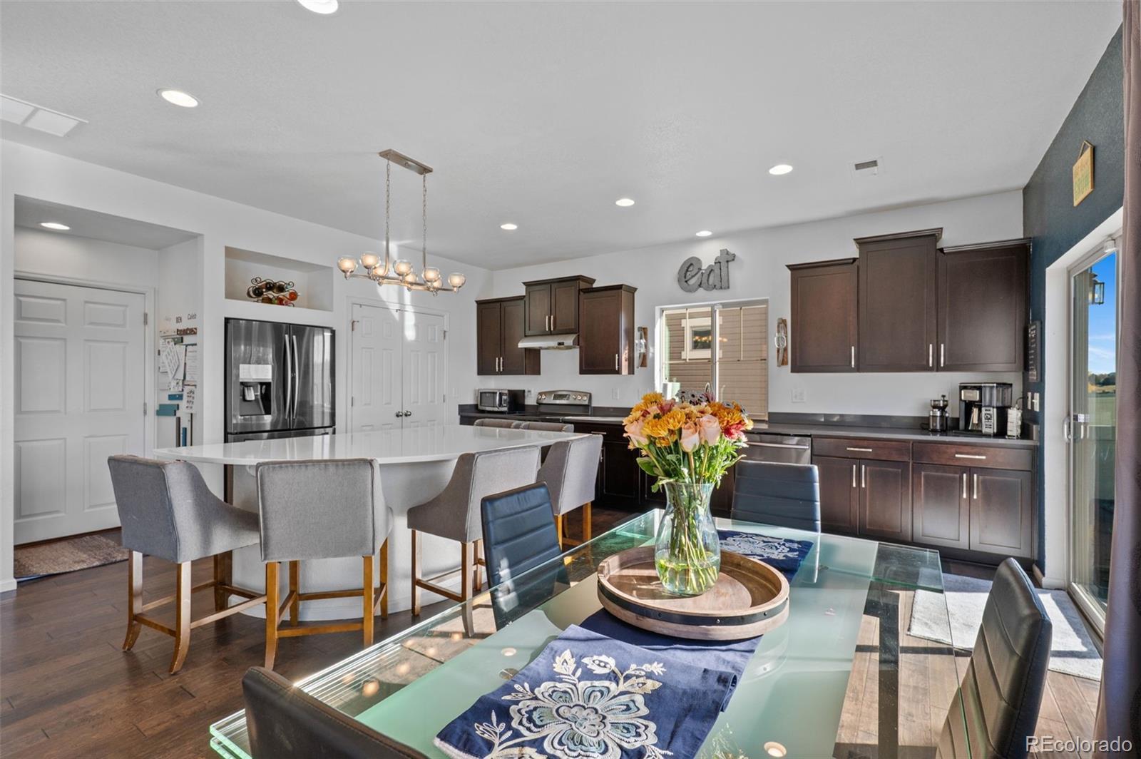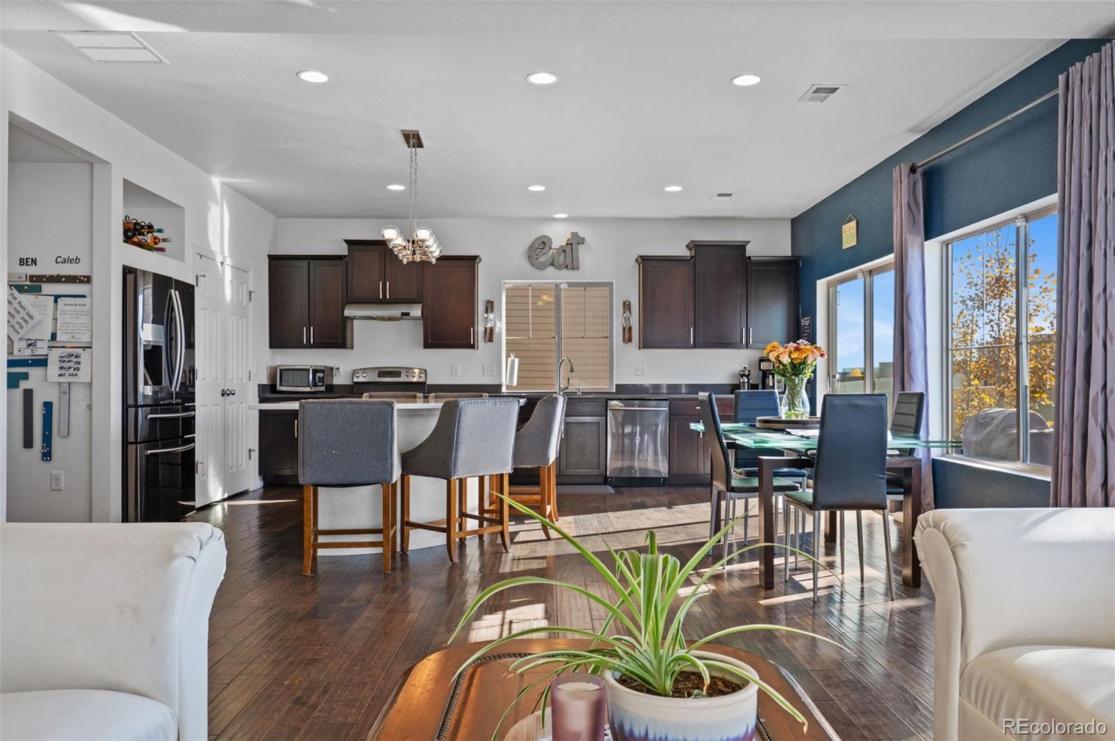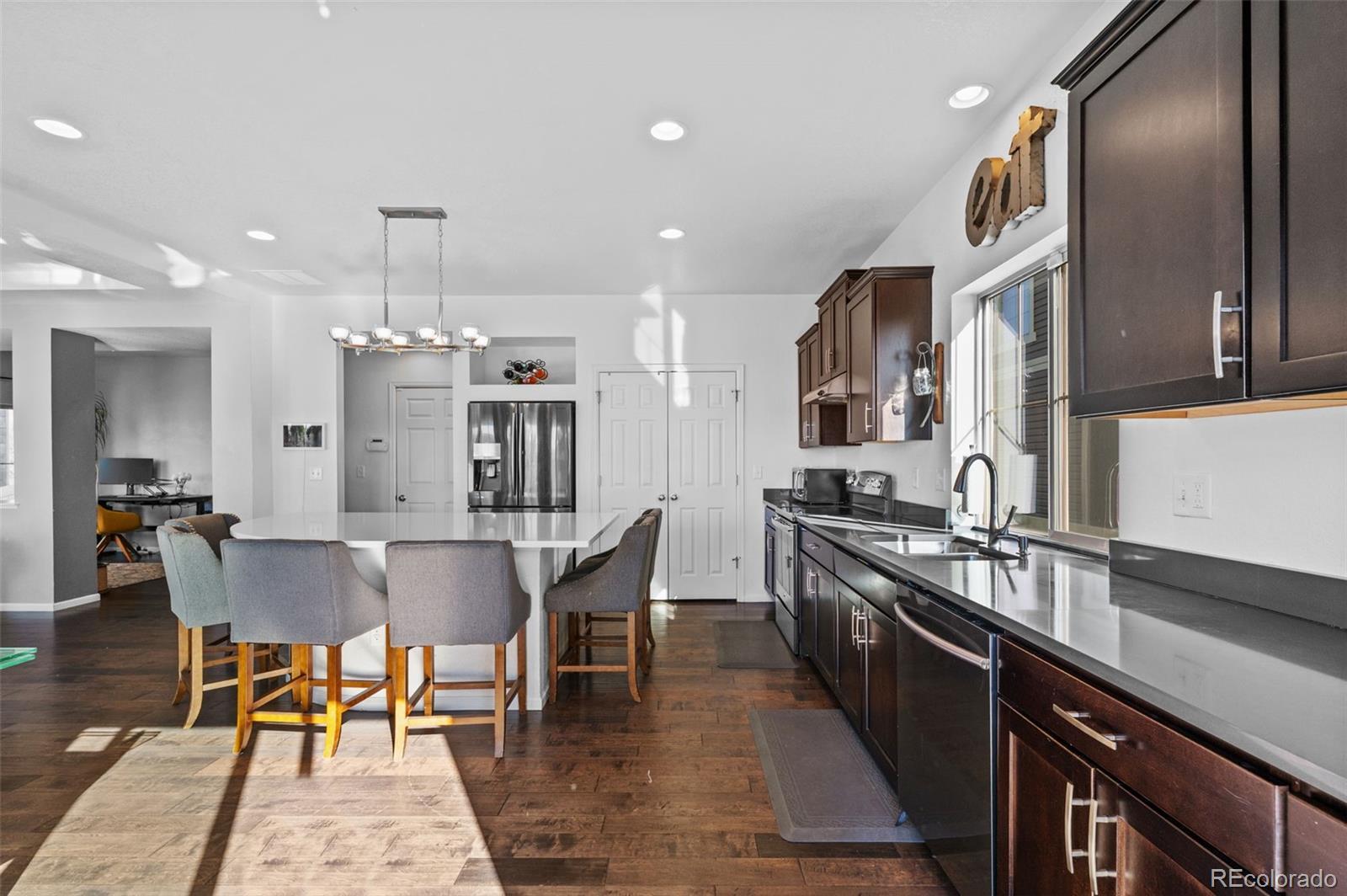 Welcome home, where style meets comfort! Natural light abounds this true, open concept floor plan with gleaming wood floors and floor-to-ceiling windows. Prepare to be wowed by the gourmet kitchen, featuring many upgrades including granite countertops, newer stainless steel appliances, and a gigantic center island that seats six—ideal for entertaining! You'll also love the oversized pantry, providing ample storage for all your culinary needs. The inviting living room, anchored by the contemporary gas fireplace, sets the perfect tone for gatherings. Step outside to the serene patio and fully fenced backyard, an entertainer's paradise! With raised planters, a lush grassy lawn, and the added bonus of *no homes directly behind you*, this outdoor space is perfect for summer barbecues and peaceful evenings. Need versatility? The formal dining or flex room can easily adapt to your hosting needs or serve as a productive home office. A convenient powder room rounds out the main level. Make your way upstairs to discover the generous ensuite primary retreat, complete with a massive walk-in closet and a spa-inspired 4-piece bath featuring a walk-in shower, double sinks, and a raised vanity. Two additional bedrooms, a full bath, and a bright loft area provide plenty of space for relaxation, creativity, or play. Plus, the upper-level laundry room with built-ins adds a dash of everyday convenience. The finished basement is a true extension of your living space, boasting a spacious rec room and plenty of storage options. Don't miss the custom stone cellar—perfect for showcasing your wine collection! Many newer systems include the roof, siding, gutters, and appliances. Located just minutes from DIA, Green Valley Ranch Golf Club, GV Recreation Center, parks, disc golf, and major highways, this home is convenient to where you want to be. Here is your opportunity to combine comfort, elegance, and functionality for the ultimate modern living experience.