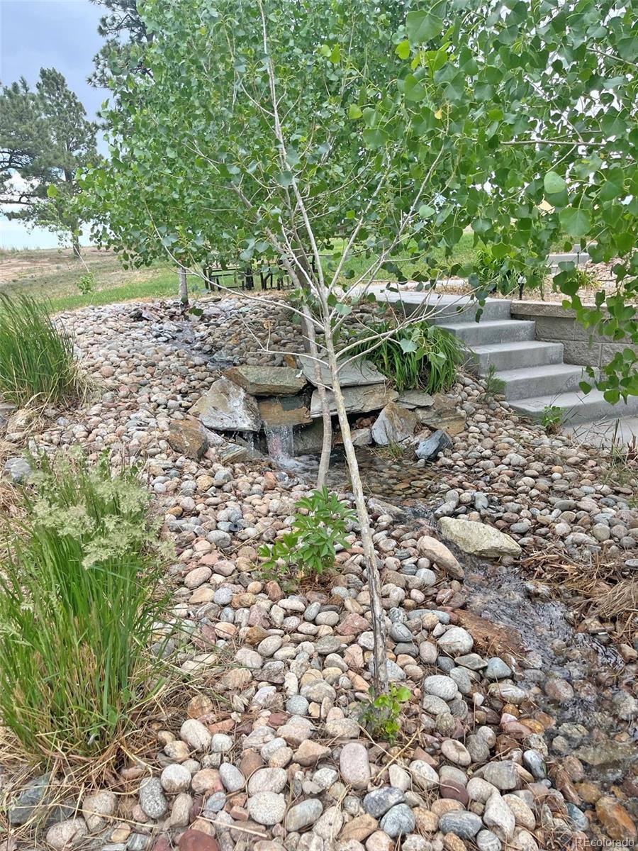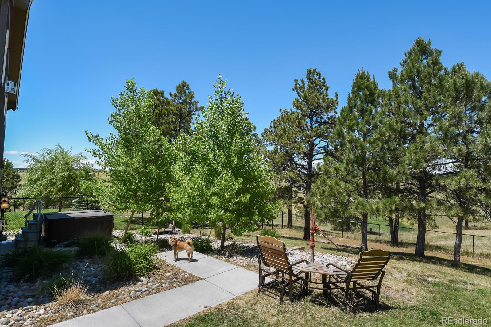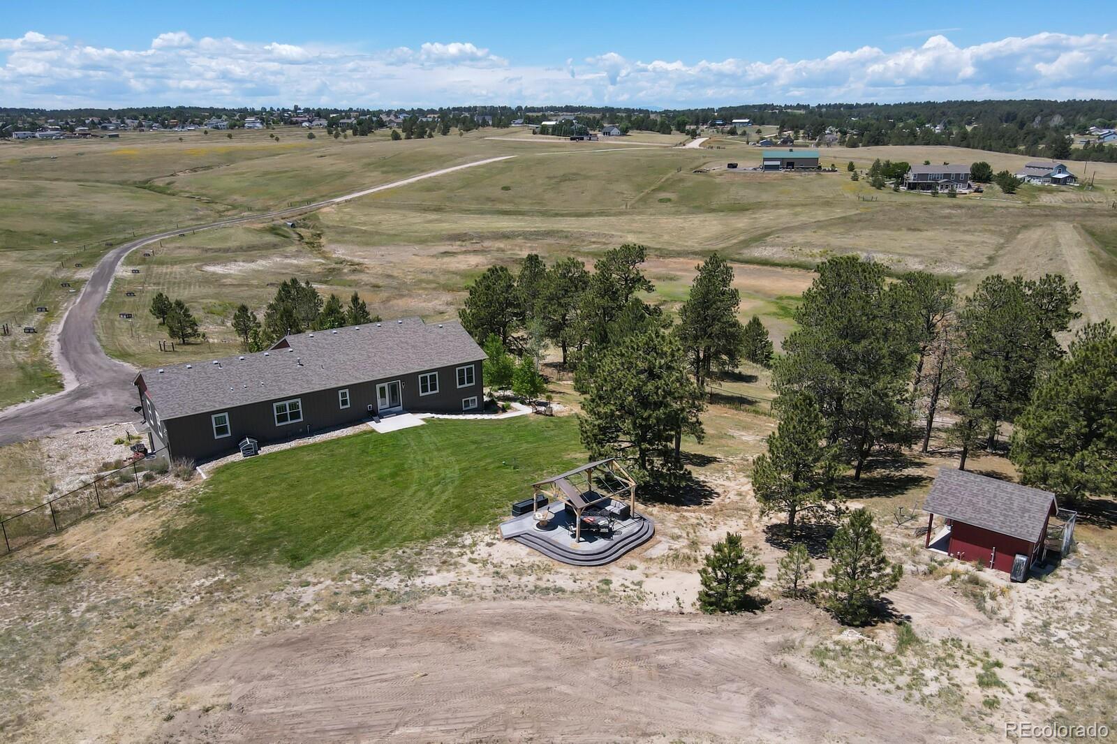 Move in ready. Close to the town of Elizabeth. Don't miss out on this amazing 43.5 acre property.With full price offer the following gently used ranch equipment is included: Kubota LA340 Tractor; Cub Cadet XT1 Enduro Series Riding Mower and Tracker OX400 Off Road Utility Vehicle. Experience country living at its best with this 5 bedroom, 4 bath, 2 story custom home, with a breathtaking view of Pikes Peak. The amazing main floor entrance is complimented by a 25 foot ceiling and flows into the large dining room that exits to the private side patio with hot tub (included) and flowing water feature. The updated eat-in kitchen will delight the chef enthusiast with granite counters, stainless steel appliances, an abundance of cabinets (all cabinets and drawers thru out house are slow close) and a walk-in pantry. The main floor primary suite features a gas fireplace (framed by stone) walk-in closet, private bath and exits to the private side patio. Stairs lead to the second floor where you are greeted by an enormous family room with an incredible gas fireplace (surrounded by stone) and a mini kitchen. There is a second master suite, 3 additional bedrooms and 2 Jack and Jill bathrooms. All bedrooms have walk-in closets. Exit the second floor into the back yard with 3 acres (fenced for private use) and a gazebo perfect for entertaining. The house also boast central air with 3 zones, new roof, all house fan, ethernet wired throughout and sprinklers in both front and back. The oversized 3 car garage is incredible with 30-amp RV hookup. Feel free to explore the property it is worth your time. Discover the seasonal pond (formally Russell Reservoir) and a hidden treed park area with solar lighting ideal for camping out. There is a 12x12 foot workshop with electric that is perfect for your crafts or special projects. Fully fenced with a loafing shed, Bring your horses, cows or llamas, no HOA’s or restrictions. 64.82 sq. ft. of adjudicated Water Rights included.