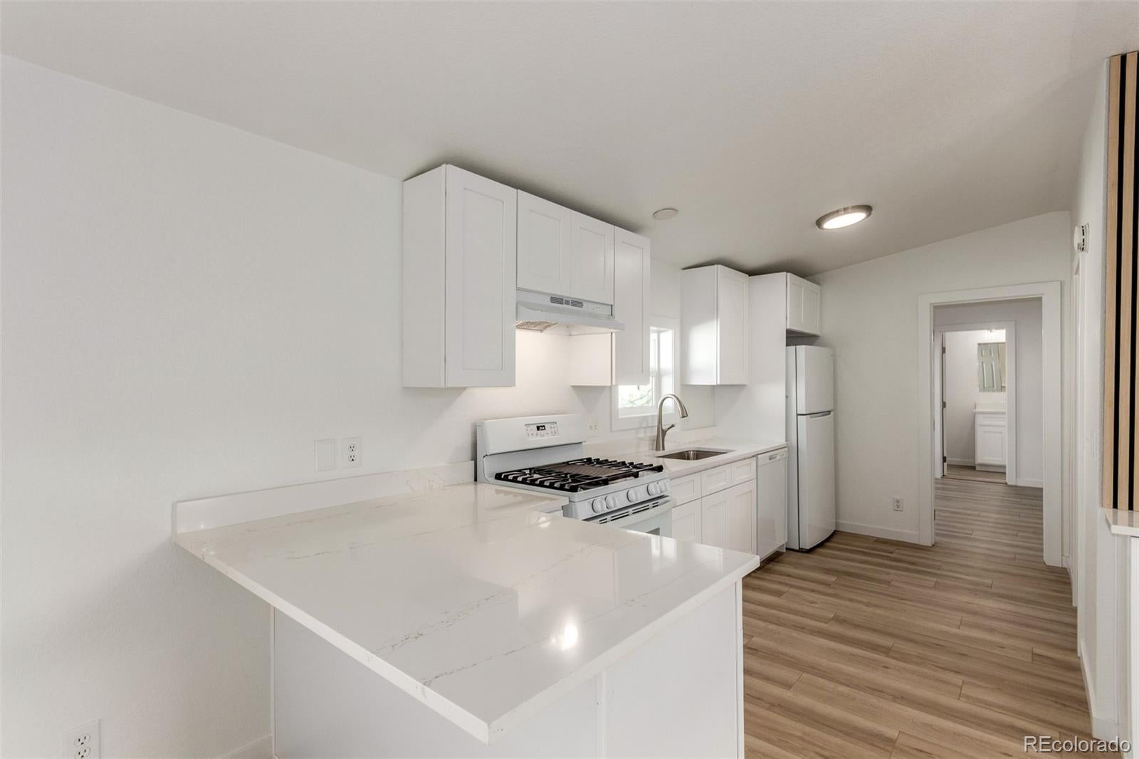 Welcome to this stunning 3-bedroom, 2-bath home, completely and beautifully remodeled from top to bottom, offering the rare opportunity to own the land your new home sits on and enjoy a truly fresh start. This property has been fully transformed with brand-new finishes throughout, including fresh interior and exterior paint and luxurious vinyl plank flooring that flows seamlessly through the entire home. Step inside to a bright and inviting atmosphere featuring a modern neutral color palette, abundant natural light, and soaring vaulted ceilings. The open-concept layout creates effortless flow between living spaces, delivering both functionality and an airy, welcoming feel. The dining area is accented by a stylish chandelier and a built-in buffet cabinet, adding charm and character. The brand-new kitchen is a showstopper, showcasing quartz countertops, crisp white shaker cabinetry, all-new appliances, and a peninsula breakfast bar ideal for casual dining and entertaining. Each bedroom is generously sized to provide comfortable retreats, while both bathrooms have been thoughtfully updated with modern fixtures. A dedicated laundry room with built-in racks adds everyday convenience. Outside, enjoy an extra-long side driveway with room for multiple vehicles, plus a convenient storage shed. Ideally located just minutes from shopping, dining, parks, and major highways, this fully remodeled, move-in-ready home offers true land ownership without sacrificing style or comfort. Don’t miss this incredible opportunity!