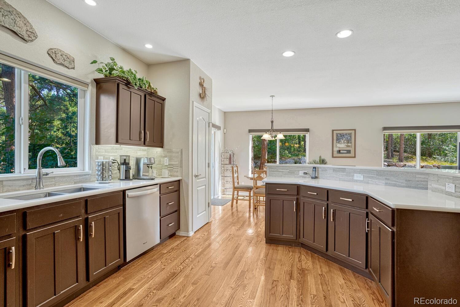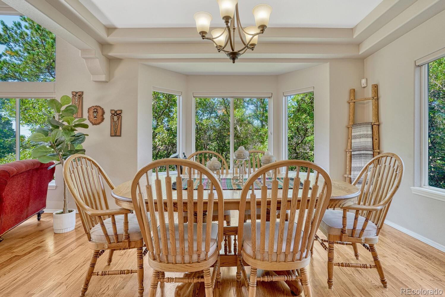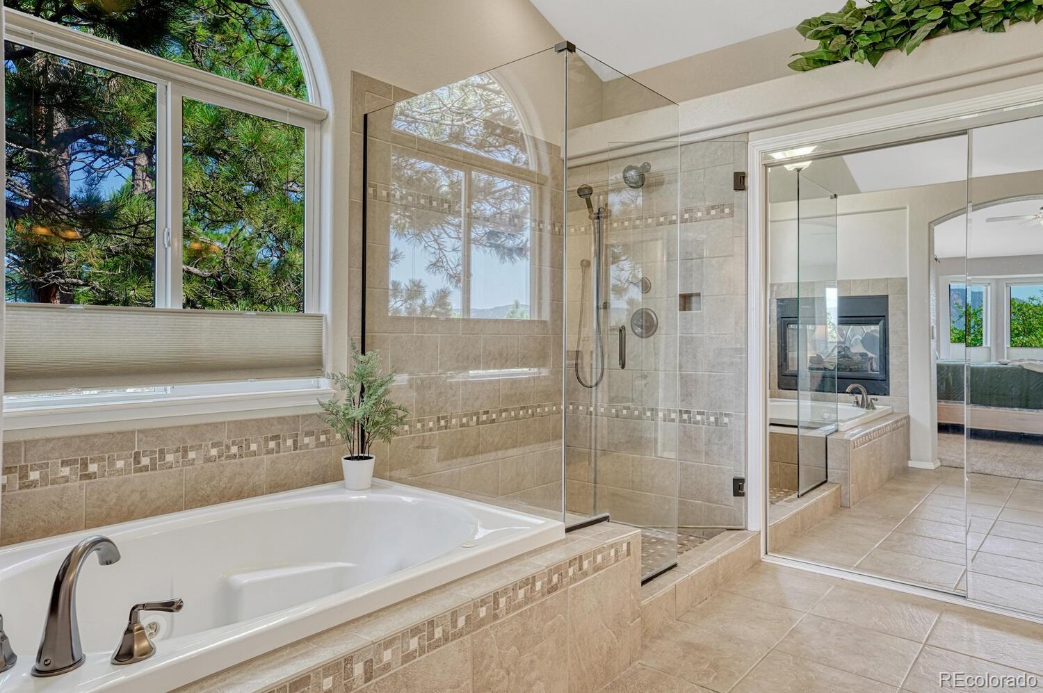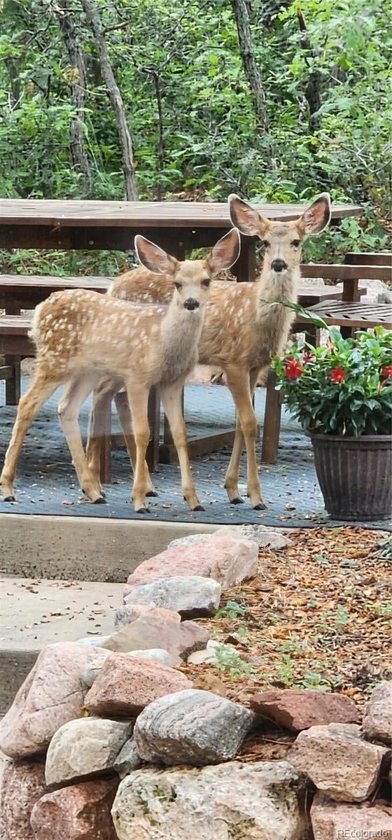Warm and Welcoming Home with Serene Setting and Mountain Views. Tucked away in a quiet cul-de-sac, this beautiful home offers breathtaking, unobstructed views of Pikes Peak and a rare sense of peace and privacy. Surrounded by mature trees and frequent wildlife sightings, the unique lot provides a perfect balance of shade and natural light throughout the home. Enjoy a professionally landscaped yard featuring a tranquil rock stream and pond—ideal for relaxing or entertaining. Located just outside of Woodmoor with no HOA, the property offers flexibility in a peaceful setting while still being just minutes away from town conveniences. Inside, the oversized primary suite is a true retreat with vaulted ceilings, plant shelves, a cozy gas fireplace, and stunning mountain views. The remodeled ensuite bath boasts heated tile floors, a jetted soaking tub, custom frameless shower, and granite countertops. Upstairs, two additional bedrooms also feature vaulted ceilings and charming plant shelves, while a versatile loft space offers flexibility for a home gym, office, or playroom. The main level welcomes you with beautiful wood floors, a remodeled powder room, and a stunning kitchen designed for both beauty and function. The formal dining room with elegant trayed ceilings is perfect for intimate dinners or entertaining guests. Additional highlights include: *Built-in bookshelves in the home office *South-facing driveway for quick snow melt *New roof and gutters (2024) *Newer furnace and AC *HOT TUB-ready cement pad with electrical already in place With tall ceilings throughout, thoughtful upgrades, and postcard views in nearly every direction, this home is a rare find. Whether you're sipping morning coffee while watching deer wander through the trees, or soaking in mountain views at sunset, this property is more than a home—it’s a sanctuary. Don’t miss the rare opportunity to own a slice of Colorado paradise!