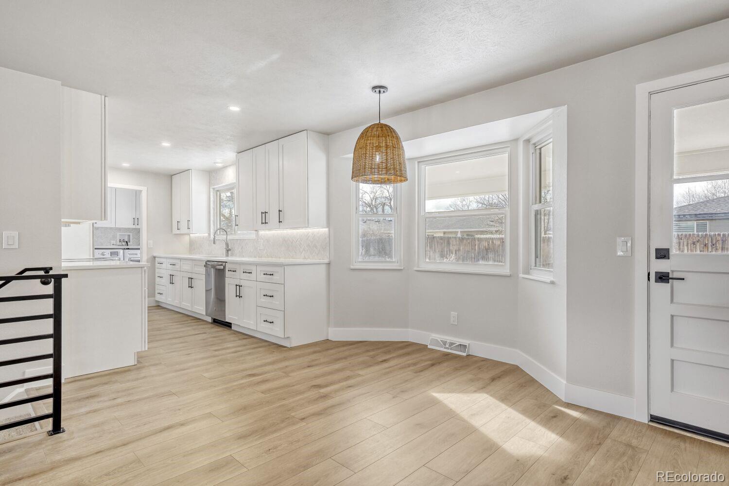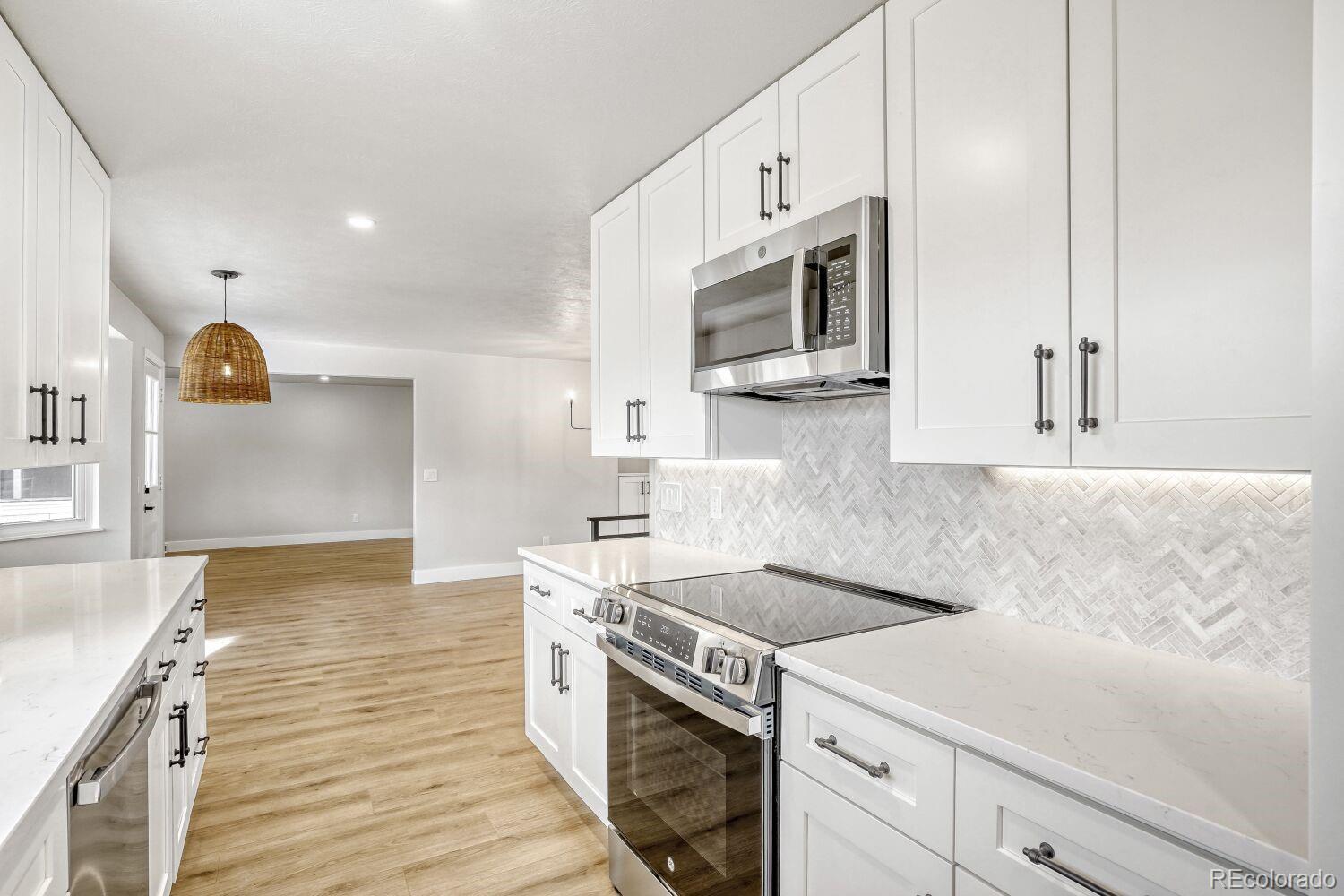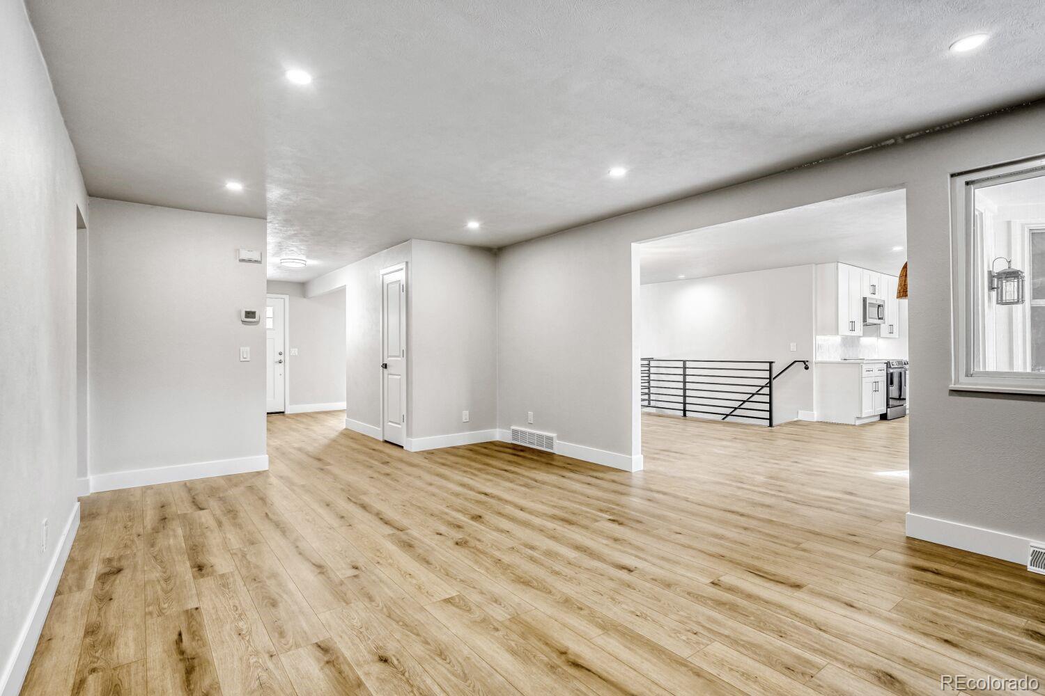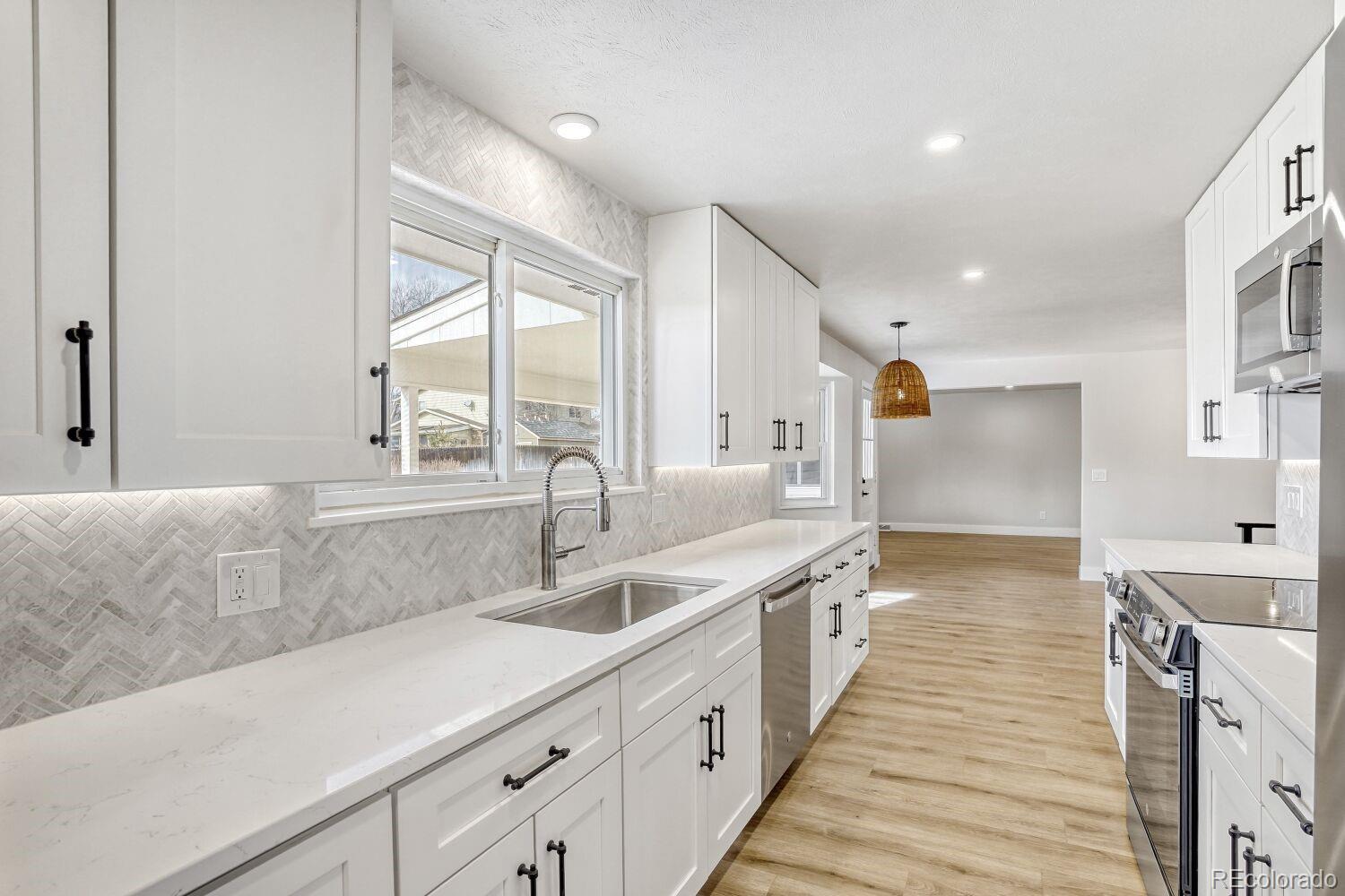 Beautiful ranch-style residence in the highly sought-after Columbine Knolls neighborhood! This 4-bedroom, 3-bathroom home has been fully renovated and provides the best of everyday living and classic charm. The interior showcases an open-concept design with an abundance of natural light filling this home at every corner. The kitchen has been updated with beautiful quartz countertops, new soft-close cabinets and all new stainless steel appliances. Extending off of the kitchen is a lovely family room with a cozy gas fireplace and brick surround, as well as a breakfast nook. The dining area and living room sit towards the front of the home and provide the perfect space for entertaining a crowd. The primary suite offers a new spa-like bath with custom glass shower and a sizable walk-in closet. Three additional bedrooms as well as a full bath and laundry/mudroom complete this level of the home. In the basement you will find a large, open recreation room ideal for a home office, workout area or playroom. Step outside and enjoy the beautiful backyard boasting a stamped concrete patio and a sizable yard perfect for gardeners of every level. All just steps away from Marker Park with close proximity to trails, shopping, dining and more. You do not want to miss this property. Welcome home!