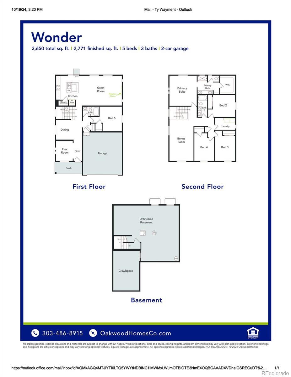 Experience the Wonder! The Wonder floorplan blends modern design with artisanal touches in a home built for flexibility, affordability, and efficiency. This single-family, 2-story layout spans 3,650 sq. ft. in total and offers 5 beds, 3 baths, an unfinished basement, and an oversized 2-car garage. Energy efficiency is at the forefront with 2x6 walls and low-E double pane glass for superior insulation, a Rheia HVAC, a 96% high-efficiency furnace, plus electric vehicle and solar ready. All adding up to lower utility bills, backed by our Energy Smart Guarantee and certified as EPA Indoor AirPlus®. This home has plenty of curb appeal featuring a multi-textural exterior, front porch, and 5’ privacy fencing. The main level is bright with oversized windows, 9’ ceilings, home-office flex room, dining area, and an expansive great room. Enjoy designer LVP flooring, Shaw carpeting, and Sherwin-Williams paint throughout. The kitchen is complete with a large dining island, stainless-steel sink, and large pantry. The upstairs primary suite offers a large walk-in closet, double vanity sink, and a tiled spa shower. The 2nd floorT Buy new from a trusted builder and take advantage of Oakwood Homes’ advanced building practices that lower your mainten also features a laundry room and spacious bonus room for family entertainment. Come see our state-of-the-art sales center equipped with VR and experience our seamless homebuying process that earns us industry-leading customer satisfaction. THIS REPRESENTATIVE OF WHAT CAN BE BUILT