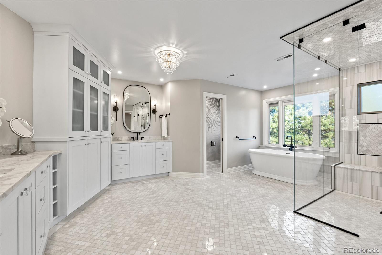 Tucked into mature trees, this brick estate pairs stately architecture with inviting warmth. Sunlight moves across grand, well-proportioned interiors finished with designer lighting, wrought iron railing, and finely crafted built-ins. The foyer makes a statement with a sweeping curved staircase. In the family room, coffered ceilings and a marble fireplace anchor everyday living. French doors open to a refined office. The formal dining room, framed by a tray ceiling, sets the scene for holidays. A butler’s pantry connects to an expansive kitchen with a cook’s island, casual dining, built-in desk, and top-of-the-line appliances. The kitchen opens to a full-length deck for relaxed meals and weekend entertaining. Practical spaces include a mudroom and a main-floor gym lined with windows. Upstairs, the serene primary suite is a true retreat with a fireplace, spa-like bath with freestanding tub and dual vanities, and a boutique-style walk-in closet. An additional ensuite bedroom and secondary bedrooms with walk-in closets complete the level. The lower level invites fun with an open recreation area, a cozy zone for movie nights, a convenient kitchenette, and a private guest suite. Walk out to the backyard where the setting lives like a resort, featuring a sparkling pool with waterfall features, broad patios for al fresco dining, and a level lawn for play. A three-car garage and easy guest parking complete the picture. Steps from the High Line Canal Trail and minutes from Cherry Creek and DTC, this exceptional home offers privacy, convenience, and resort style amenities in one of Greenwood Village’s most desirable neighborhoods.