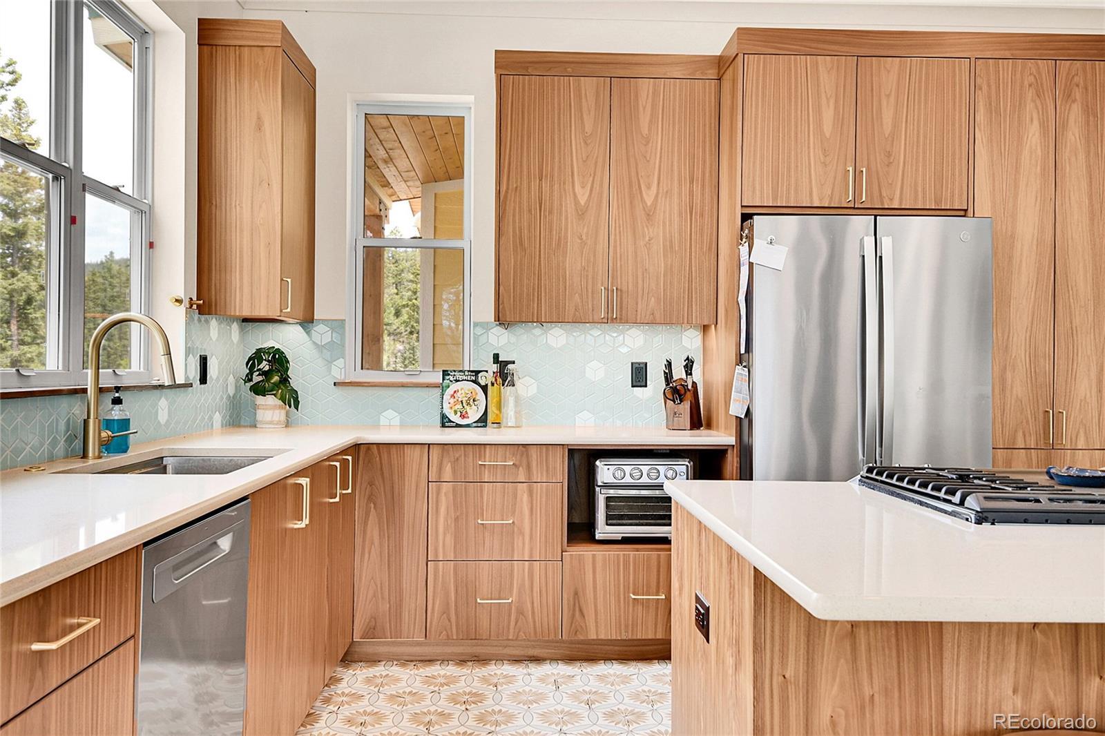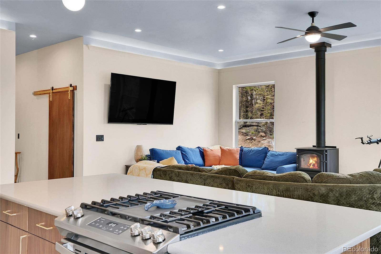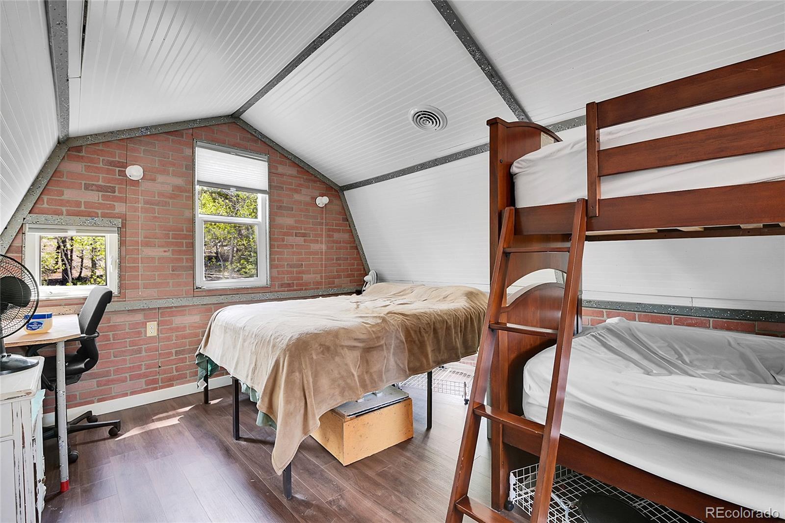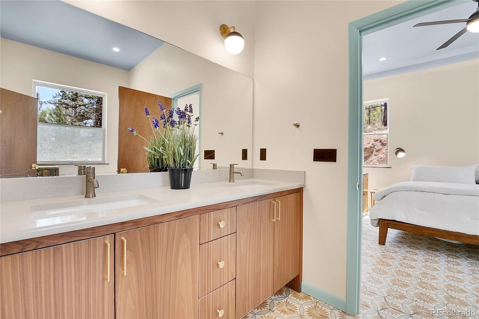 Welcome to a custom mid-century modern ranch, completed in 2023, on over two private acres in Indian Mountain (Como/Jefferson). Designed for connection and long-term value, this home dissolves the boundary between indoors and out. The home features soaring 10-foot ceilings and expansive windows. Seven exterior doors provide each of the three bedrooms, plus a dedicated office, with its own private entry and patio—ensuring both natural flow and personal retreat. Warmth radiates from in-floor heating throughout, including the garage, while a wood-burning stove adds comfort. Thoughtful details elevate the space: custom walnut cabinetry, brass fixtures, designer porcelain tile, and indirect cove lighting. A 50-year standing seam roof with tongue-and-groove soffits ensures enduring quality. The primary suite boasts a spa-inspired bath with a soaking tub, separate shower, private toilet closet, and a generous walk-in closet. Two additional bedrooms (each with queen beds) offer flexible space. The septic system is designed for longevity. Outdoor living is seamless with a secluded fire pit. The property includes a furnished 192 sq. ft. bunkhouse for guests. An oversized finished garage includes a full bath, and a shed provides ample storage for mountain gear. With reliable satellite internet and two private offices, remote work blends with mountain life. You are minutes from the Indian Mountain Recreation Area, Pike National Forest, trails, and the community center. Highway 285 offers easy access to Fairplay, Breckenridge, Denver, and Colorado Springs. Offered in turn-key, move-in ready condition, the home allows you to settle in with ease. Furnishings are available for purchase separately but are not included in the sale price. Buyers will need to apply for a short-term rental license, and the sellers are happy to assist. This is more than a property; it is a sanctuary tucked into nature, inviting you to live a grounded and connected life.