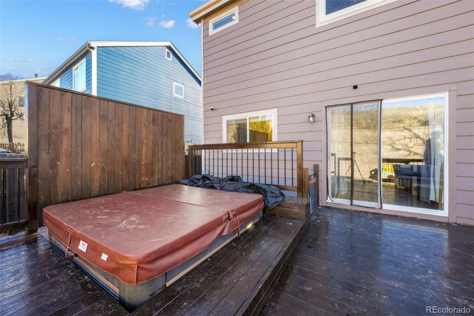 Welcome to this well-maintained two-story home offering just over 2,100 square feet of thoughtfully designed living space, plus a partially finished basement. Ideally located within walking distance of Fountain Mesa Elementary School, this home blends comfort, functionality, and convenience. Upon arrival, you’ll be greeted by a beautifully xeriscaped front yard and a welcoming covered front porch. Step inside to real wood flooring throughout the main level and a bright, open layout. The kitchen features granite countertops, stainless steel appliances, a full-size pantry, and a window-side sink that overlooks the backyard. A tile-surround fireplace creates a warm separation between the living and dining areas, with the dining space offering direct access to the backyard. The main level is complete with a convenient mudroom/laundry area and a half bath. Upstairs, a built-in desk area at the top of the landing provides the perfect work-from-home or study nook. The spacious primary suite includes an attached bath with dual vanity, soaking tub, separate shower, barn door entry, and a walk-in closet. Two additional bedrooms and a full bathroom complete the upper level. The partially finished basement offers a versatile recreation room ideal for a workout space, media room, or potential additional bedroom. A half bath is already in place and could be converted to a three-quarter bath with the addition of a shower, along with abundant storage space. The backyard is a true highlight, featuring a beautiful wood deck with a privacy wall, included hot tub, built-in fire pit area, and full fencing—perfect for relaxing or entertaining. Additional features include air conditioning and a location near Fort Carson with easy access to Peterson Air Force Base. This home offers privacy while remaining close to everyday conveniences.