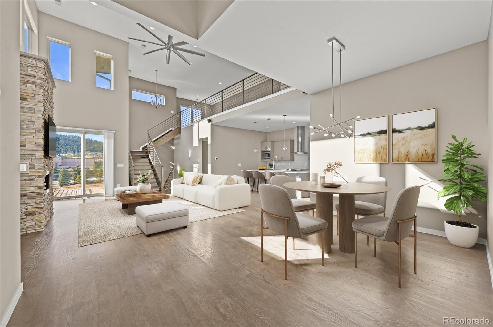 Modern mountain living—without the usual Evergreen compromises. Just minutes from I-70, this thoughtfully designed mountain contemporary paired home offers a rare combination of privacy, connectivity, and low-maintenance living at this price point. The home lives like a single-family residence, featuring a main-level primary suite, three distinct living areas across three levels, and a true walk-out basement—an ideal layout for work-from-home professionals, Denver or Boulder commuters, or buyers seeking flexible space without sacrificing comfort or privacy. The light-filled main level is anchored by a soaring two-story great room with fireplace and direct access to a main-level deck with gas hookup. The chef’s kitchen provides generous workspace, center island, and oversized walk-in pantry, flowing seamlessly into the dining and living areas. The main-level primary suite includes a five-piece en suite bath with soaking tub, walk-in shower, and laundry hookups in the walk-in closet—perfect for single-level living. Upstairs, an expansive loft with wet bar opens to a large upper deck with panoramic mountain views. Two additional bedrooms also access the shared deck, offering excellent options for guests or home office use. The finished walk-out basement adds a third living area with family room, fireplace, wet bar, bedroom, three-quarter bath, and flexible bonus space, with direct access to the patio and private fenced yard. Multiple decks on different levels, gas hookups, hot tub, private yard space, oversized garage with epoxy flooring and hot/cold water, and ample guest parking enhance everyday livability. Unlike many mountain properties, this home offers city water and sewer, high-speed internet, excellent cell service, and quick access to Evergreen Parkway and Denver—making it truly move-in ready and commuter-friendly.