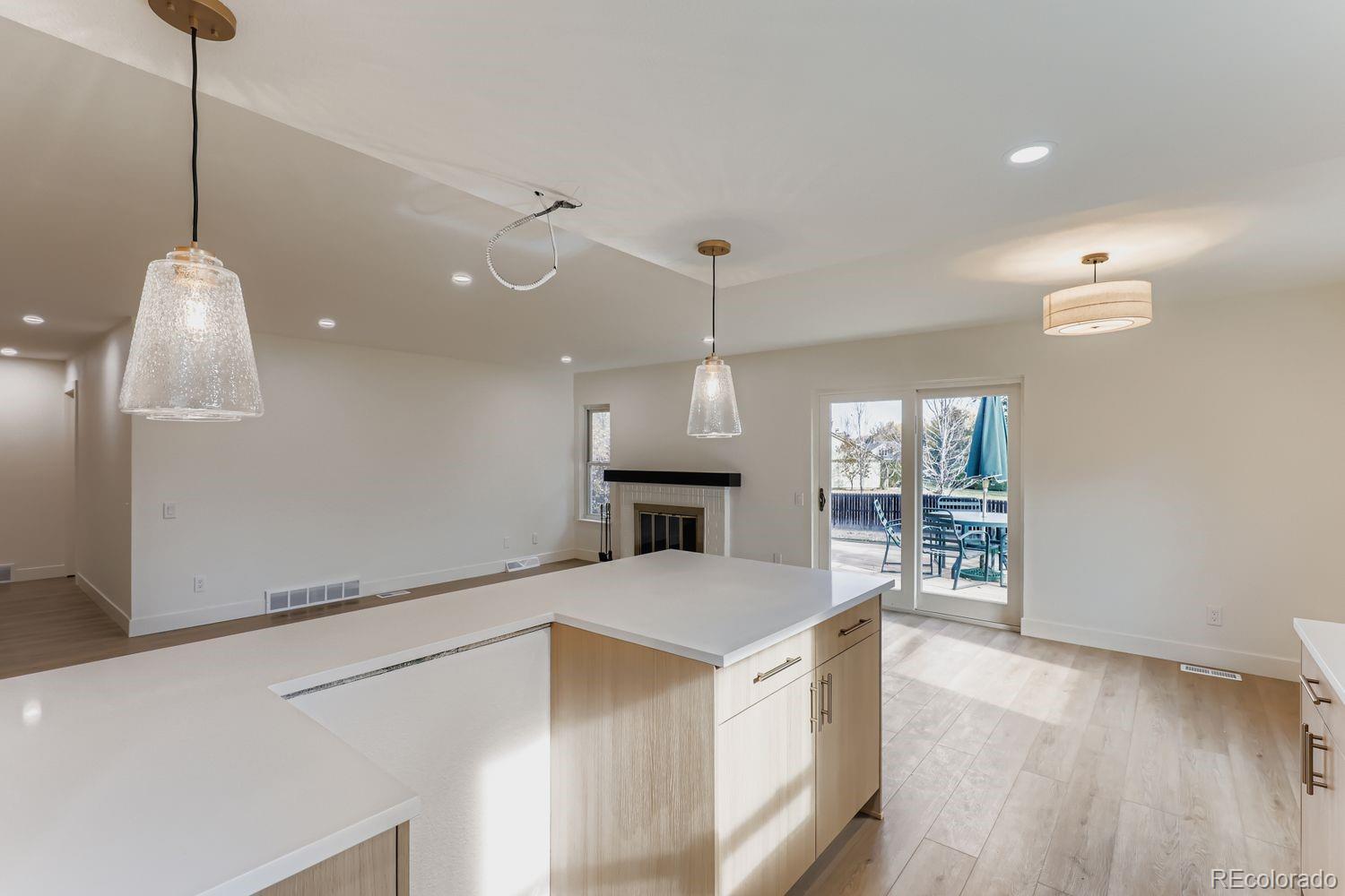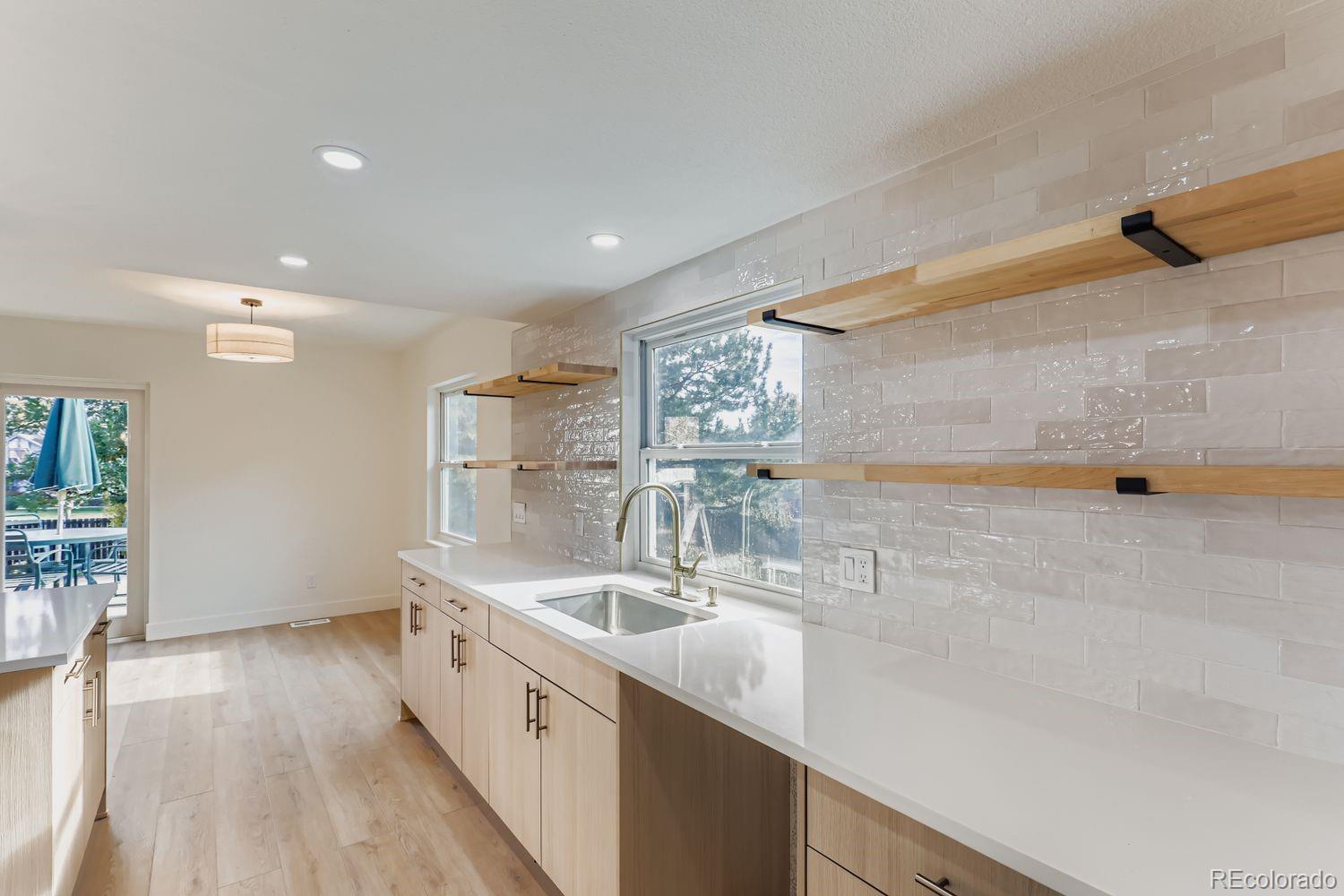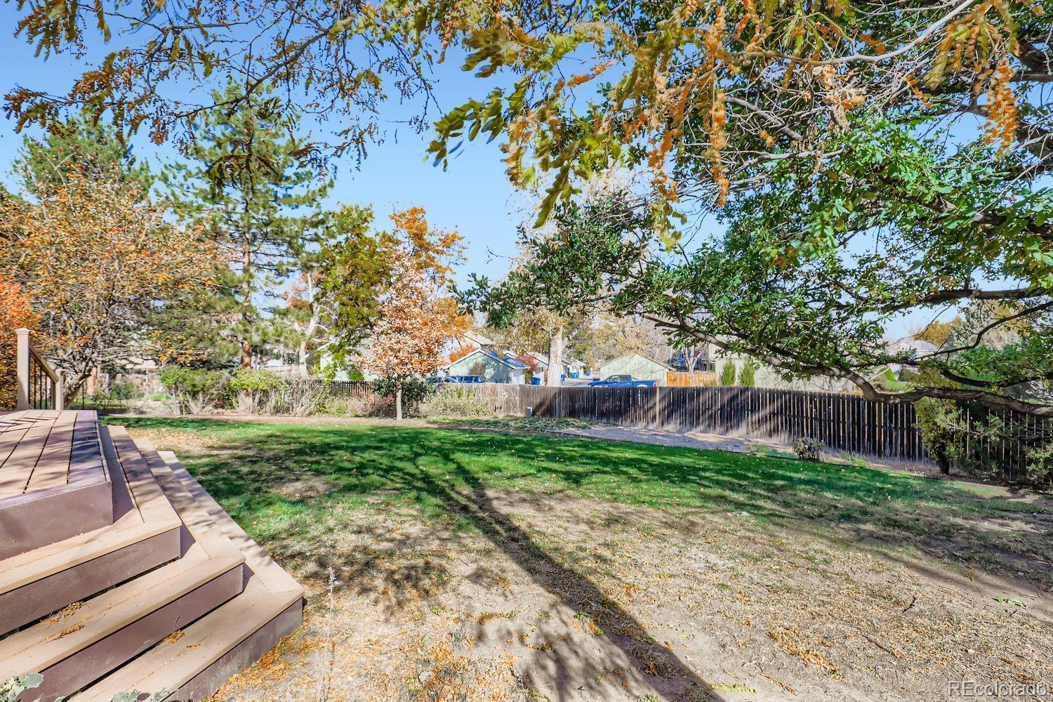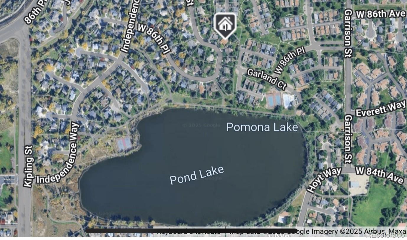Beautiful remodel in The Pond neighborhood and ideally located on one of the largest and nicest lots in the area. Fantastic open floor plan with four bedrooms and two bathrooms all on one level. The kitchen and family room adjoin with access to a raised deck and spacious back yard which backs to HOA owned green space. Perfect for entertaining or relaxing. The primary suite was reconfigured to include his and hers closets and a 3/4 bath with double sinks. Plenty of space for all and room to expand in the 1008 square foot unfinished basement. Oversized two car garage for toys and storage. New flooring throughout, interior/exterior paint, furnace is approximately 7 years old, A/C is approximately 4 years old, windows 15 years old, electrical panel 5 years old, roof recently inspected and minor repairs made. The Pond is a sought after community with a pool, tennis, pickleball, open space, tree lined paths and the home is only a block from a private 35 acre lake for recreation like paddle boarding, kayaking and fishing. Lots of surrounding wildlife and a huge local owl occasionally perches in the tree in the back yard. Convenient to shopping, dining, recreation and a short walk or bike ride to Standley Lake.