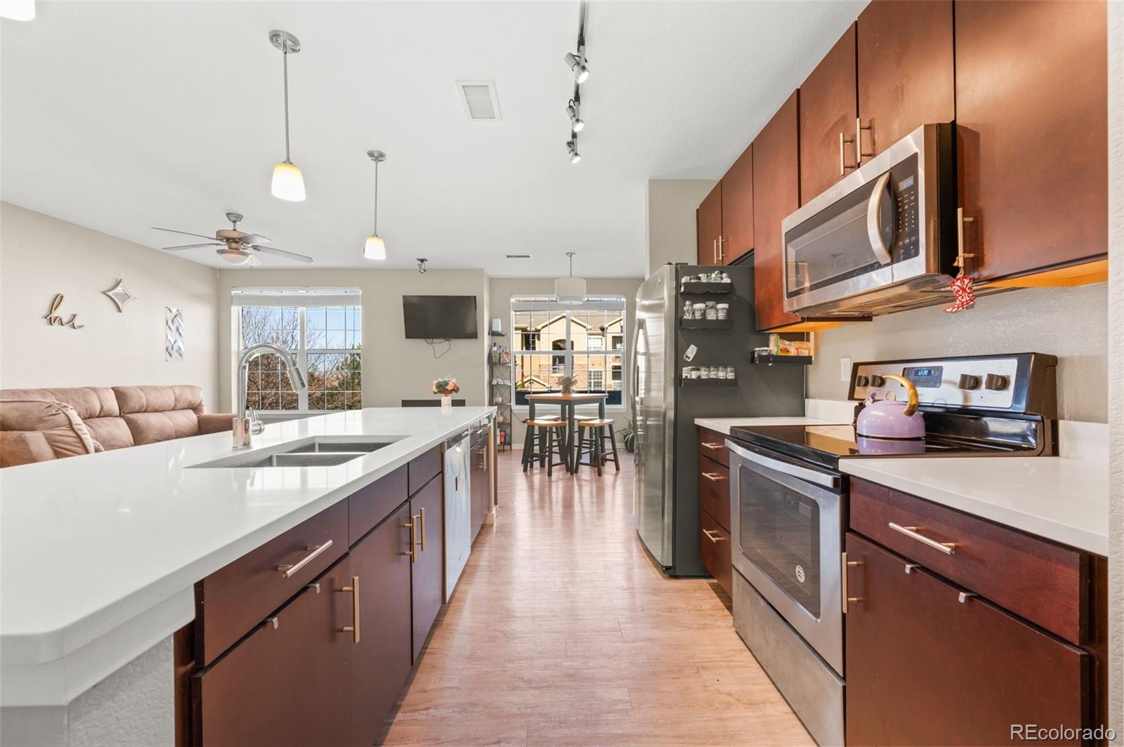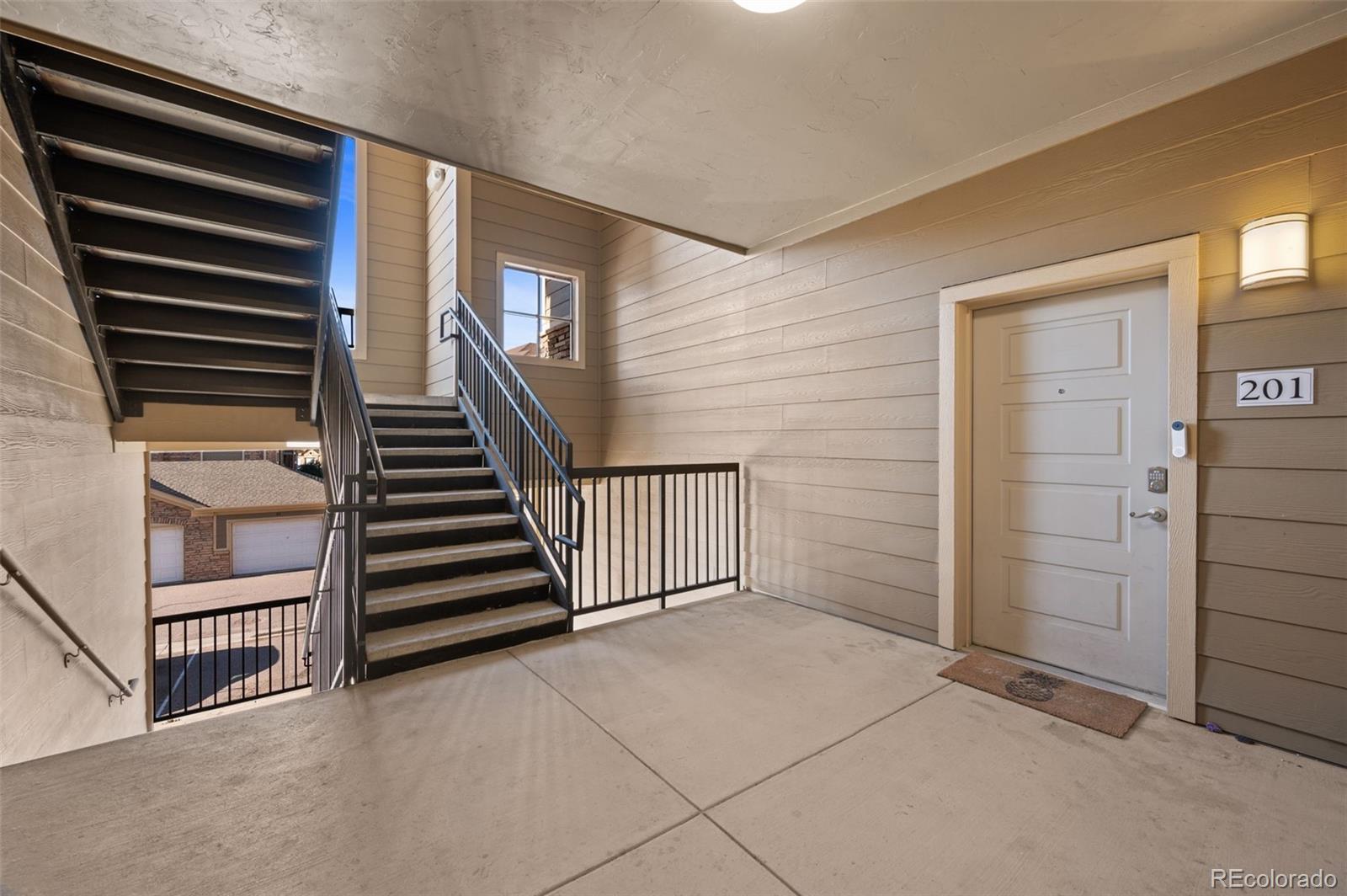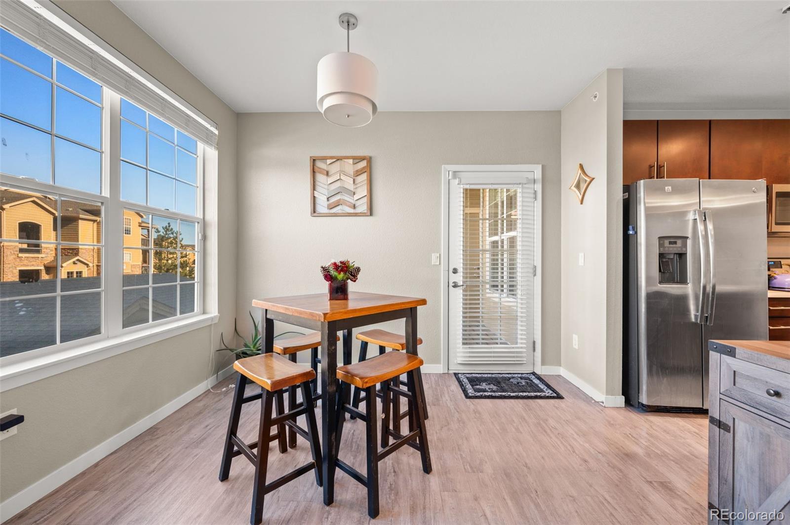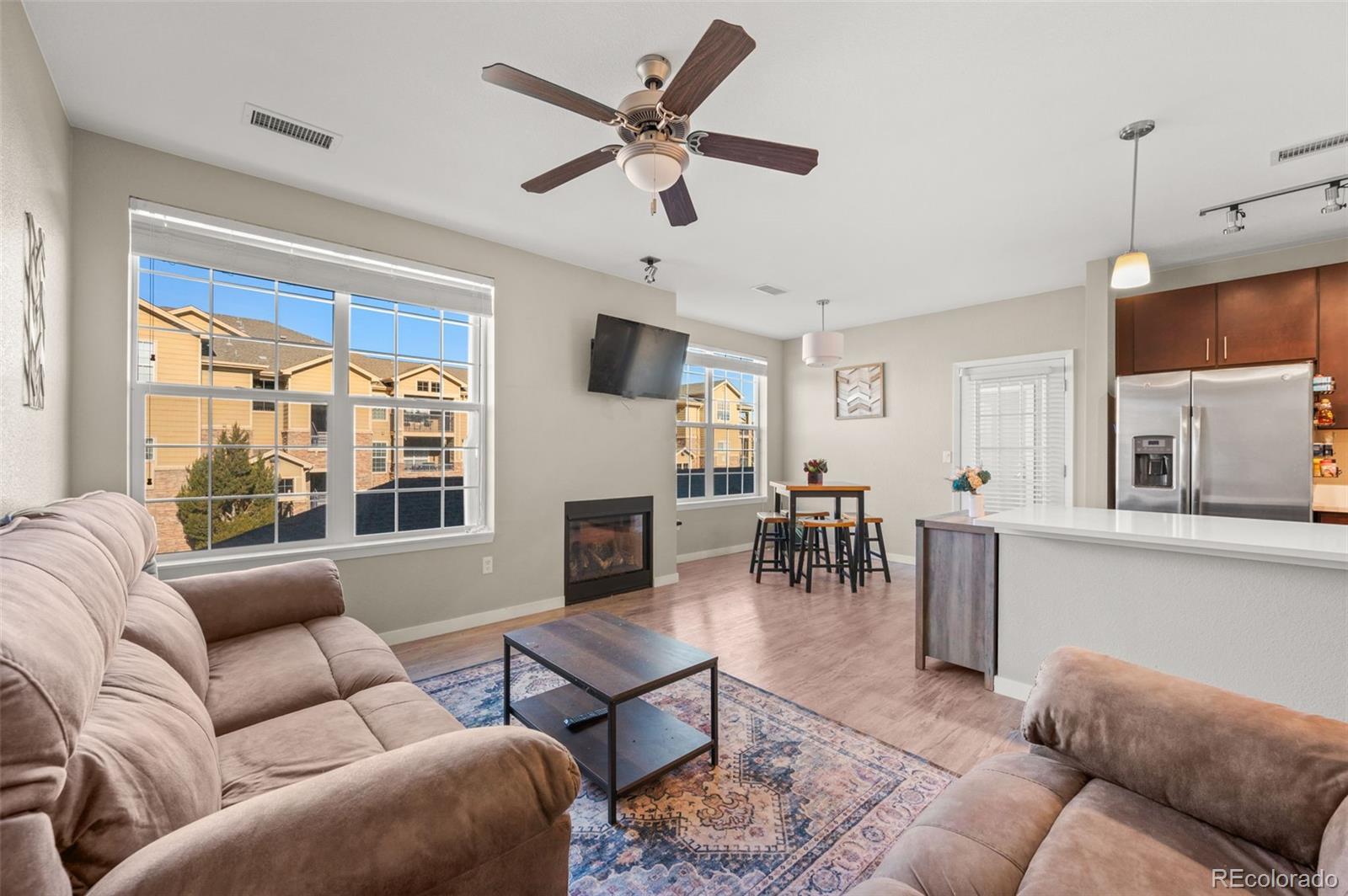 Built in 2018, this light filled condo offers modern design with everyday comfort across 1,254 thoughtfully planned square feet. The open concept layout creates an easy flow between the kitchen, dining, and living spaces which is perfect for both entertaining and quiet nights at home. The kitchen stands out with quartz countertops, a generous center island, and sleek, contemporary appliances, while the living area is anchored by a cozy fireplace that adds warmth and character. Step out onto your covered balcony where you can enjoy the peaceful neighborhood views and a moment of fresh air. The primary suite offers a private retreat with a spacious walk-in closet and a well-appointed three quarter en-suite bath. Two additional guest bedrooms provide flexible options for guests, a home office, or creative space. These bedrooms are located on the other side of the unit with a full bath that has a generously sized soaker tub. This layout allows for privacy from the primary suite. Additional features include in unit laundry and central air conditioning. There is a detached one car garage for added convenience and protection for your car from the Colorado winters or additional storage. Set within a nicely maintained, master planned community and just minutes from Parker’s shops, dining, and amenities, this home presents a wonderful opportunity for comfortable, contemporary living in a location that truly delivers.