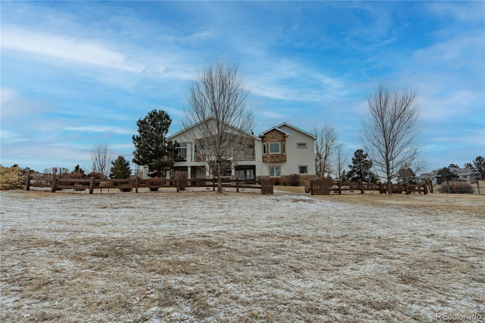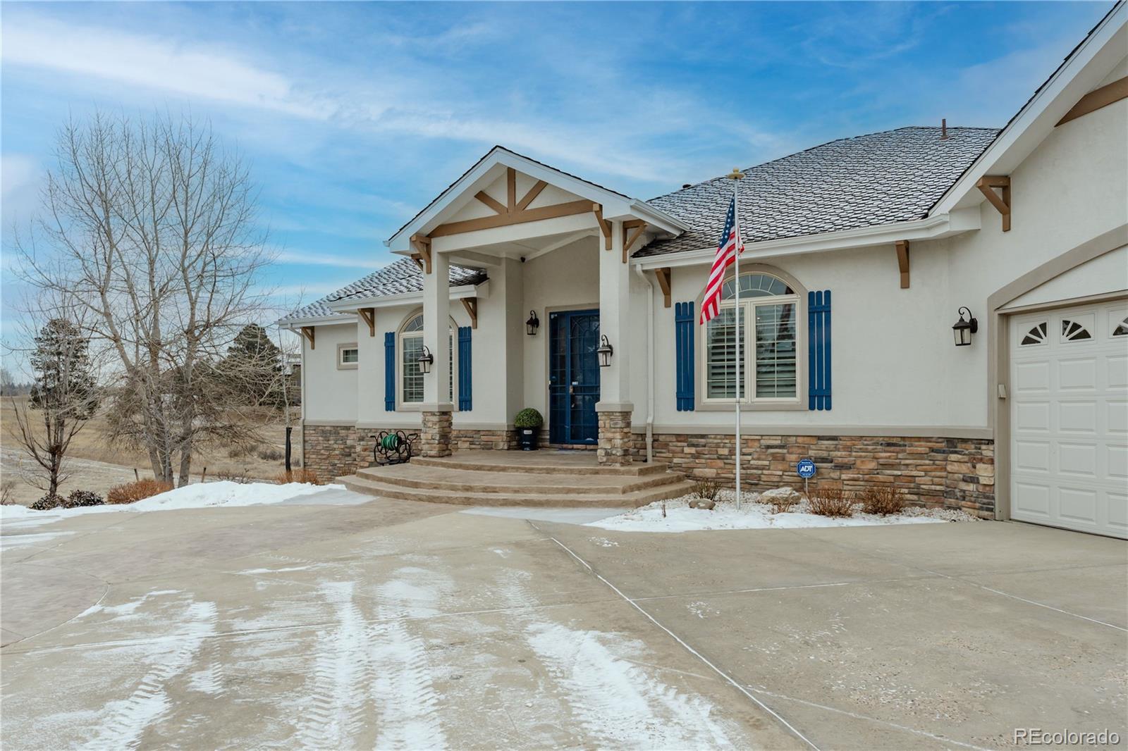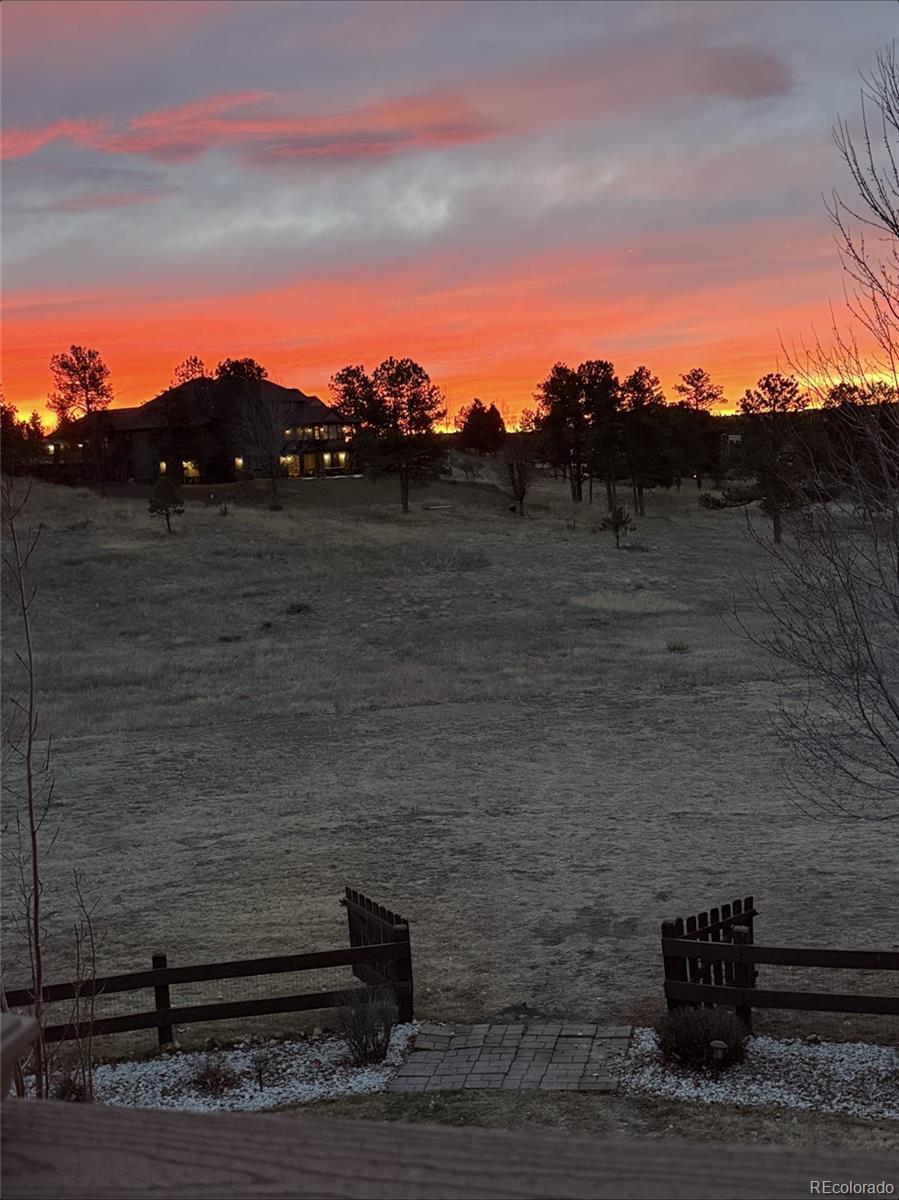 Some homes impress when you walk inside. This one impresses before you even turn off the engine. Set on over 3 acres in Bell Cross Ranch, where only a limited number of custom estates exist, this property offers a level of parking, garage space, and flexibility that is exceptionally rare, all bordered by expansive open space. The arrival sets the tone with a circular concrete driveway, generous turnaround space, and an oversized concrete parking pad, ideal for trailers, boats, extra vehicles, or equipment. The garages are the true standout: an attached 4-car garage plus a massive detached 4-car/RV garage built to accommodate a full-size RV, boats, or vehicle collection, complete with RV hookups, loft storage, and extensive space for tools and storage. Inside, over 6,100 sq ft offers light-filled living with sweeping views across Colorado’s Front Range landscape. Every bedroom features its own en suite bath. More than $300,000 in recent upgrades include a new roof in 2024, fresh interior and exterior paint, refinished Alderwood hardwood floors, stacked-stone fireplaces, new carpeting, and updated lighting. Outdoor living includes a four-season sunroom, new deck, covered patio, landscaped grounds, garden beds, fruit trees, and a dedicated dog run. Just minutes to Parker, DTC, and E-470/I-25, this estate delivers privacy, scale, and unmatched garage capability.