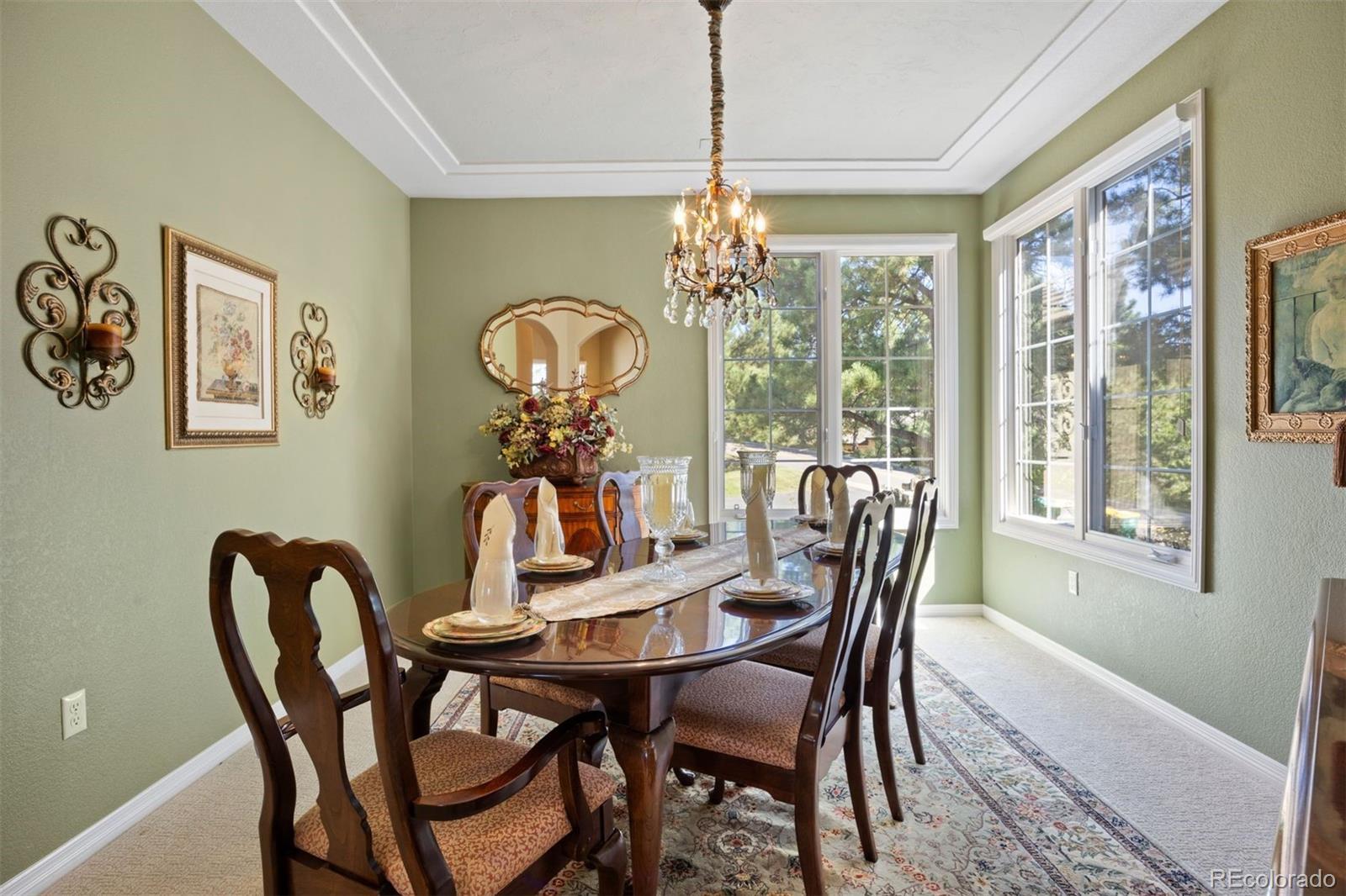 This beautifully updated, low maintenance, patio home in The Greens at The Village at Castle Pines offers privacy, stunning mountain views, and modern upgrades. The open-concept design showcases a three-sided gas fireplace, expansive windows that flood the space with natural light, and a seamless transition between the living, dining, and kitchen areas. The remodeled 2024 kitchen features custom cabinetry, granite countertops, and brand-new Bosch appliances, including an induction cooktop— thoughtfully designed for both style and functionality. Additionally, the kitchen is equipped with an RO water filtration system, ensuring pure, great-tasting water right at your fingertips. The main-floor primary suite is a tranquil retreat, with private access to the back deck and breathtaking views of Pikes Peak. Relax in front of the gas fireplace, or unwind in the remodeled en suite bath, complete with double vanities, a freestanding tub, a glass-enclosed shower, and a walk-in closet with custom built-ins. Additional updates include refinished hardwoods and new carpeting (2023). A secondary bedroom on the main level boasts large windows, high ceilings, and easy access to an updated full bath featuring a modern vessel sink. The main floor is completed by a private office, updated laundry room, and formal dining room. The walkout lower level offers two additional bedrooms, a full bath, and a spacious rec room with a dry bar and built-in shelves. A large utility room provides ample storage space. Outdoor living is a highlight, with a spacious deck featuring a built-in gas fire pit, Viking gas grill, and a hot tub. The HOA handles lawn care and snow removal for easy living.