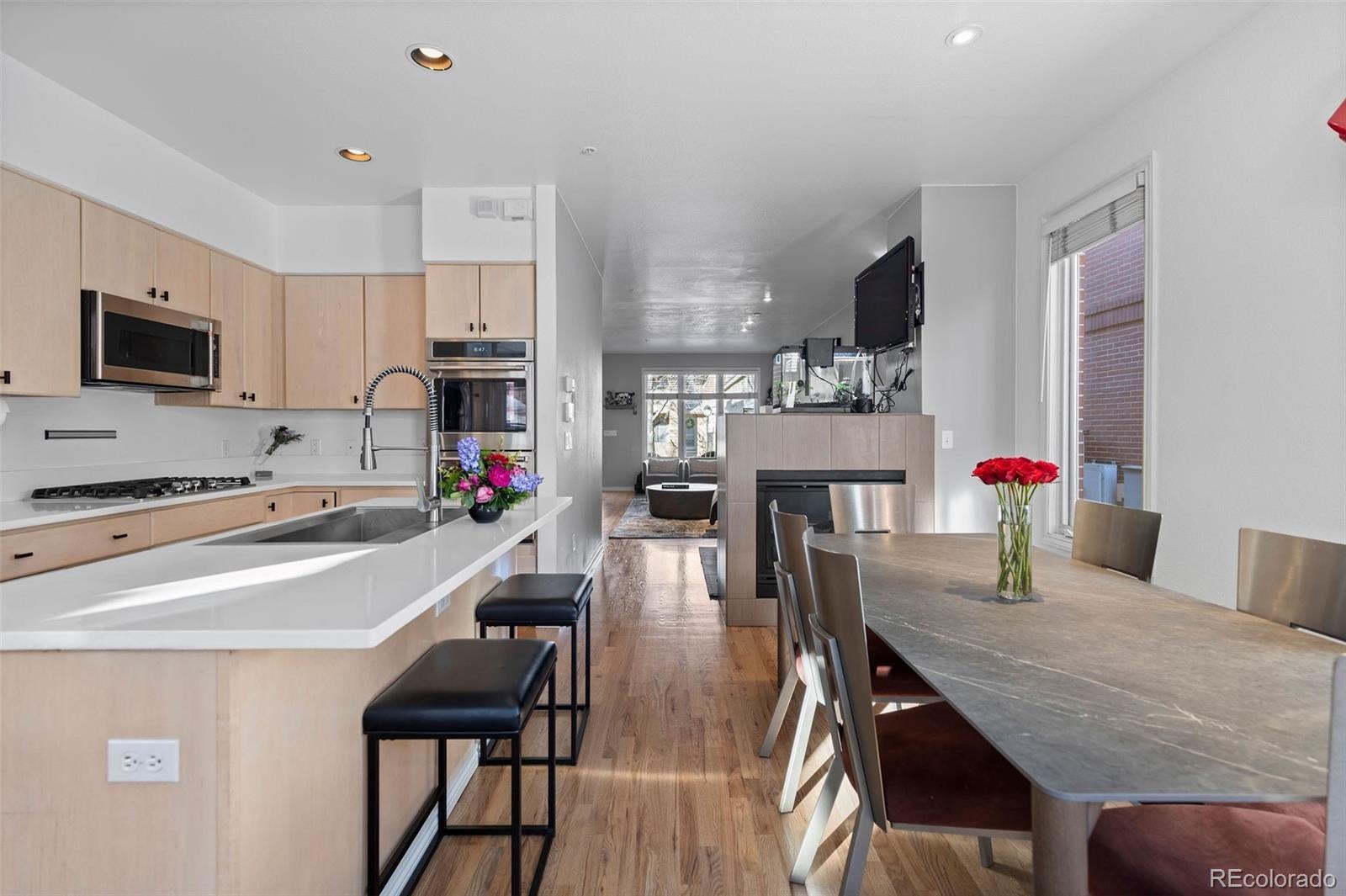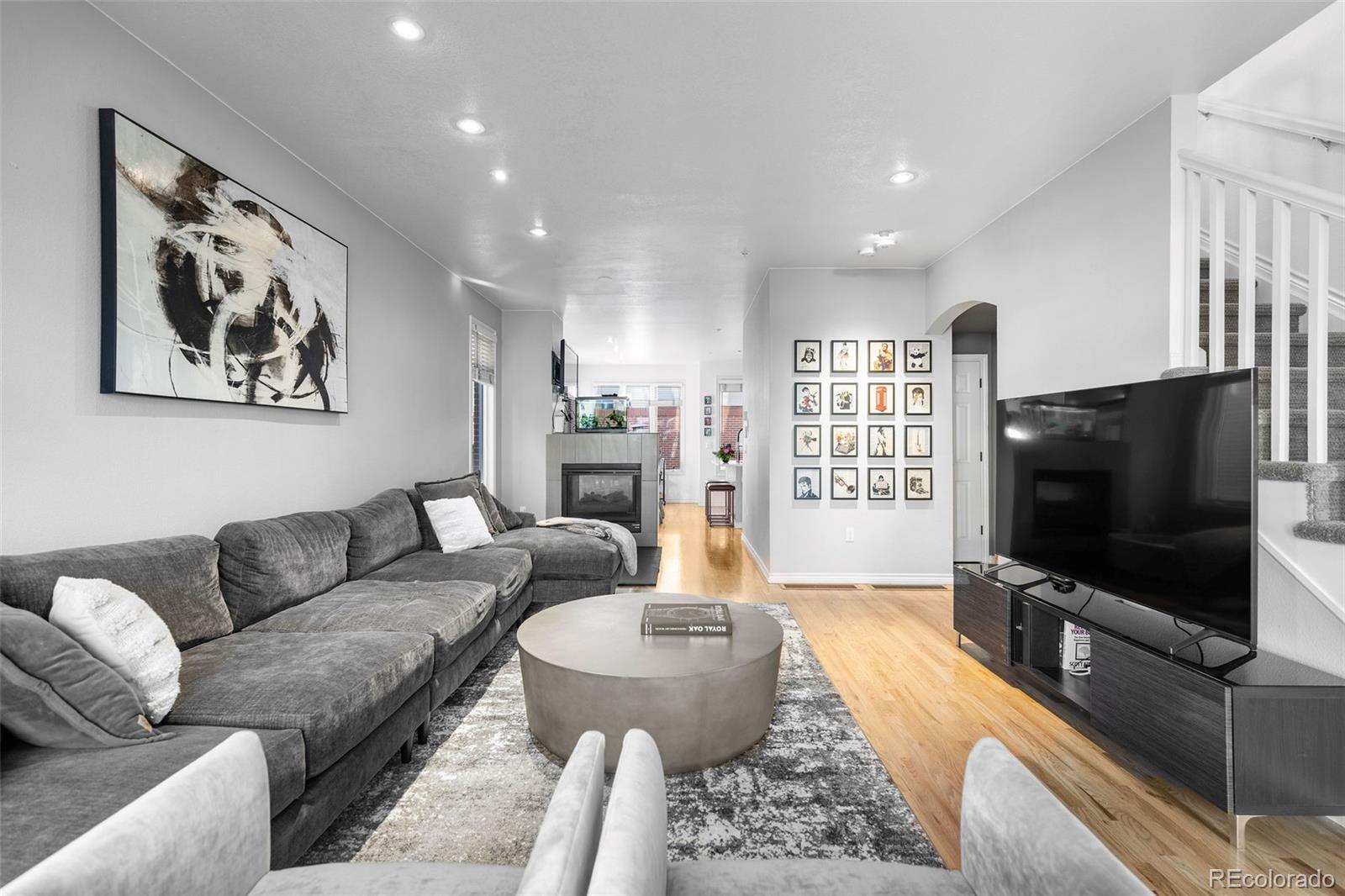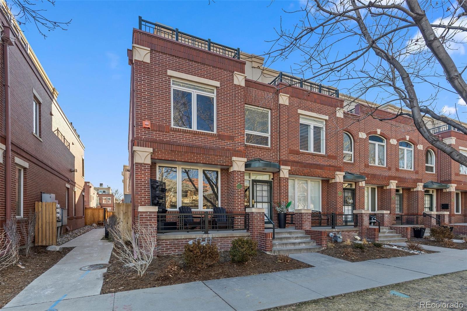 Set in the heart of Cherry Creek, this coveted end-unit brownstone offers a thoughtfully designed layout, quality finishes, and direct access to a private two-car garage, all within walking distance to neighborhood shops and restaurants. The main level is open and functional, with hardwood floors and a double-sided fireplace connecting the living room and kitchen. The kitchen is updated with quartz countertops, a center island, and new stainless-steel appliances. Just outside, a private flagstone patio with landscape lighting creates an easy outdoor extension of the living space. The second level includes a secondary bedroom and a three-quarter bath with a glass-enclosed shower, along with a spacious primary suite featuring its own balcony and a well-appointed bath with marble finishes and a soaking tub. The third floor loft provides flexible space for a home office, media room, gym, or additional lounge. East- and west-facing decks offer open city views and great natural light throughout the day. The finished basement adds even more versatility with a second living area, a full bath, and a conforming bedroom, ideal for guests or extended stays. The HOA handles exterior and grounds maintenance, water, trash and recycling, snow removal, and front landscaping, making for low-maintenance living in one of Denver’s most sought-after neighborhoods. In a prime location, you can walk to the world-renowned Cherry Creek shopping center, multiple parks, Gates Tennis Courts and award-winning restaurants, this home is ready for its next owner!