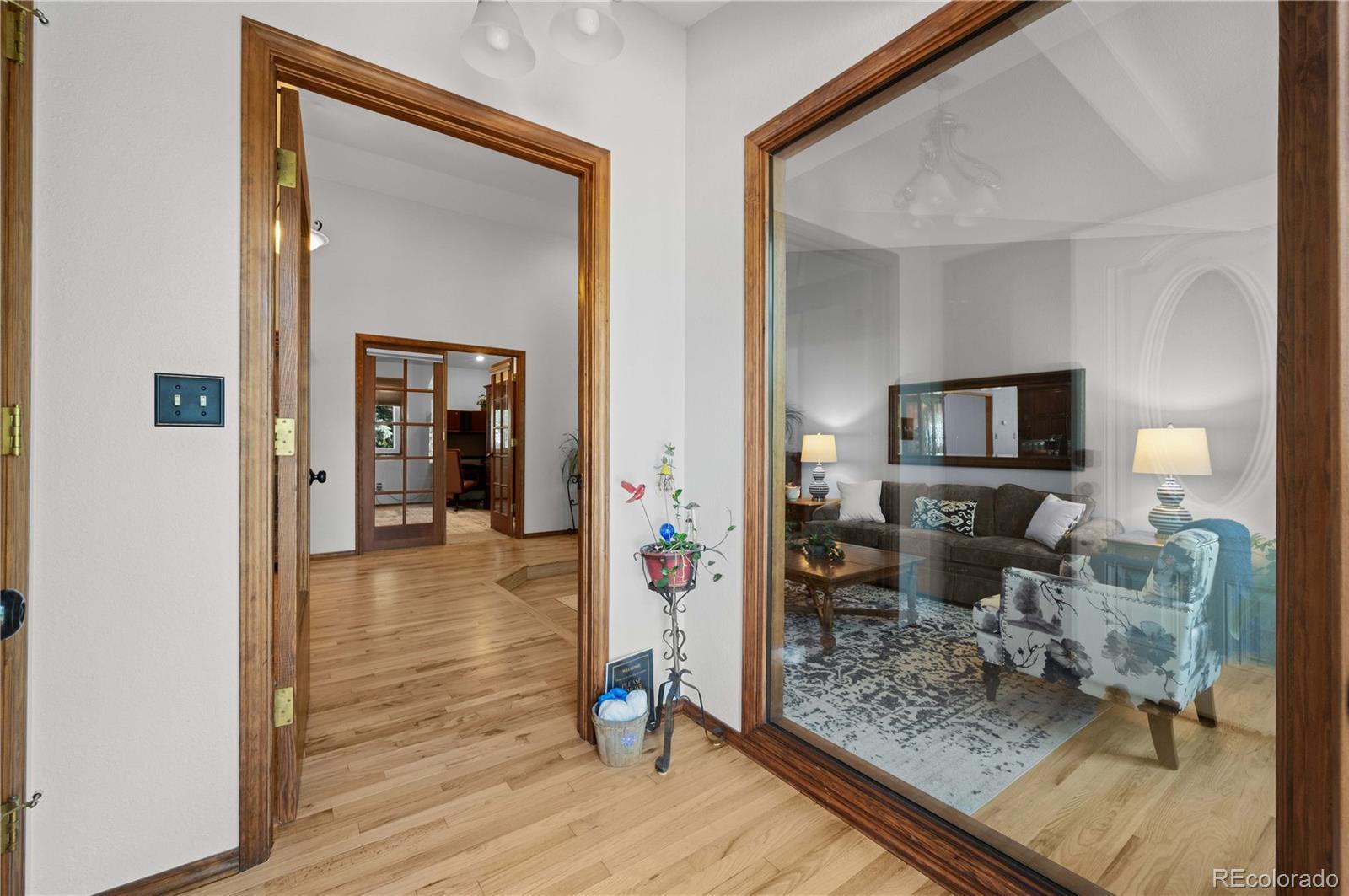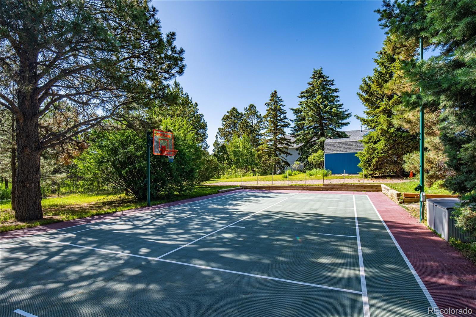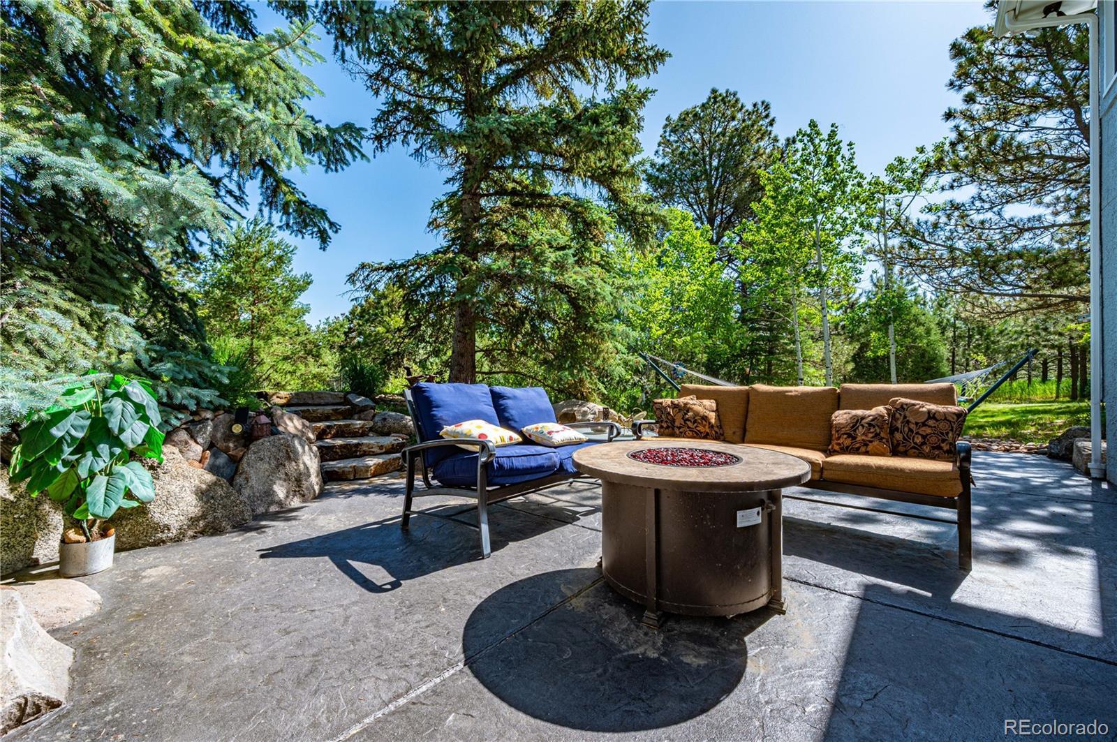 Set on nearly five acres of beautifully landscaped and reforested land, this warm and inviting custom ranch-style home offers privacy, space, serenity, and a true Colorado lifestyle—just 15 minutes from everyday amenities. Located in the desirable equine community of Canterbury, five miles east of Monument, this tranquil retreat offers quick access to I-25 for an easy commute to Colorado Springs, Castle Rock, or Denver. A resurfaced asphalt driveway leads to a meticulously maintained home with a stamped concrete entry and expansive composite deck featuring a BBQ alcove and glass wind screen—perfect for enjoying Colorado sunsets. Inside, newly refinished wood floors (2025) complement a refreshed gourmet kitchen with custom cabinetry, granite countertops, center island, and high-end appliances, opening to a formal dining area and spacious great room with a floor-to-ceiling stone fireplace. The upper level includes a primary suite with spa-style bath, jacuzzi tub, walk-in closets, and an adjoining flexible room ideal for an office, nursery, or bedroom. The walk-out lower level offers three additional bedrooms, family living space, fitness room, and a multi-function bath—well suited for guests or short-term rental potential. Outdoor amenities include a stamped concrete patio, fire pit, waterfall feature, artificial turf, and a lighted sport court for pickleball, basketball, or tennis. Professionally forest-managed with extensive fire mitigation, wildlife, and mature trees, the property also features major upgrades including a Class 4 impact-resistant roof, new gutters, furnace, hot water heater, updated windows, and an oversized 3-car garage with shop space—offering privacy, beauty, and convenience in one exceptional setting.