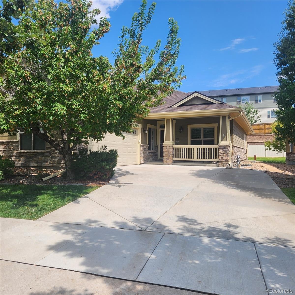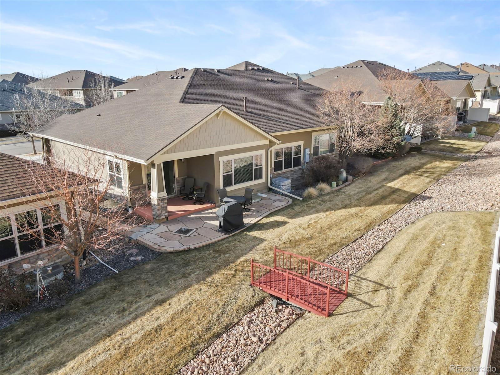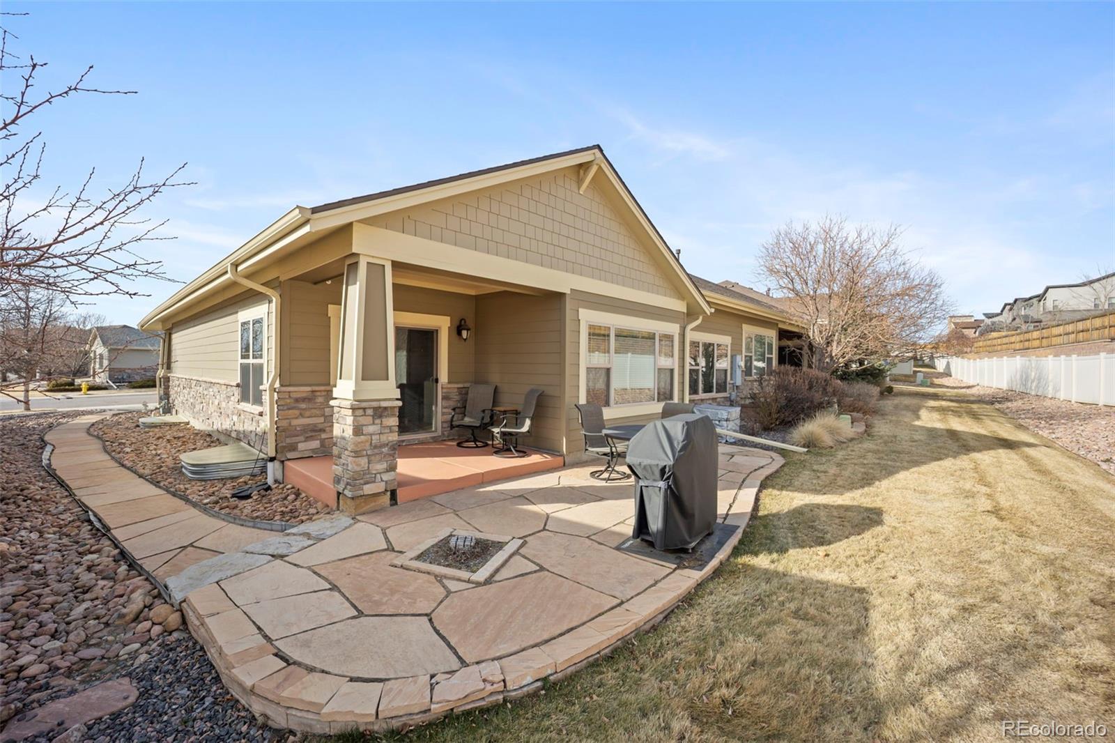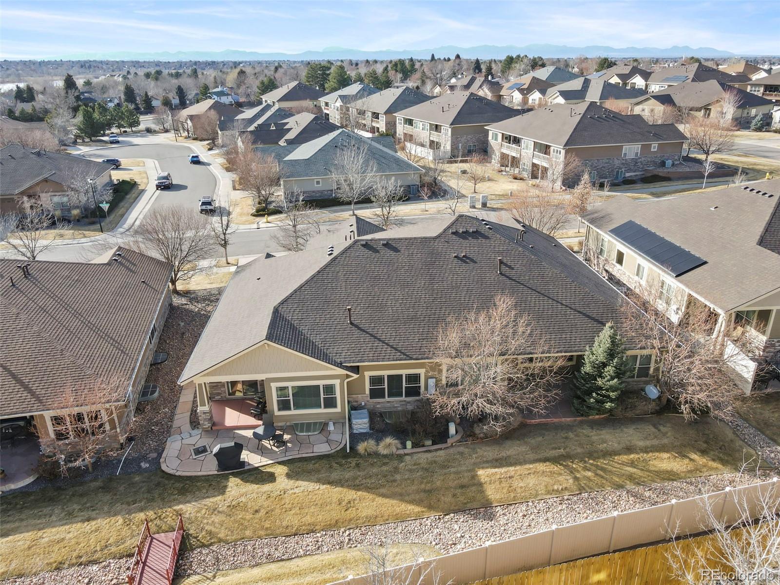One story living at it's best - Lock, Leave & Love it! Enjoy low-maintenance living where someone else handles the lawn care and snow removal! Step inside to beautiful hardwood flooring throughout the main floor living areas, soaring 9' ceilings and an open concept designed for comfortable living & effortless entertaining. The kitchen shines with newer quartz counters, black stainless steel appliances (all included), a Samsung gas stove has WiFi connectivity, air-fry, dehydration, and more - all controlled from your phone. Cozy up on winter evenings by the gas fireplace with elegant travertine tile surround. The main-floor office (or bedroom) features a solid double-door entry and a walk-in closet. The spacious and vaulted primary suite offers a luxurious 5-piece bath and an over-sized closet you will love! Laundry/Mud Room is on the main floor with a large counter, and hooks for backpacks or coats. Extra large capacity W/D (included). Downstairs, the expansive family room is perfect for movie nights, game days, billiards or a fitness area, with in-wall surround sound. Entertain with ease at the wet bar, complete with cabinetry, microwave and a small refrigerator. Two additional bedrooms and a full bath provide ideal space for guests. You'll also find over 600 square feet of unfinished storage plus a bonus area under-stair closet - perfect for luggage and seasonal items. Host summer BBQs on the slate patio with space for multiple seating areas or a fire pit, plus a covered patio for added comfort. Relax on the front porch and enjoy evening sunsets. The nearly 500-square foot garage includes built-in cabinetry to keep everything organized. Great Location - ten minutes to Southlands, go walking around Aurora Reservoir, 20 minutes to Park Meadows, 25 minutes to Denver International Airport. New roof April 2024. This is truly low-maintenance living without sacrificing space, style or location. Gated at the Quincy entrance.
