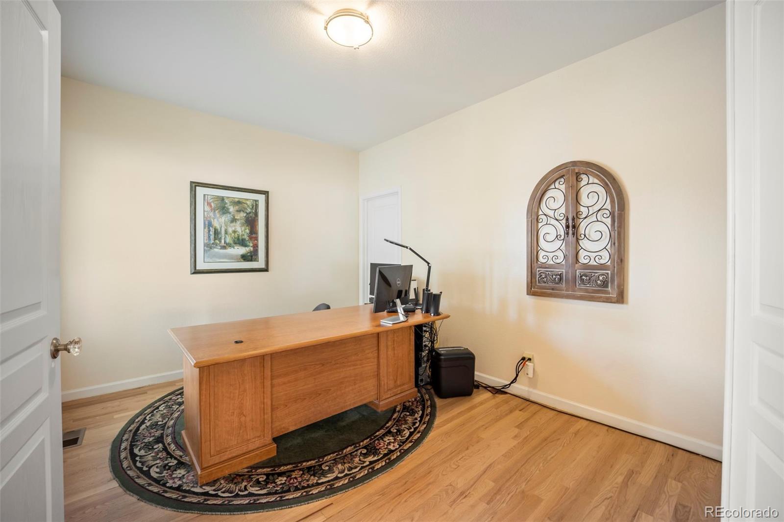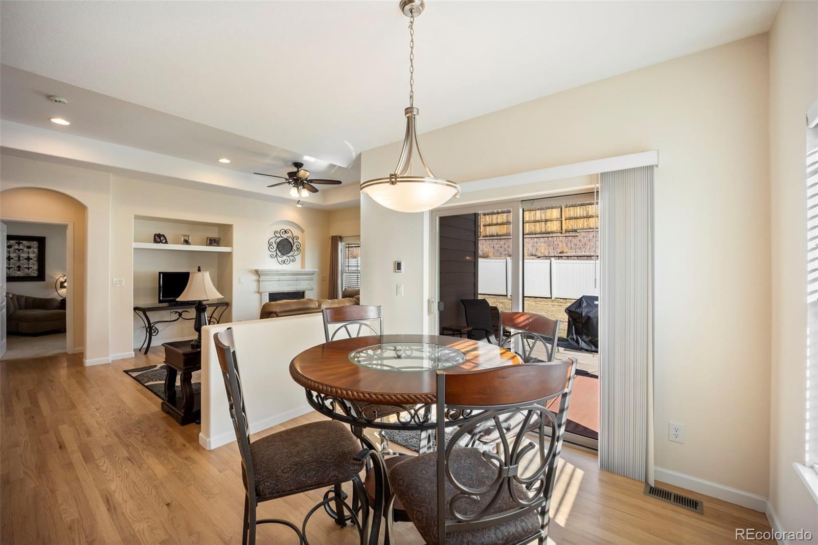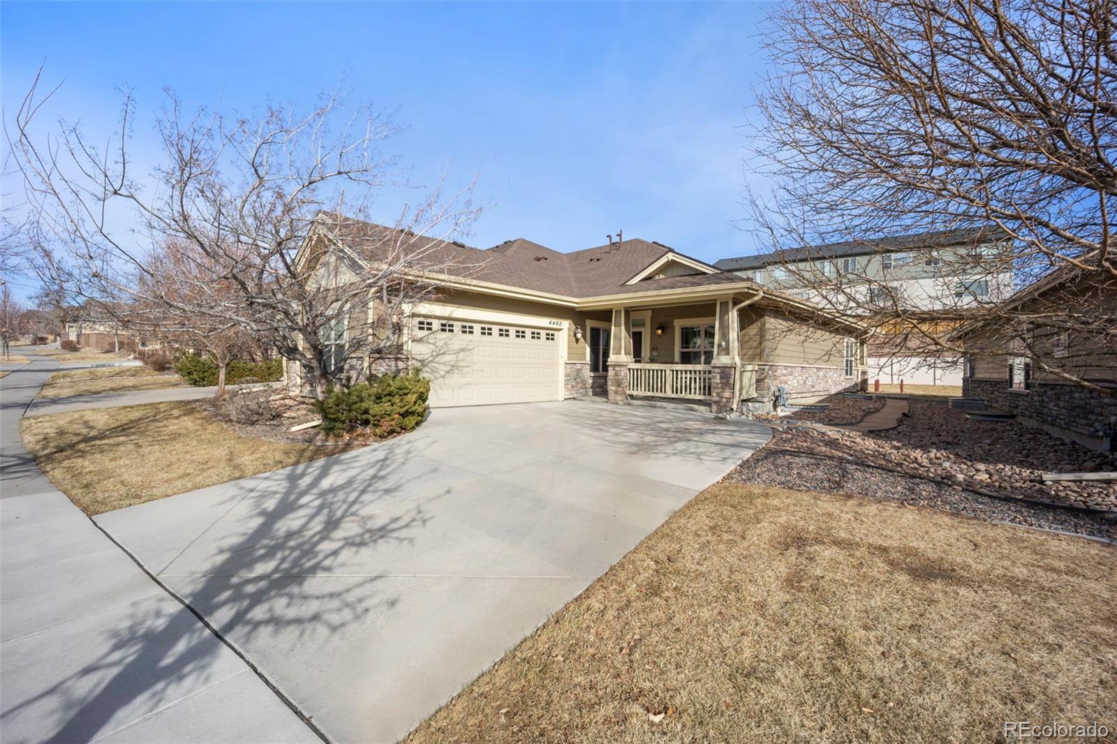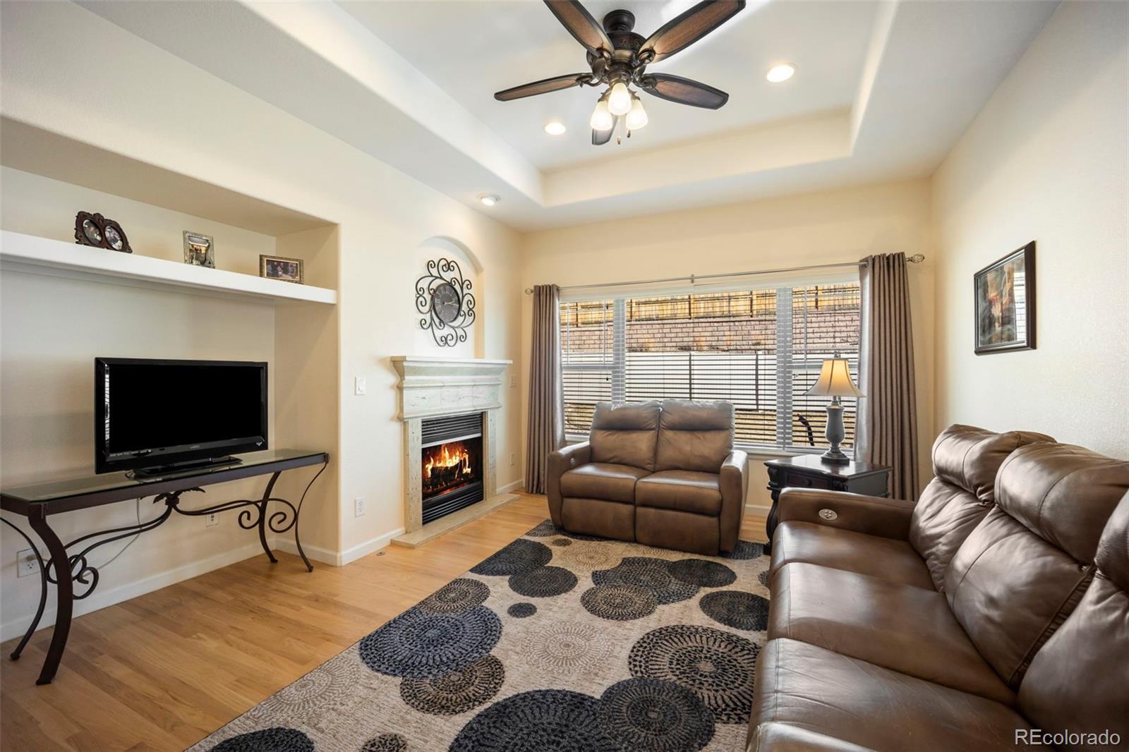 One story living at it's best - Lock, Leave & Love it! Enjoy low-maintenance living where someone else handles the lawn care and snow removal! Step inside to beautiful hardwood flooring throughout the main floor living areas, soaring 9' ceilings and an open concept designed for comfortable living & effortless entertaining. The kitchen shines with newer quartz counters, black stainless steel appliances (all included), a Samsung gas stove has WiFi connectivity, air-fry, dehydration, and more - all controlled from your phone. Cozy up on winter evenings by the gas fireplace with elegant travertine tile surround. The main-floor office (or bedroom) features a solid double-door entry and a walk-in closet. The spacious and vaulted primary suite offers a luxurious 5-piece bath and an over-sized closet you will love! Laundry/Mud Room is on the main floor with a large counter, and hooks for backpacks or coats. Extra large capacity W/D (included). Downstairs, the expansive family room is perfect for movie nights, game days, billiards or a fitness area, with in-wall surround sound. Entertain with ease at the wet bar, complete with cabinetry, microwave and a small refrigerator. Two additional bedrooms and a full bath provide ideal space for guests. You'll also find over 600 square feet of unfinished storage plus a bonus area under-stair closet - perfect for luggage and seasonal items. Host summer BBQs on the slate patio with space for multiple seating areas or a fire pit, plus a covered patio for added comfort. Relax on the front porch and enjoy evening sunsets. The nearly 500-square foot garage includes built-in cabinetry to keep everything organized. Great Location - ten minutes to Southlands, go walking around Aurora Reservoir, 20 minutes to Park Meadows, 25 minutes to Denver International Airport. New roof April 2024. This is truly low-maintenance living without sacrificing space, style or location. Gated at the Quincy entrance.