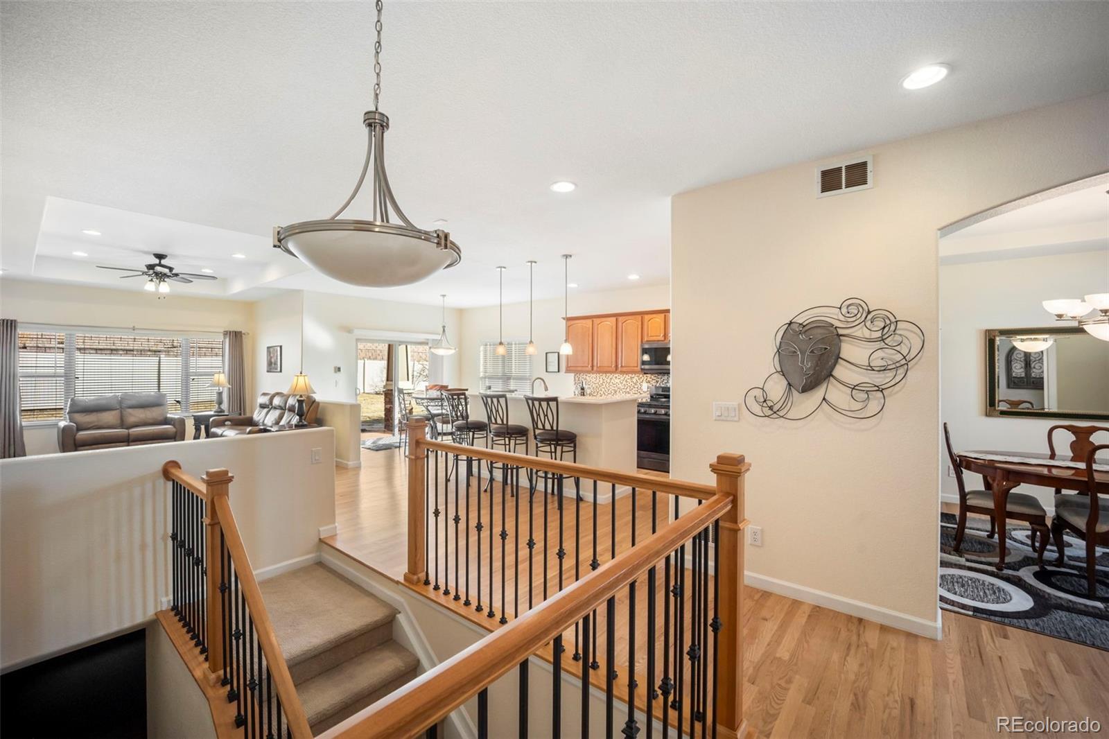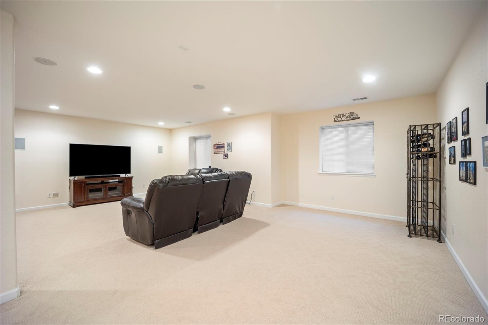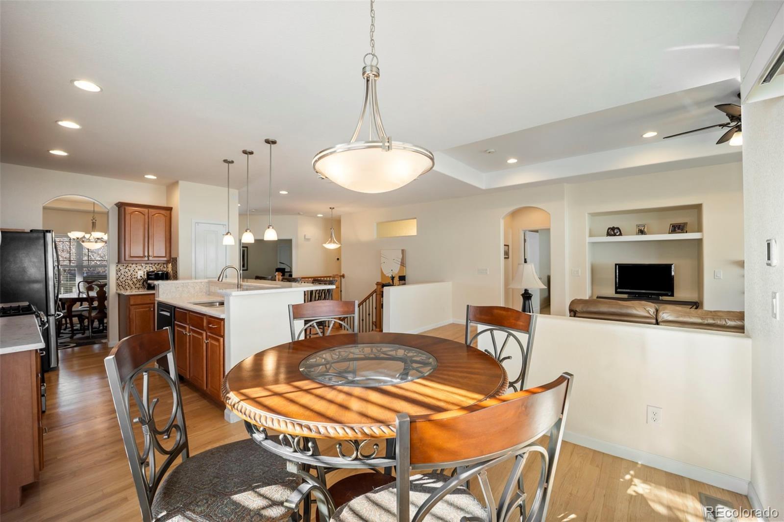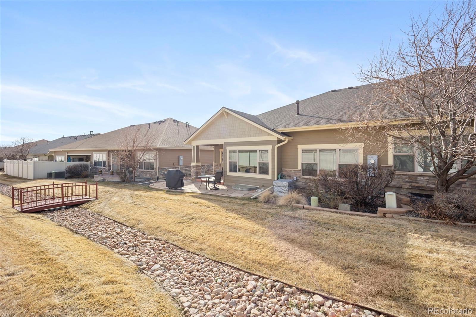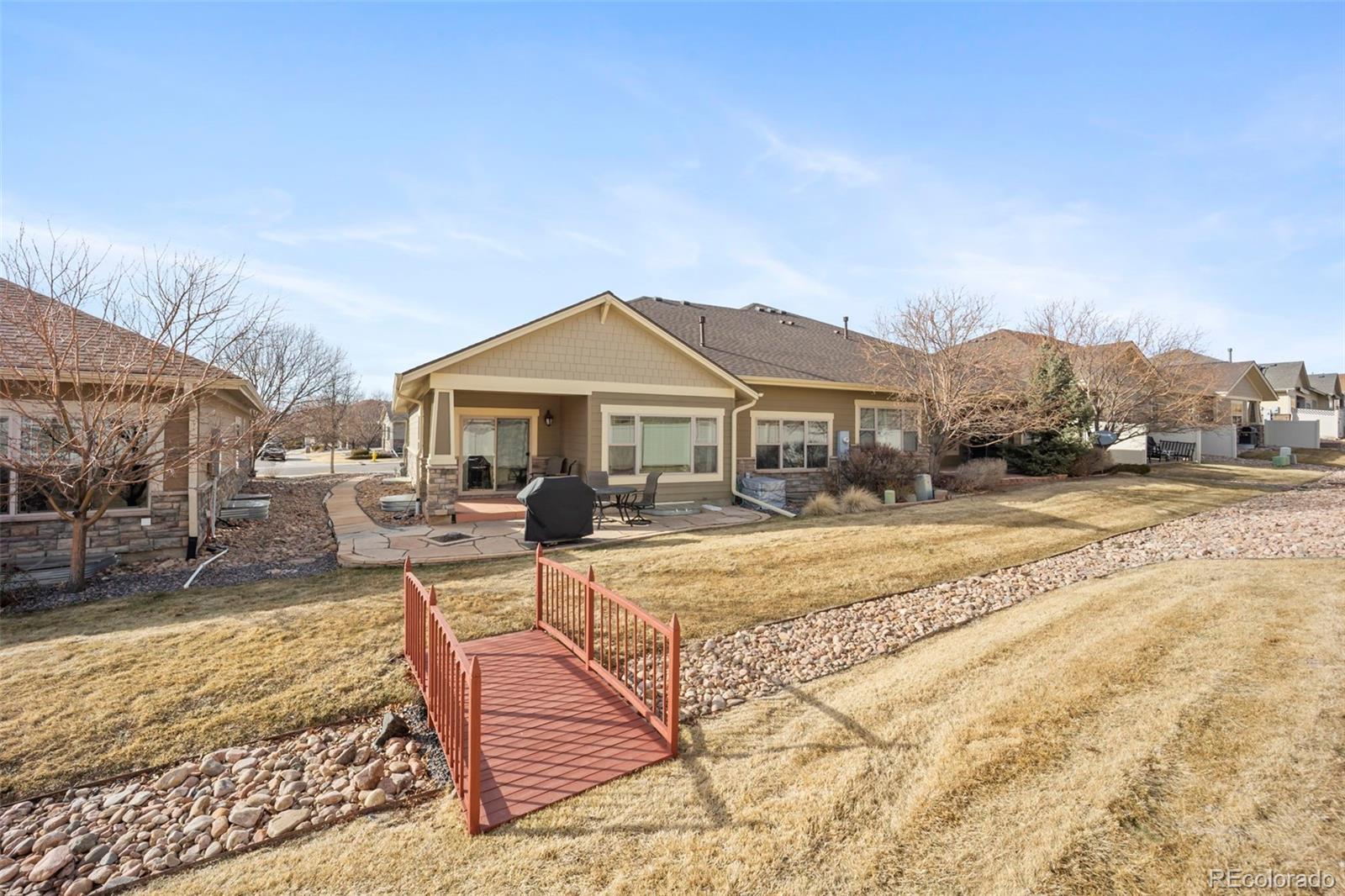 One story living at it's best - Lock, Leave & Love it! Enjoy low-maintenance living where someone else handles the lawn care and snow removal! Step inside to beautiful hardwood flooring throughout the main floor living areas, soaring 9' ceilings and an open concept designed for comfortable living & effortless entertaining. The kitchen shines with newer quartz counters, black stainless steel appliances (all included), a Samsung gas stove has WiFi connectivity, air-fry, dehydration, and more - all controlled from your phone. Cozy up on winter evenings by the gas fireplace with elegant travertine tile surround. The main-floor office (or bedroom) features a solid double-door entry and a walk-in closet. The spacious and vaulted primary suite offers a luxurious 5-piece bath and an over-sized closet you will love! Laundry/Mud Room is on the main floor with a large counter, and hooks for backpacks or coats. Extra large capacity W/D (included). Downstairs, the expansive family room is perfect for movie nights, game days, billiards or a fitness area, with in-wall surround sound. Entertain with ease at the wet bar, complete with cabinetry, microwave and a small refrigerator. Two additional bedrooms and a full bath provide ideal space for guests. You'll also find over 600 square feet of unfinished storage plus a bonus area under-stair closet - perfect for luggage and seasonal items. Host summer BBQs on the slate patio with space for multiple seating areas or a fire pit, plus a covered patio for added comfort. Relax on the front porch and enjoy evening sunsets. The nearly 500-square foot garage includes built-in cabinetry to keep everything organized. Great Location - ten minutes to Southlands, go walking around Aurora Reservoir, 20 minutes to Park Meadows, 25 minutes to Denver International Airport. New roof April 2024. This is truly low-maintenance living without sacrificing space, style or location. Gated at the Quincy entrance.