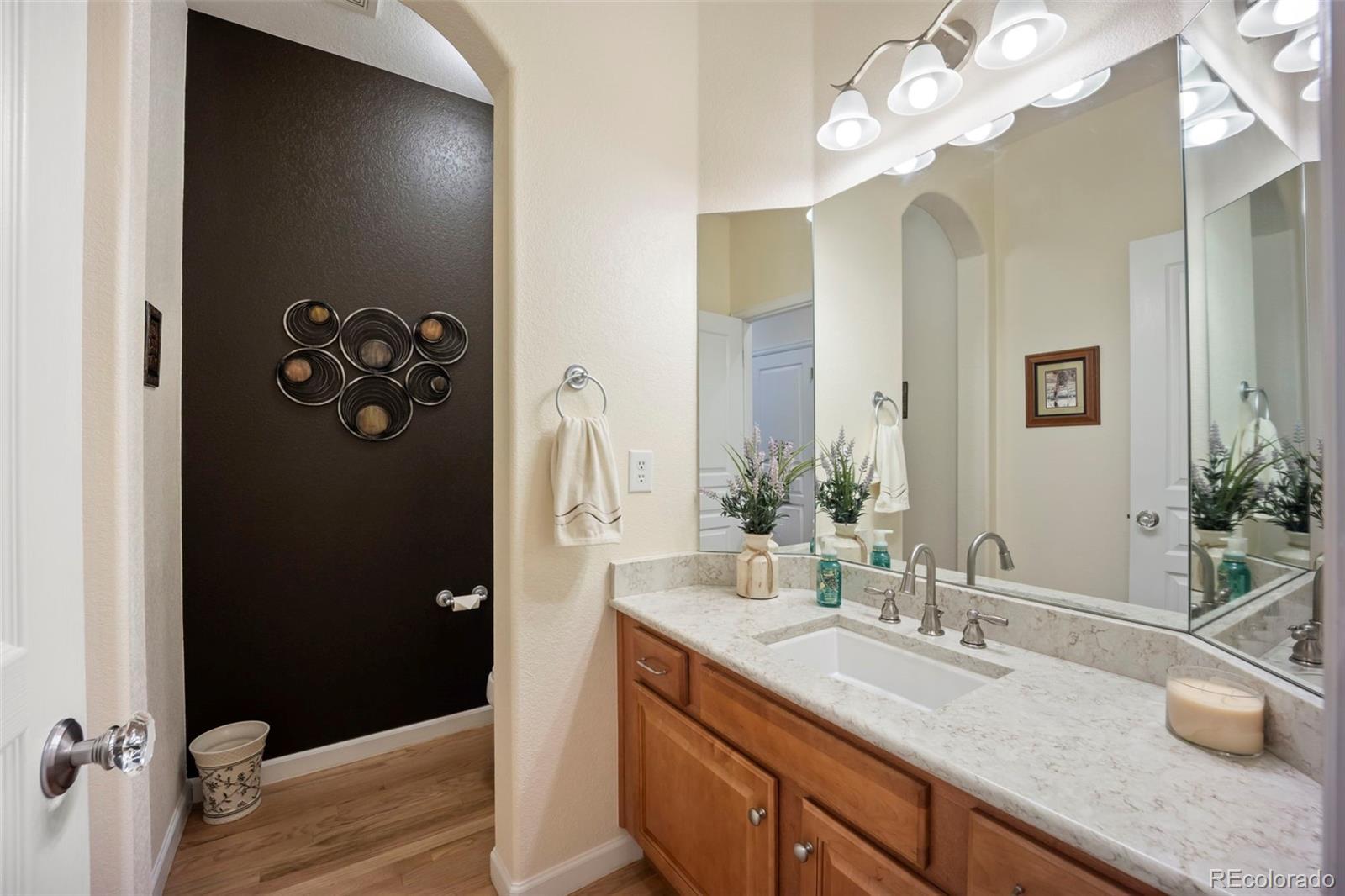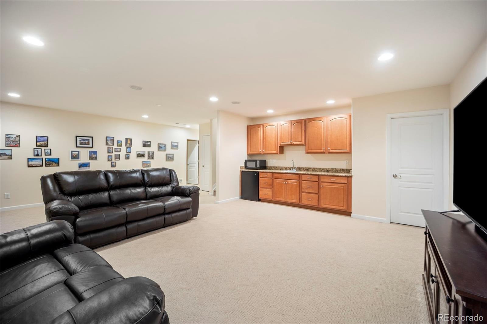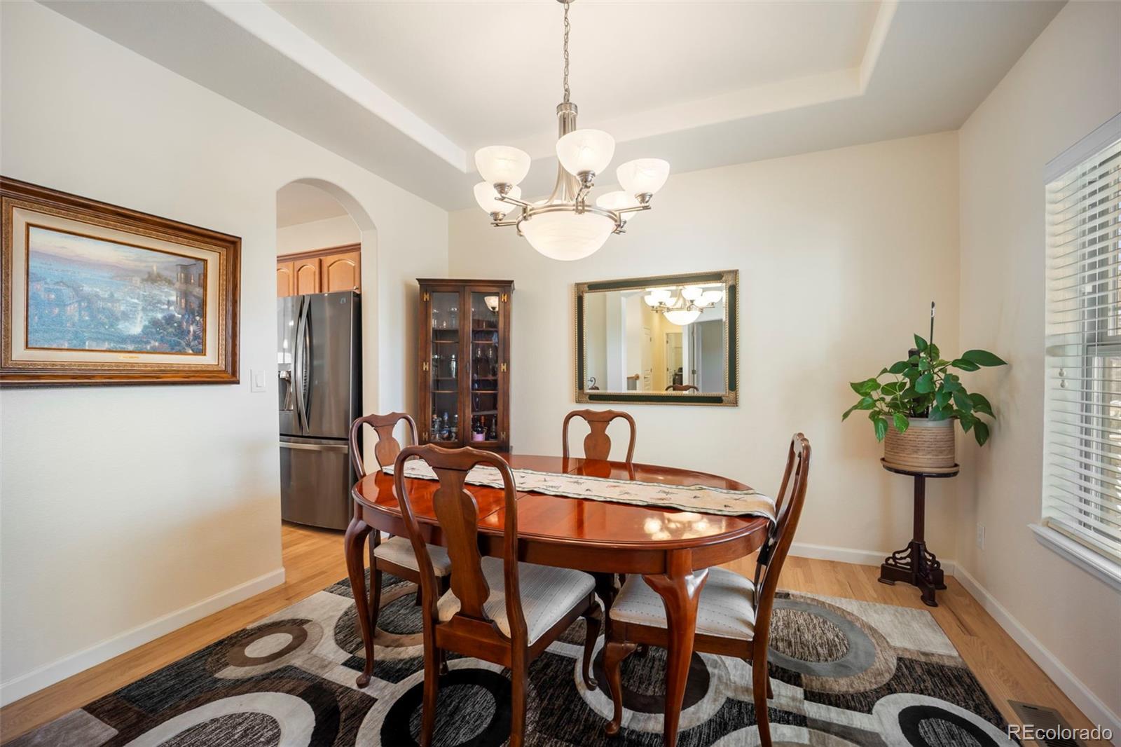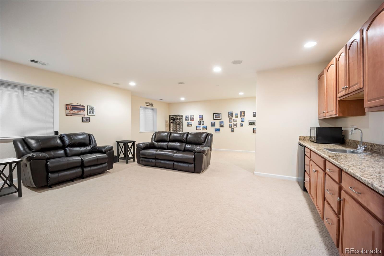 One story living at it's best - Lock, Leave & Love it! Enjoy low-maintenance living where someone else handles the lawn care and snow removal! Step inside to beautiful hardwood flooring throughout the main floor living areas, soaring 9' ceilings and an open concept designed for comfortable living & effortless entertaining. The kitchen shines with newer quartz counters, black stainless steel appliances (all included), a Samsung gas stove has WiFi connectivity, air-fry, dehydration, and more - all controlled from your phone. Cozy up on winter evenings by the gas fireplace with elegant travertine tile surround. The main-floor office (or bedroom) features a solid double-door entry and a walk-in closet. The spacious and vaulted primary suite offers a luxurious 5-piece bath and an over-sized closet you will love! Laundry/Mud Room is on the main floor with a large counter, and hooks for backpacks or coats. Extra large capacity W/D (included). Downstairs, the expansive family room is perfect for movie nights, game days, billiards or a fitness area, with in-wall surround sound. Entertain with ease at the wet bar, complete with cabinetry, microwave and a small refrigerator. Two additional bedrooms and a full bath provide ideal space for guests. You'll also find over 600 square feet of unfinished storage plus a bonus area under-stair closet - perfect for luggage and seasonal items. Host summer BBQs on the slate patio with space for multiple seating areas or a fire pit, plus a covered patio for added comfort. Relax on the front porch and enjoy evening sunsets. The nearly 500-square foot garage includes built-in cabinetry to keep everything organized. Great Location - ten minutes to Southlands, go walking around Aurora Reservoir, 20 minutes to Park Meadows, 25 minutes to Denver International Airport. New roof April 2024. This is truly low-maintenance living without sacrificing space, style or location. Gated at the Quincy entrance.