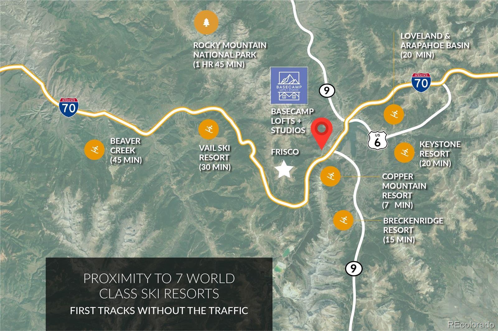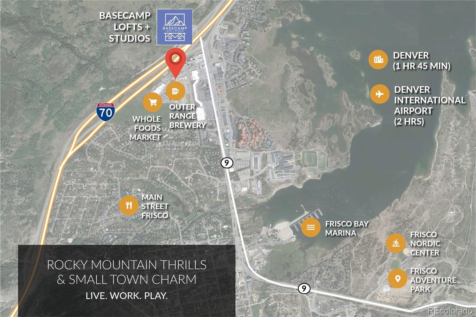 BRAND NEW MARKET RATE RESIDENCE WITH NO DEED RESTRICTIONS! Now available in the highly sought-after Phase 3 building, and with its central Frisco location, Basecamp Lofts provides the mountain enthusiast with everything they need and nothing they don’t. Perfectly situated in the Central Rockies, new Basecamp owners will have convenient access to the I-70 corridor for outdoor recreation from A-Basin to Moab, as well as easy routes to Denver and DIA. The two story, innovative design of the loft floor plan offers soaring ceilings and walls of glass, with a private lofted sleeping area (loft space is deemed a bedroom), small loft office, full kitchen, in-unit laundry, outdoor living space, two outdoor storage rooms for all of your seasonal mountain gear, and a covered carport with electrical line stubbed. Located next to Whole Foods Market, Outer Range Brewery, Pure Kitchen, Basecamp Wine and Spirits, and the Summit County Transfer Hub, the location is second to none for your mountain-metro experience. The homes are LEED Gold certified and will be serviced by electric heat/cool pumps for the utmost in energy efficiency and environmental consciousness. Plus, two private storage closets. Don’t wait—secure your Basecamp today! *99 year ground lease included in HOA dues. Owner upon re-sale must inform town of Frisco of intent to sell. In no buyer is found within the town of Frisco’s 30-day notice, the owner may list and sell the property via Broker via the MLS or FSBO.