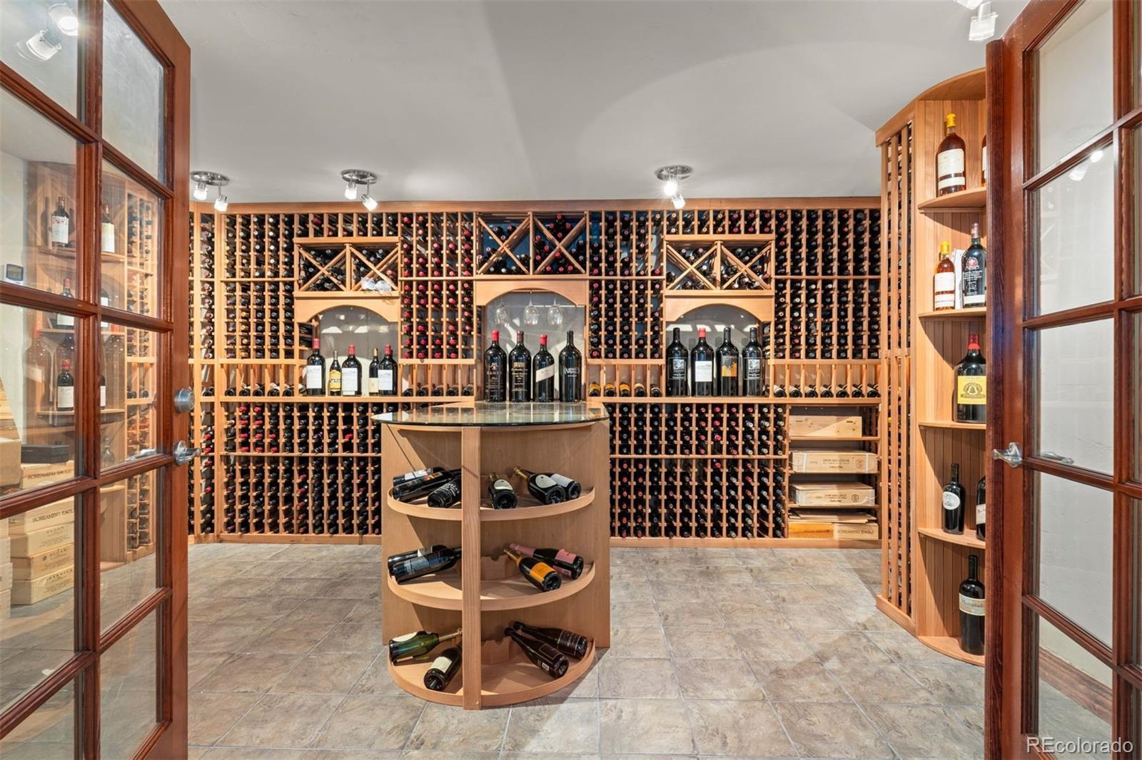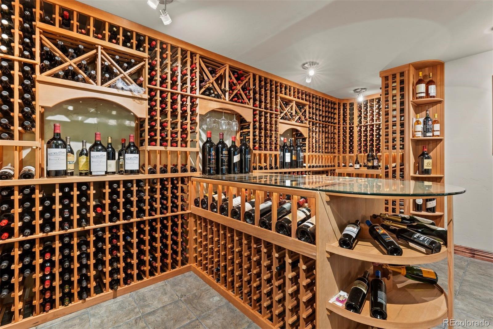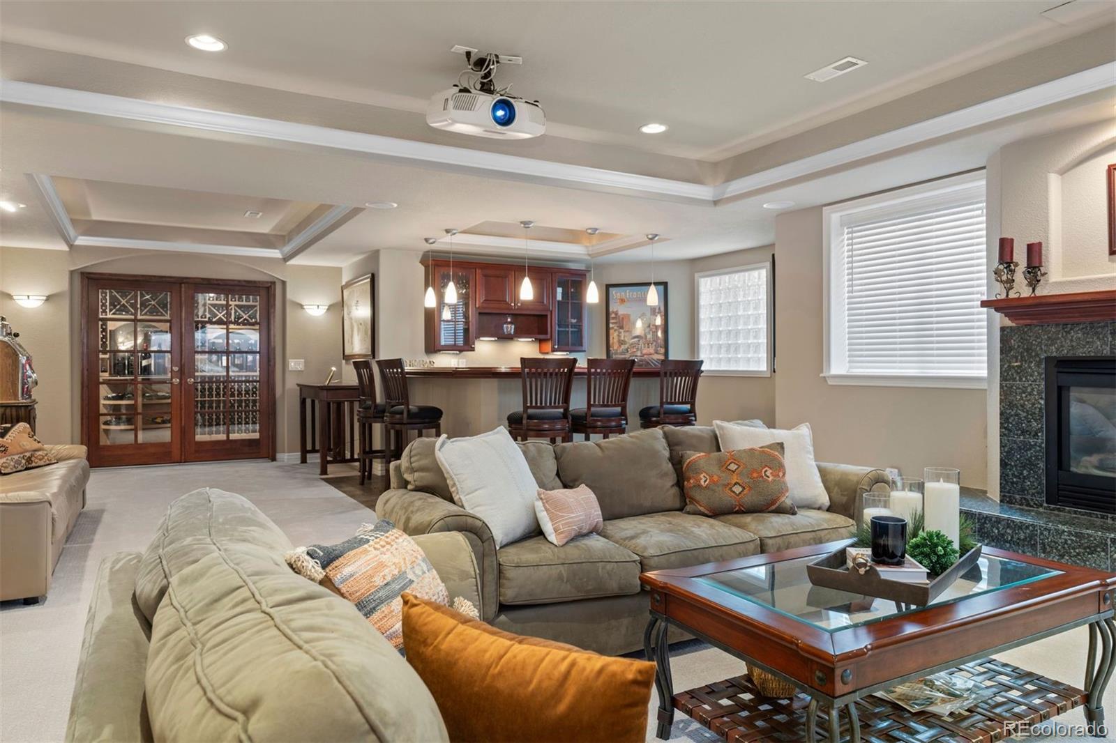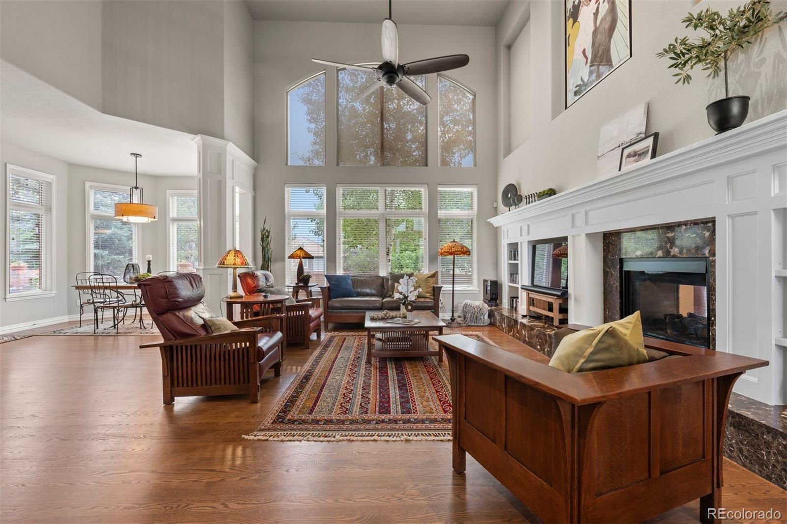Set in the coveted Estates enclave within the Cherry Creek School District, this beautifully crafted 4 bedroom | 5 bathroom home showcases timeless design and a park-like back yard framed by mature evergreens. An expansive great room anchors the main level with rich hardwood floors, a dramatic fireplace, custom built-ins, and a wall of windows capturing the landscape. The adjoining kitchen features extensive cherry cabinets, granite counters, wood floors, and a central island. A formal dining room with a tiered ceiling and wall of windows offers an elegant setting for gatherings, while the bright den, complete with hardwood floors, a clean-lined fireplace, and tall windows, adds a welcoming second living space. The main floor office includes custom built-ins and outdoor access opening to the manicured yard. A well appointed laundry room with a utility sink and outdoor access, along with a classic powder room, complete the level. Upstairs, the spacious primary suite showcases a dual-sided fireplace, sitting area, and refined architectural details. The primary bathroom includes a soaking tub, large walk-in shower, dual vanities, and abundant natural light. An upper level en suite bedroom features a bright window alcove and private full bath. Two additional bedrooms are connected by a shared full bathroom, with individual vanities. The finished lower level is highlighted by a large family room with a cozy fireplace, and a built-in projection system. The bar area transitions into an extraordinary, temperature-controlled wine cellar. Expansive in scale, it showcases custom racking and display niches, creating a showpiece environment perfectly suited for the most discerning collectors and entertainers alike. A bright workout room and a bonus room, currently showcasing a unique golf collection, complete the level. Located in Centennial, the home offers the convenience of suburban living with quick access to Downtown Denver, the Tech Center, and premier shopping and dining.