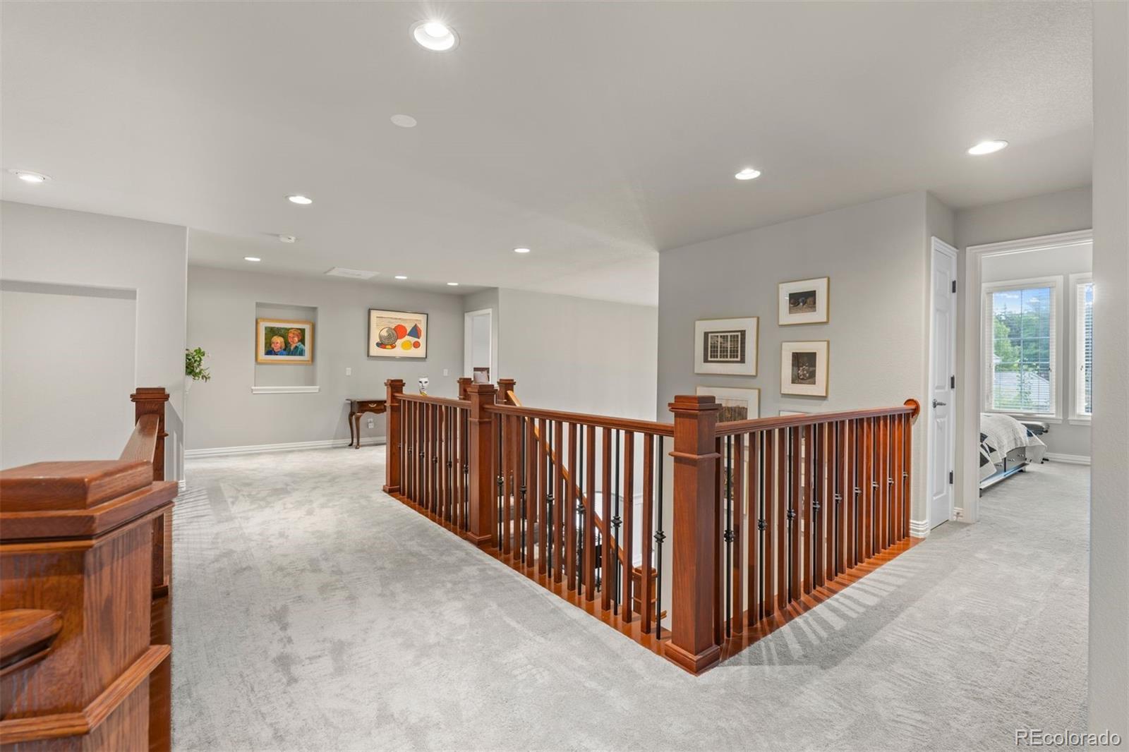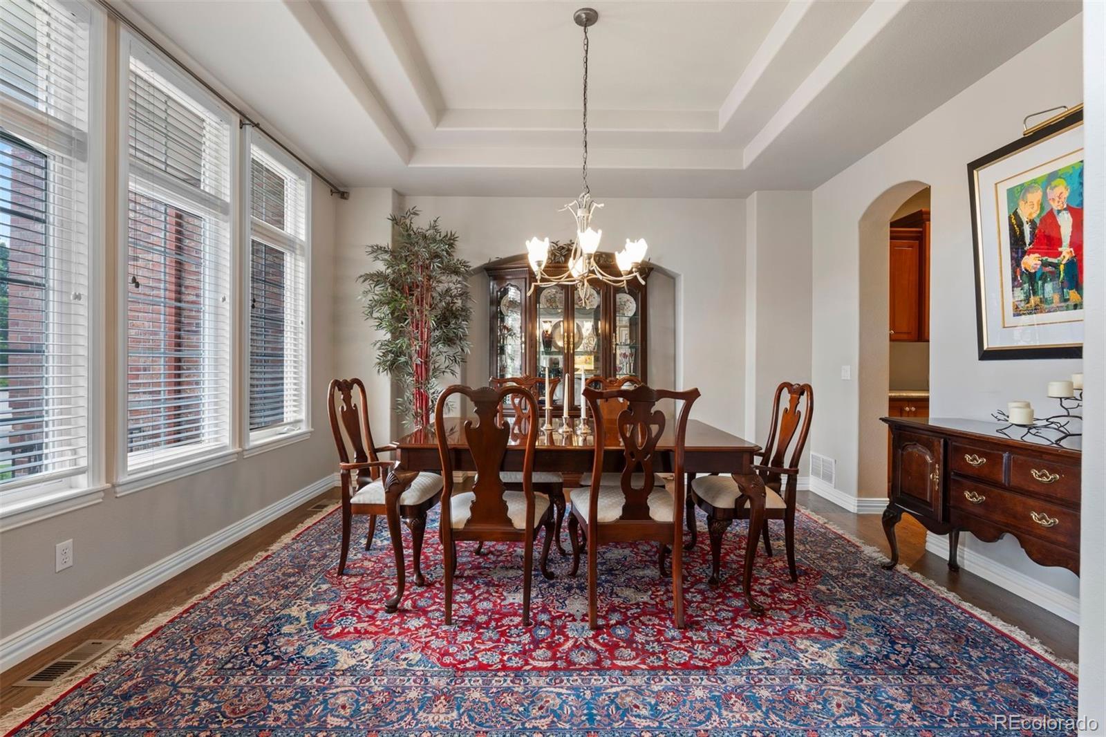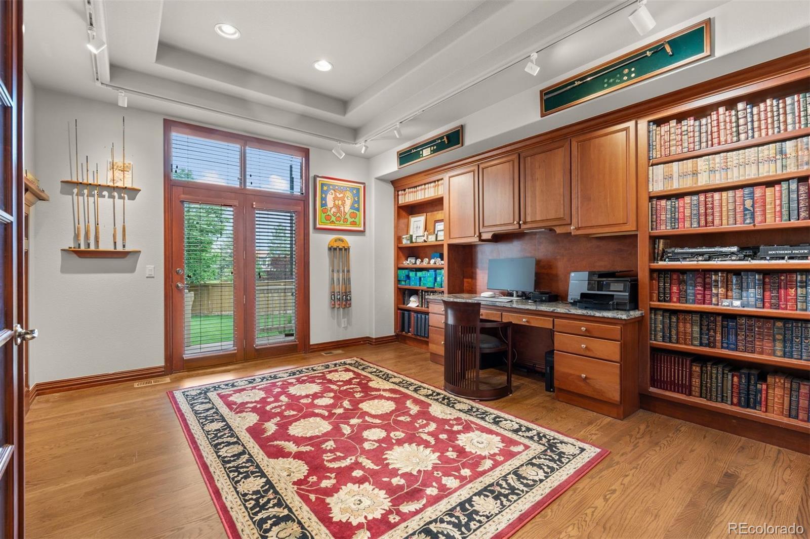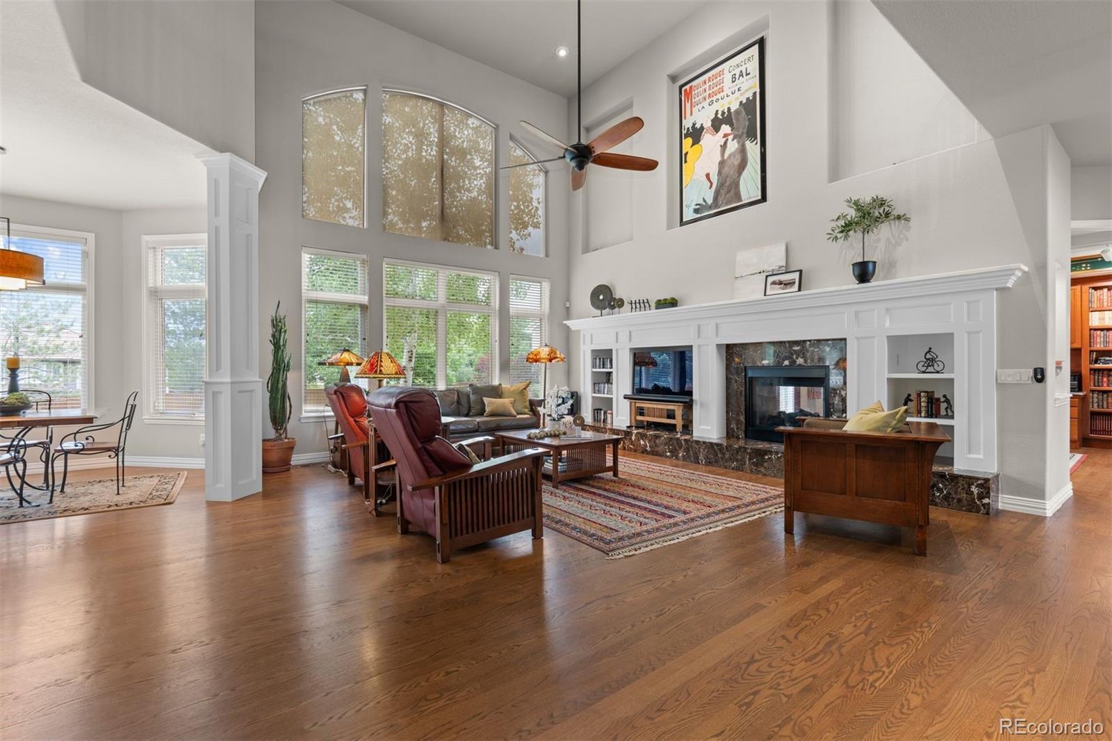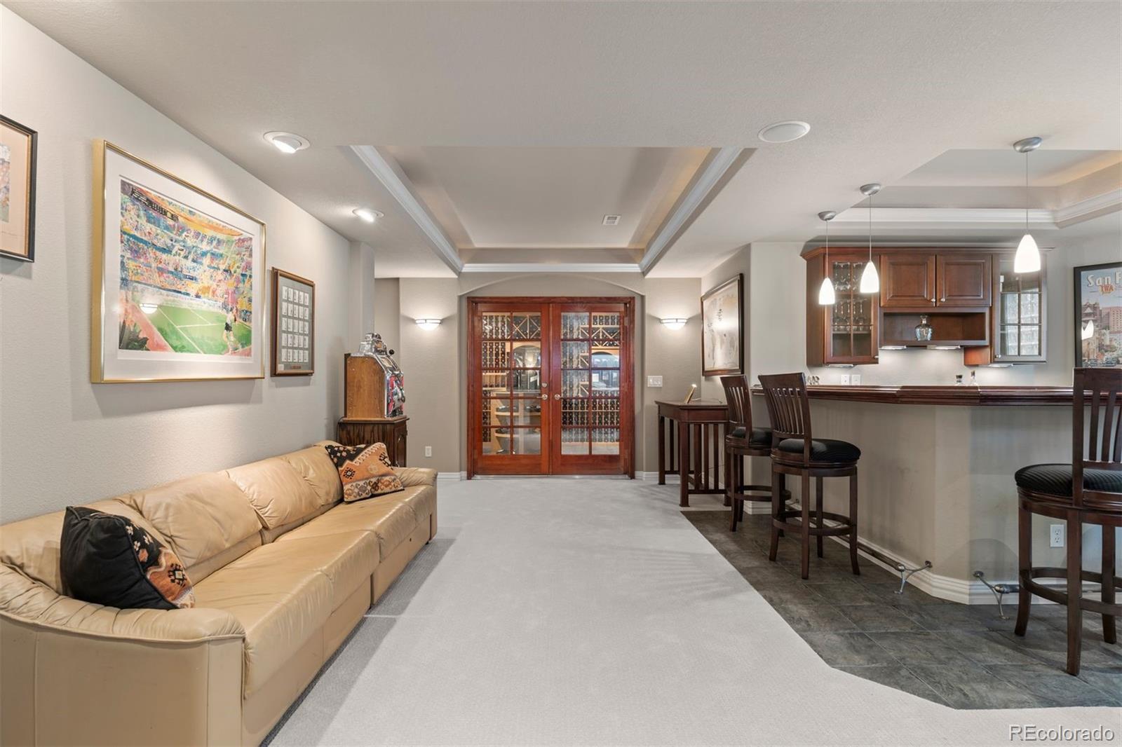 Set in the coveted Estates enclave within the Cherry Creek School District, this beautifully crafted 4 bedroom | 5 bathroom home showcases timeless design and a park-like back yard framed by mature evergreens. An expansive great room anchors the main level with rich hardwood floors, a dramatic fireplace, custom built-ins, and a wall of windows capturing the landscape. The adjoining kitchen features extensive cherry cabinets, granite counters, wood floors, and a central island. A formal dining room with a tiered ceiling and wall of windows offers an elegant setting for gatherings, while the bright den, complete with hardwood floors, a clean-lined fireplace, and tall windows, adds a welcoming second living space. The main floor office includes custom built-ins and outdoor access opening to the manicured yard. A well appointed laundry room with a utility sink and outdoor access, along with a classic powder room, complete the level. Upstairs, the spacious primary suite showcases a dual-sided fireplace, sitting area, and refined architectural details. The primary bathroom includes a soaking tub, large walk-in shower, dual vanities, and abundant natural light. An upper level en suite bedroom features a bright window alcove and private full bath. Two additional bedrooms are connected by a shared full bathroom, with individual vanities. The finished lower level is highlighted by a large family room with a cozy fireplace, and a built-in projection system. The bar area transitions into an extraordinary, temperature-controlled wine cellar. Expansive in scale, it showcases custom racking and display niches, creating a showpiece environment perfectly suited for the most discerning collectors and entertainers alike. A bright workout room and a bonus room, currently showcasing a unique golf collection, complete the level. Located in Centennial, the home offers the convenience of suburban living with quick access to Downtown Denver, the Tech Center, and premier shopping and dining.